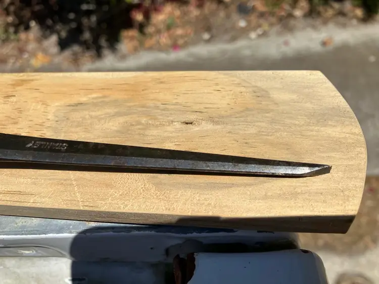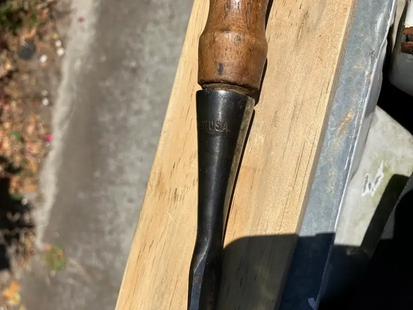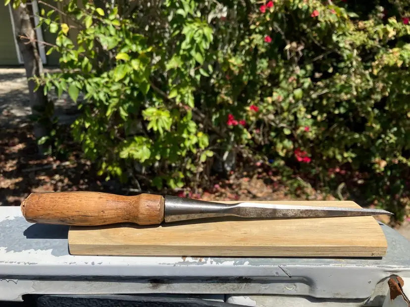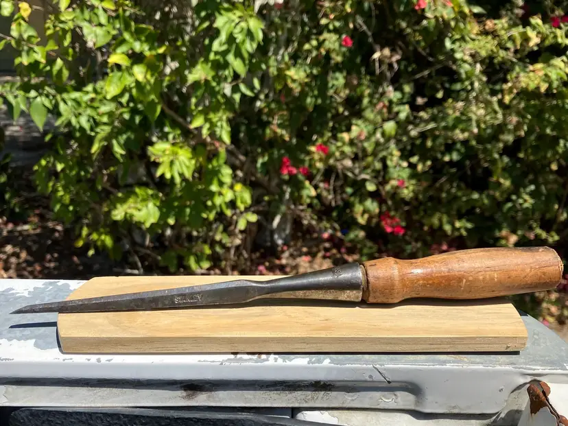 Up for grabs is a Stanley 1/8” chisel in I believe the 720 style. From the end of the socket to the tip of blade it is about 6-5/8”. Overall very good shape with some minor pitting, as pictured. Handle appears to be 720 style as well but could be repaired to add the leather washers back to the end. The 1/8” chisels are rare! Make it a part of your set today!