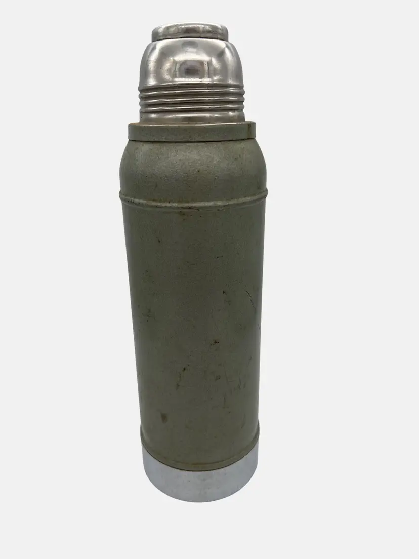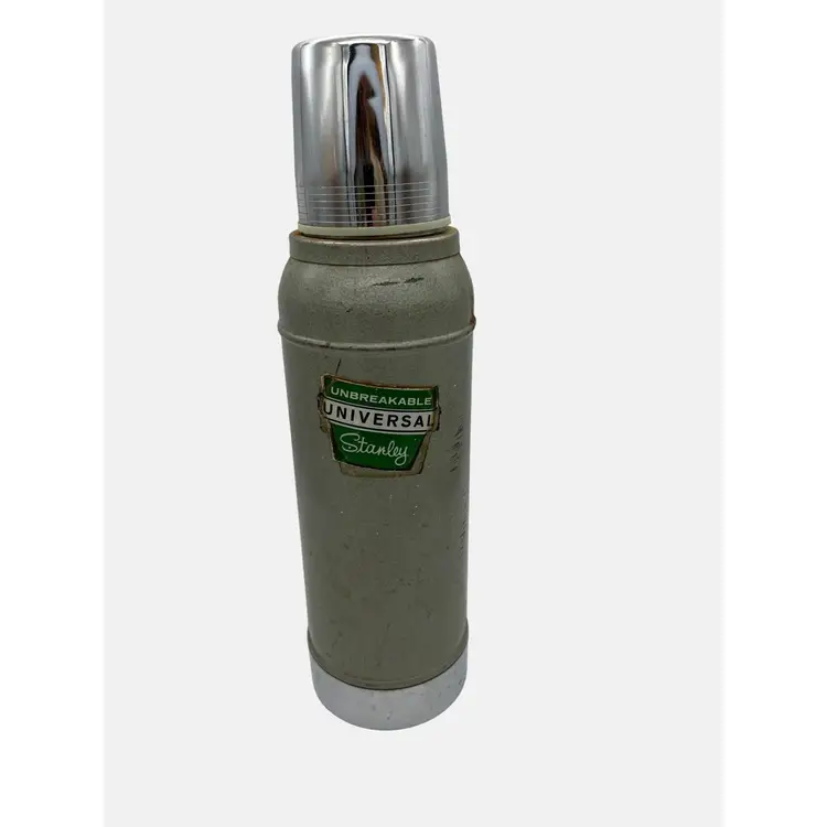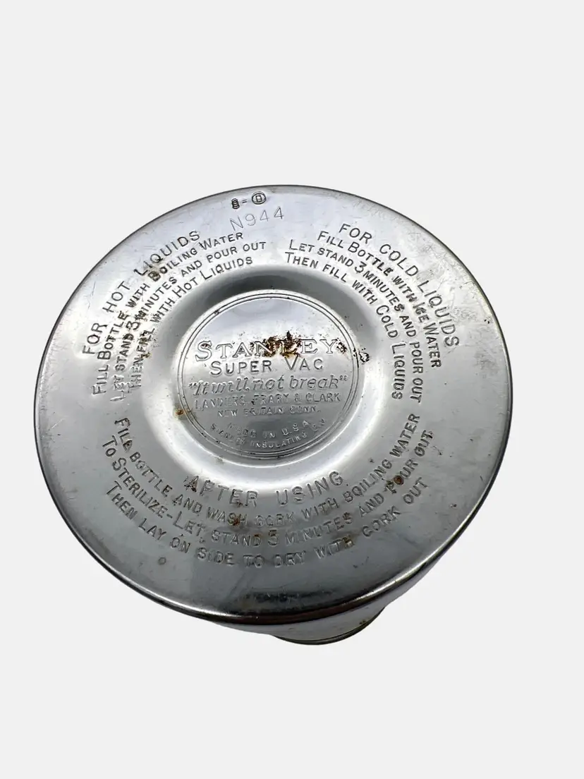 Classic Stanley N944 thermos bottle for hot or cold liquids. Durable design with cork stopper and detachable lid that doubles as a cup. The thermos is approximately 13.75" tall with the lid.