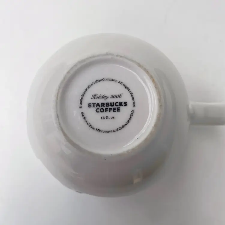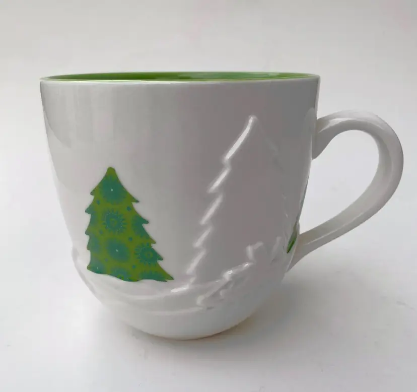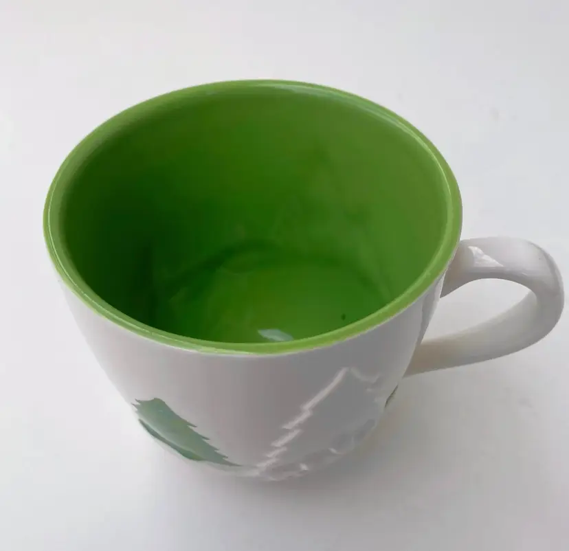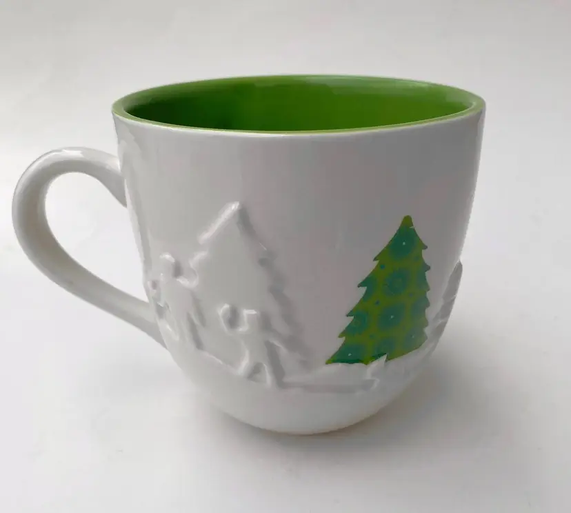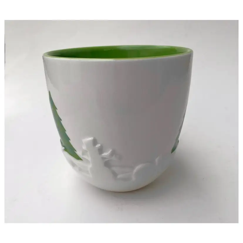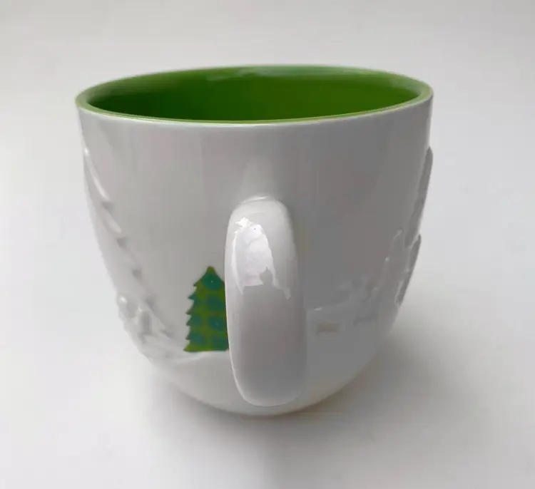 VTG 2006 Starbucks Christmas holiday coffee mug with 3D designed winter scene in green and white colors. 16oz capacity. In excellent pre-owned condition - no chips or cracks - never used. Great for the holidays.