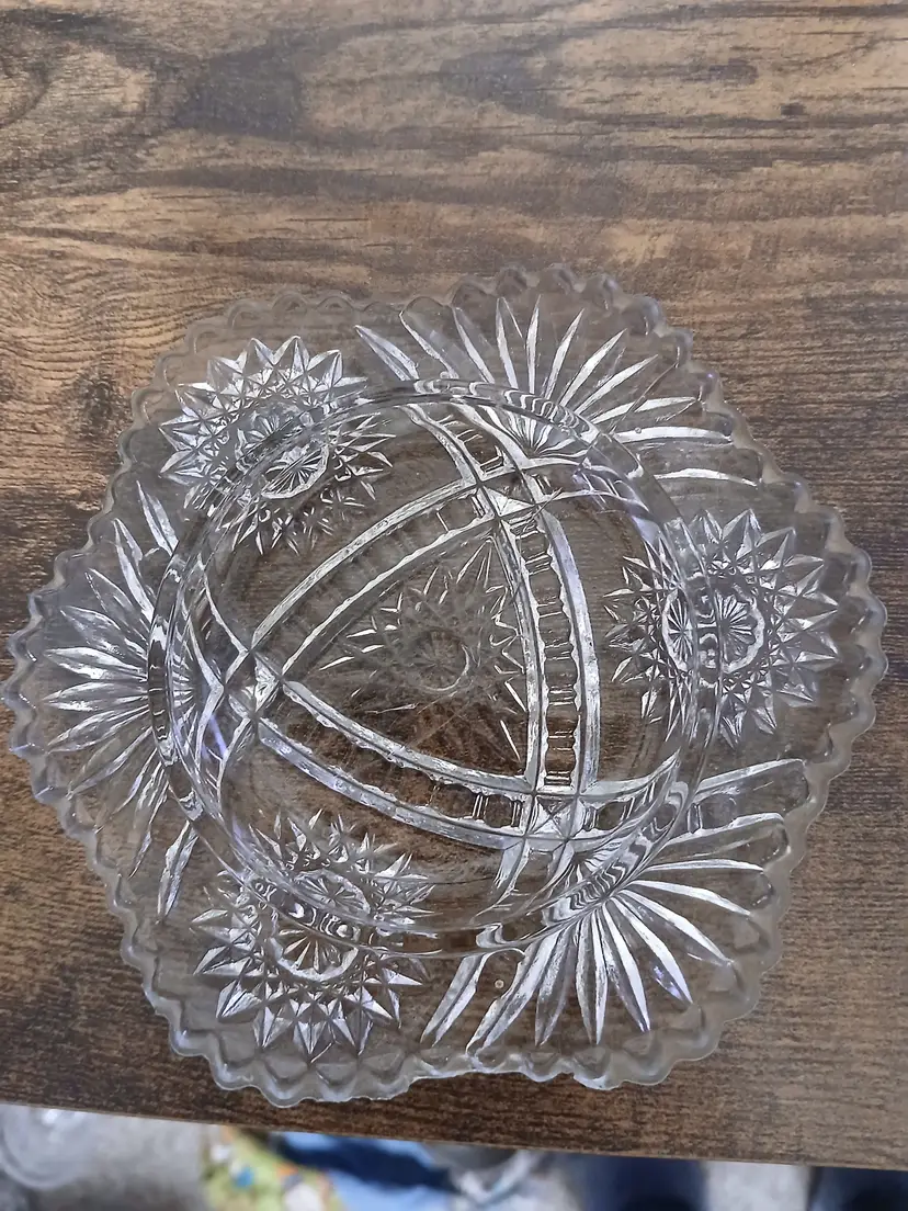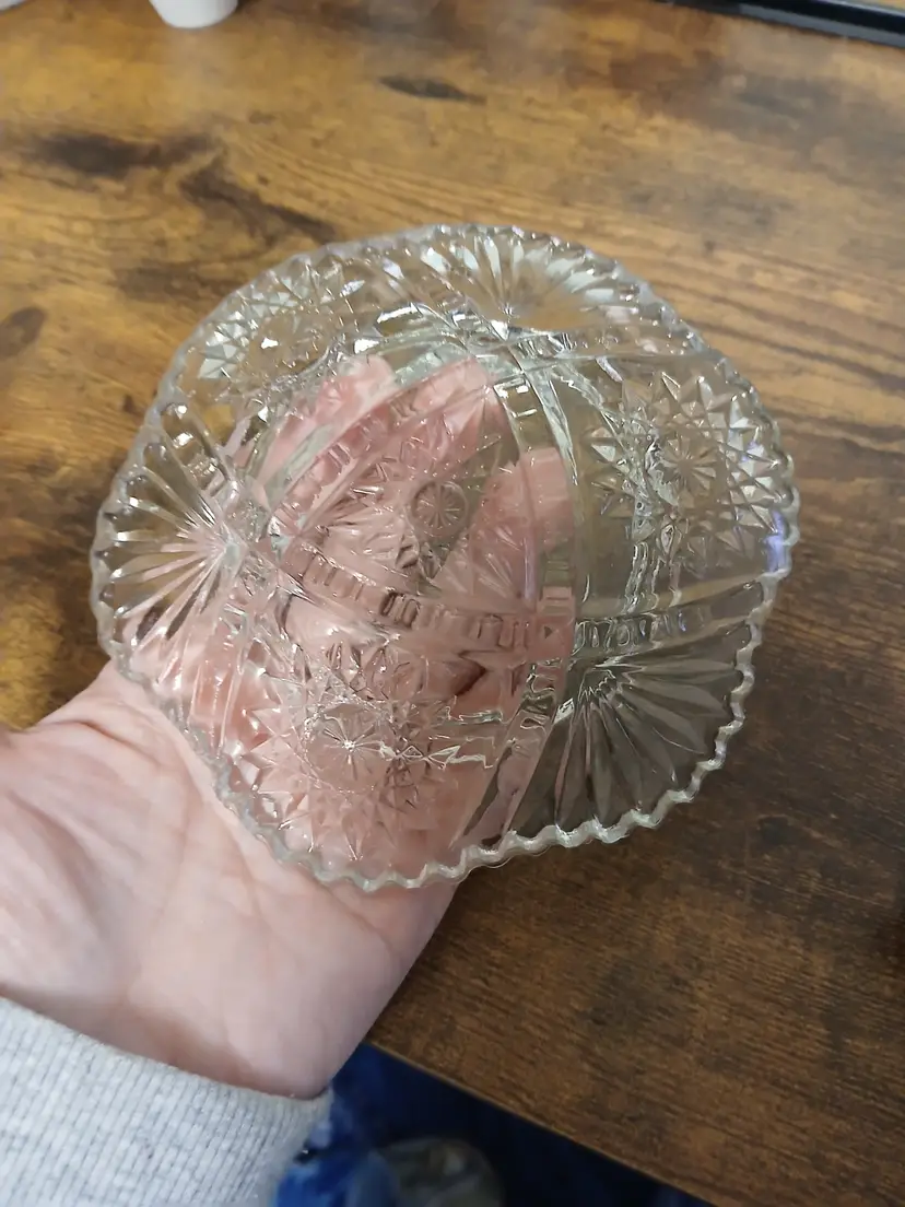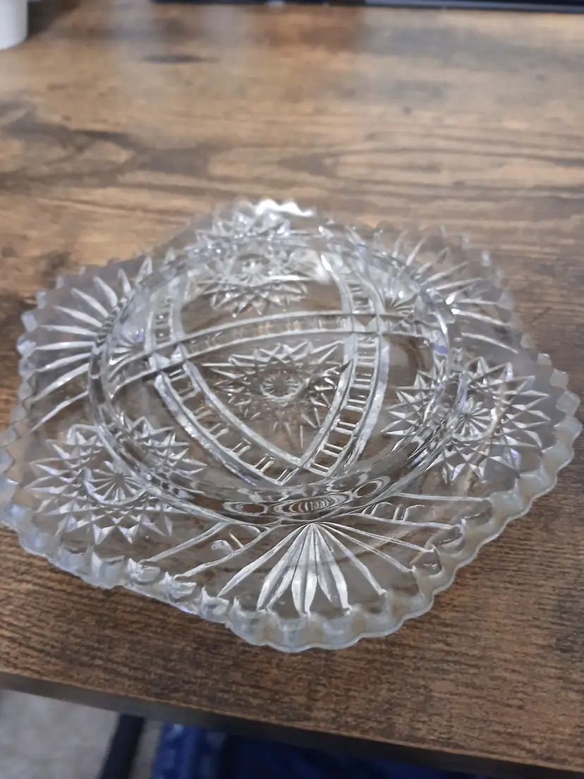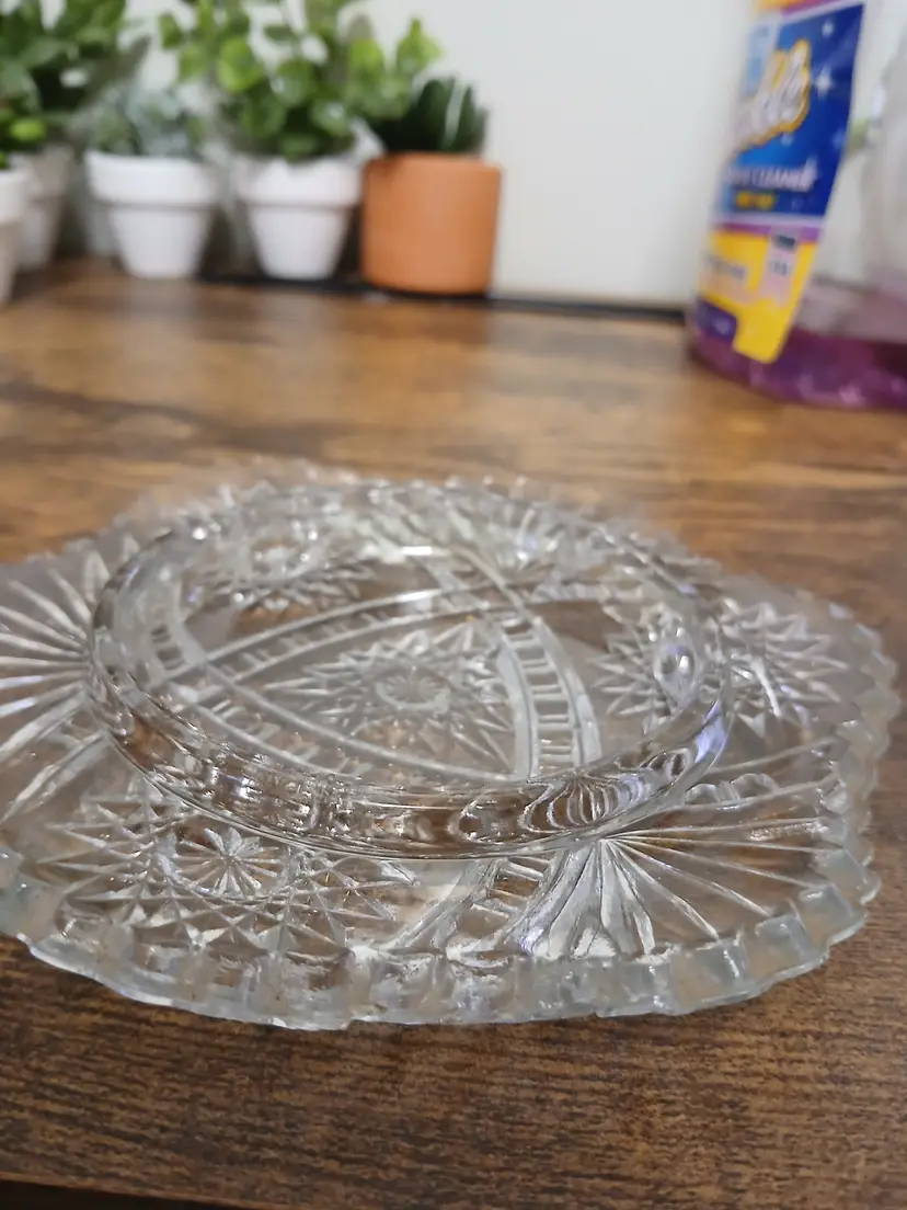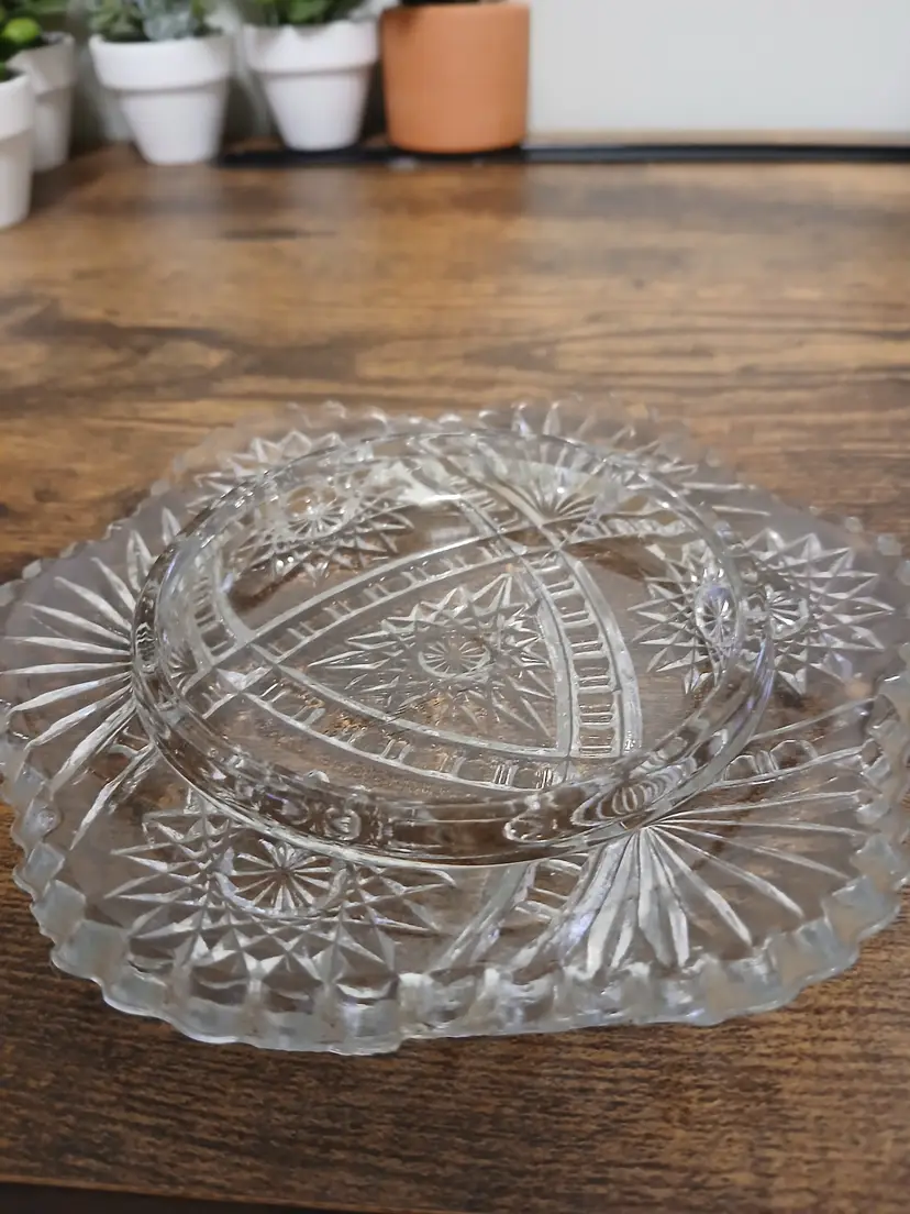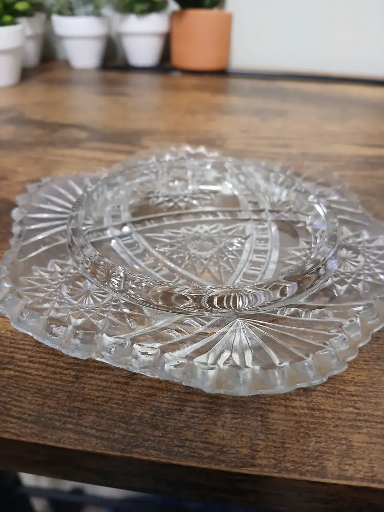 Add a touch of vintage charm to your table with this starburst-patterned glass candle plate. Perfect for showcasing your candle. Approximately 5 1/2 inches in diameter.