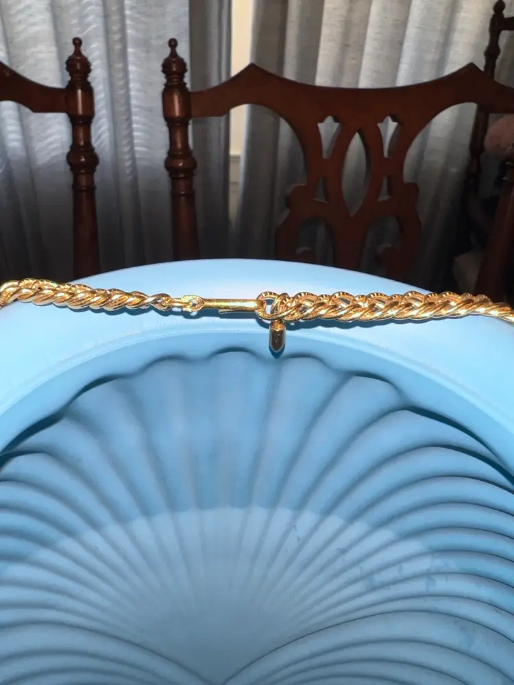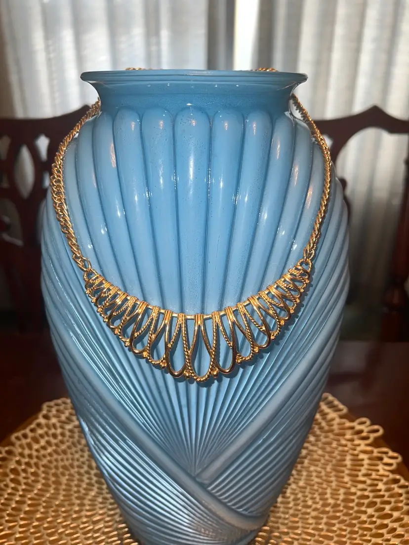 Vintage Gold Tone “bib” style necklace. Costume Jewelry. Possibly by Avon but no markings or insignias. 9” from clasp to bottom of necklace. 4” wide. Beautiful piece. Good condition. Heavy