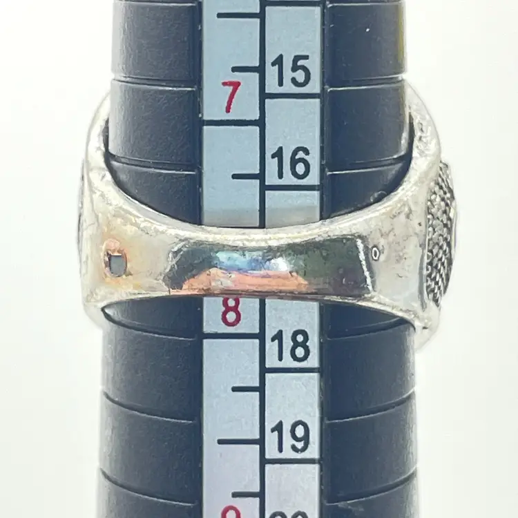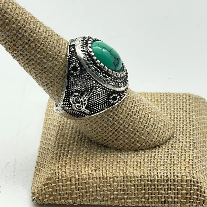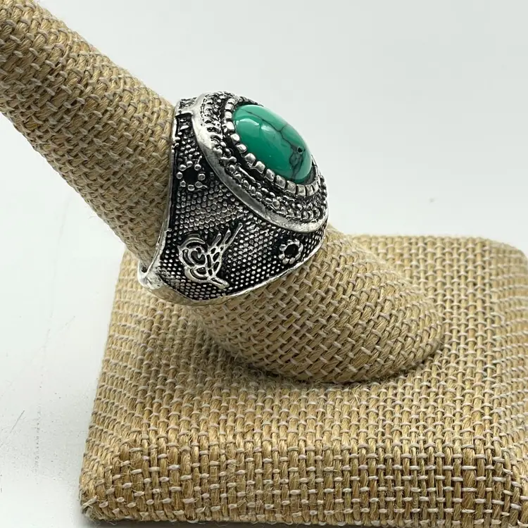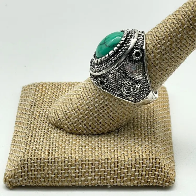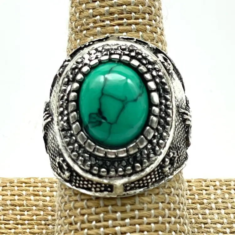 Large oval green faux turquoise stone with veining Tribal or Western-style textured silver-tone setting Size: 7.75 Unmarked base metal Chunky, eye-catching design perfect for boho or southwestern looks See photos