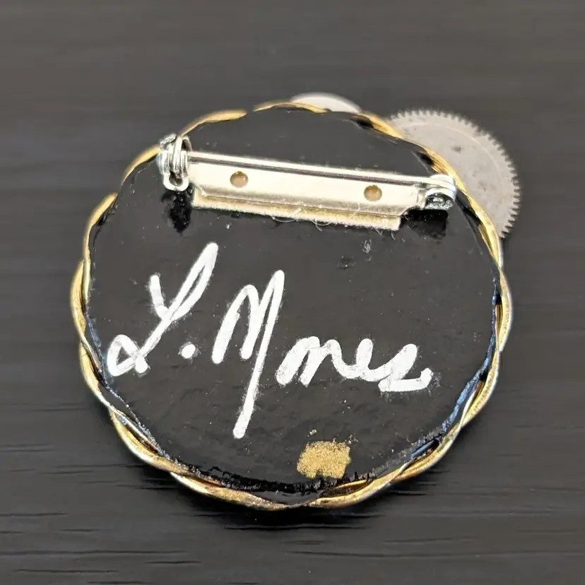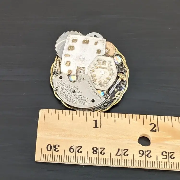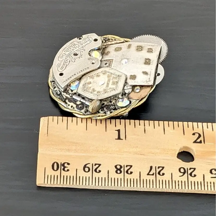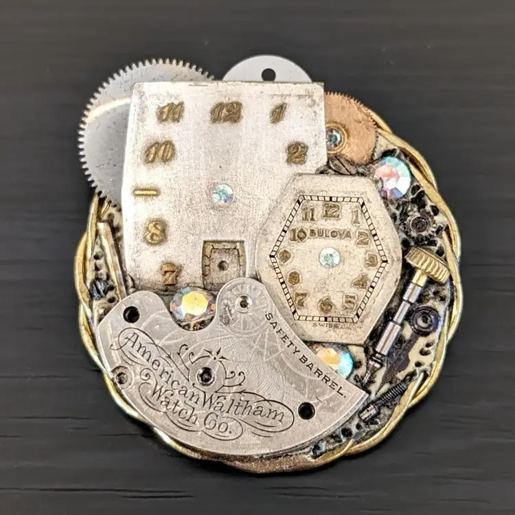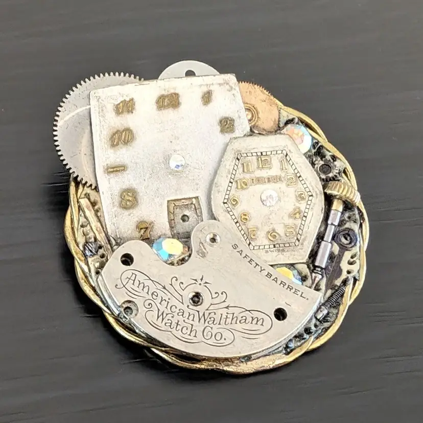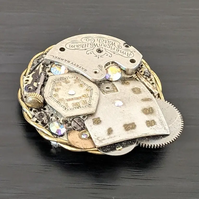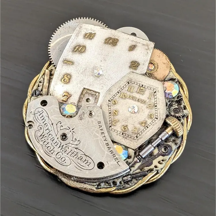 Unique pin made with watch parts and rhinestones. Contains a piece from an American Waltham Watch Co watch and Bulova watch. A great statement or display piece.