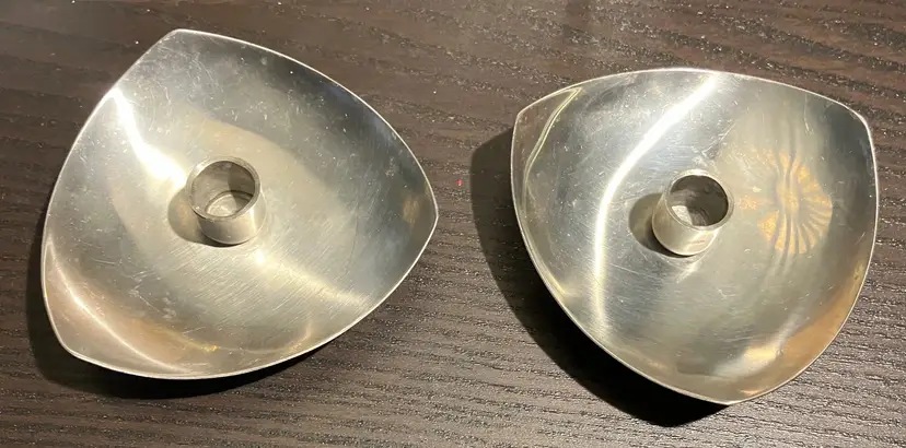 2 candleholders. Evidence of wear but no specific damage. Measurements: 3" by 3" by 3" wide. 3/4" tall.