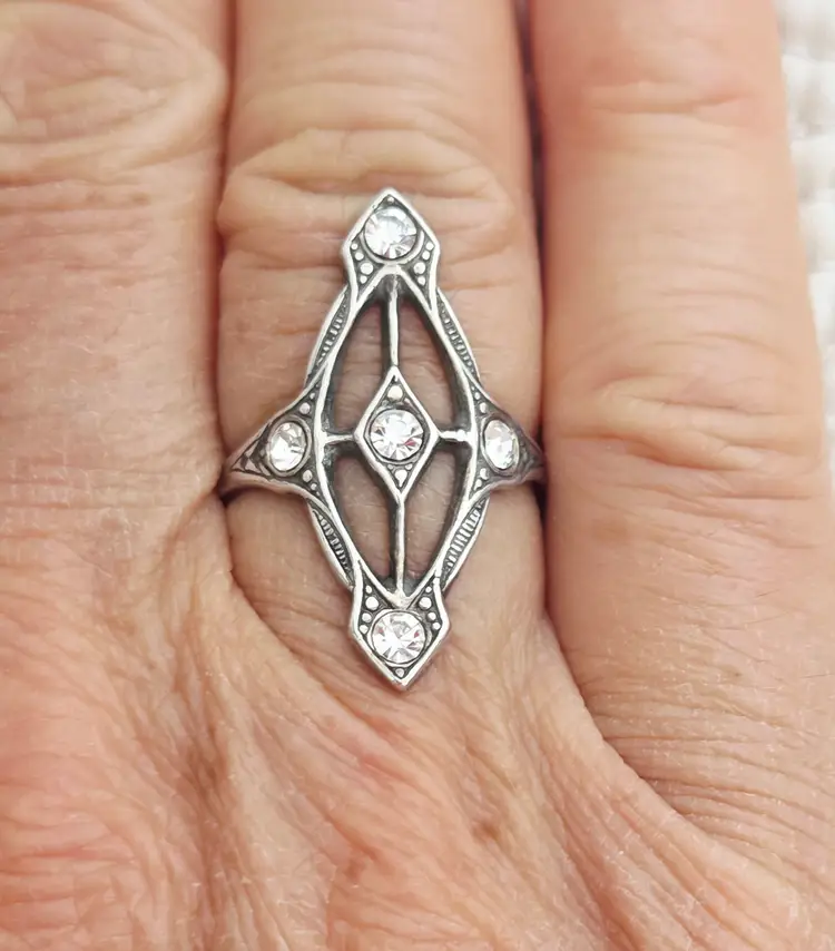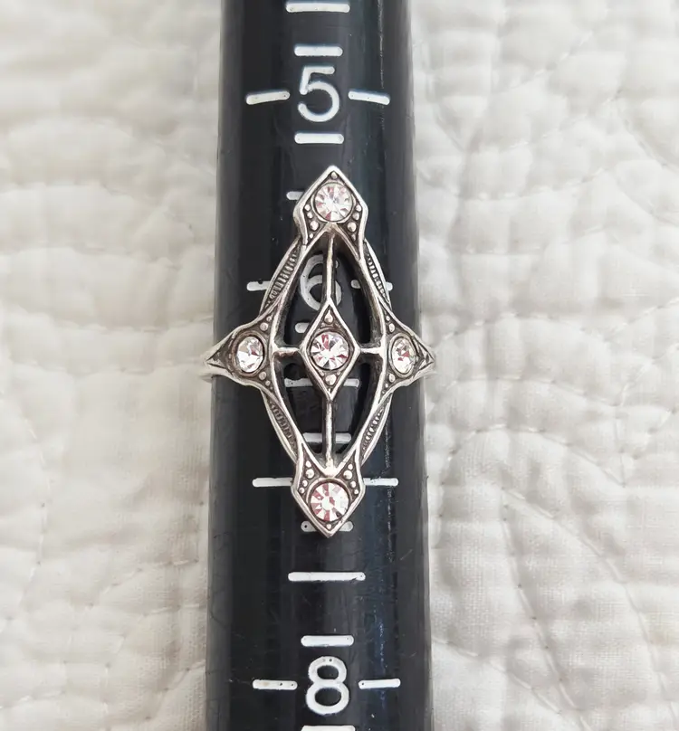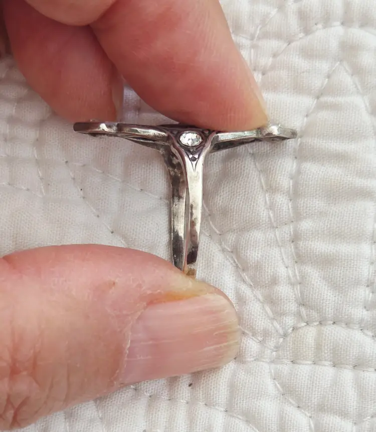 The front face of this ring is 1-1/8" long. Unmarked but acid tests as positive for Sterling silver.