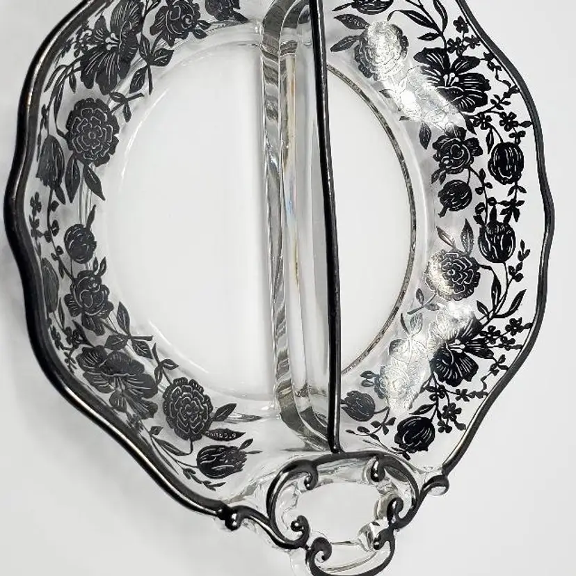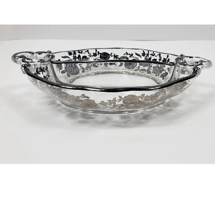 Vintage Sterling Glass Dish Divided Handles SILVER INLAY Floral 8"
