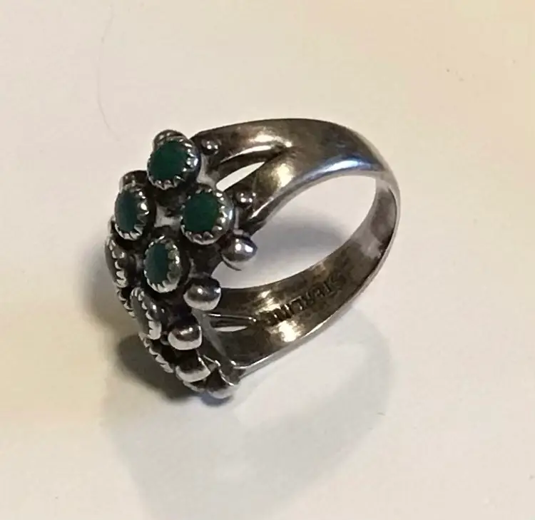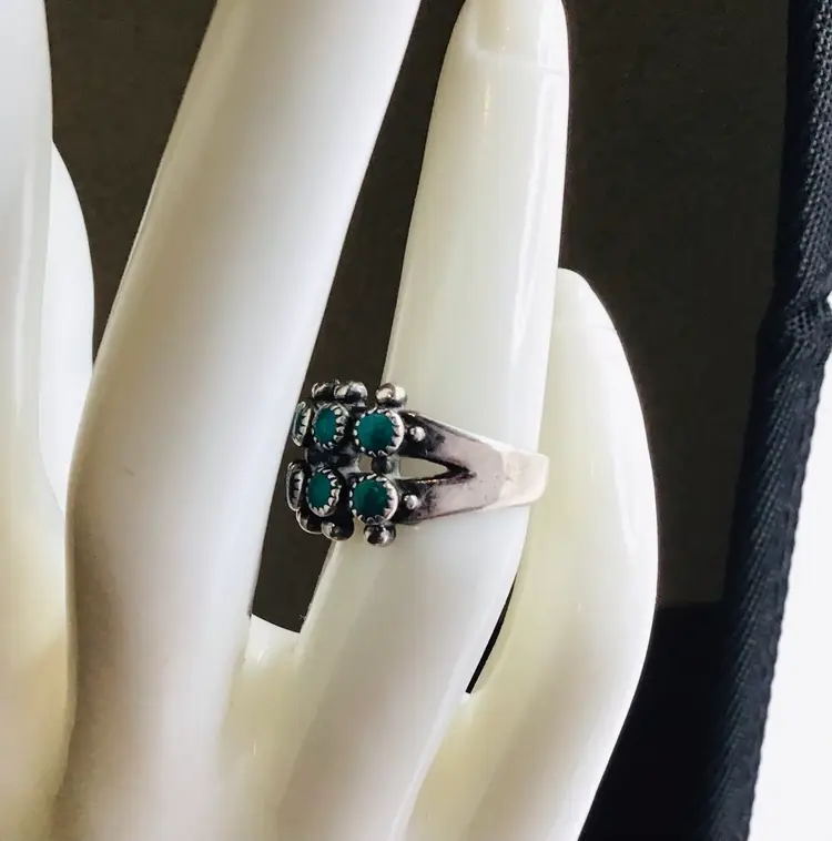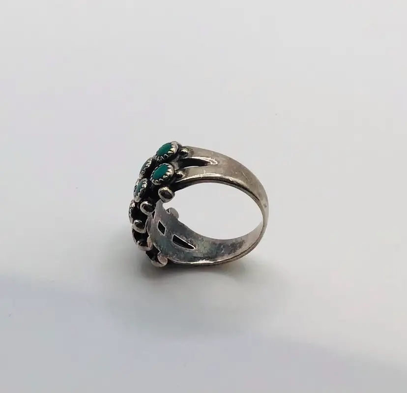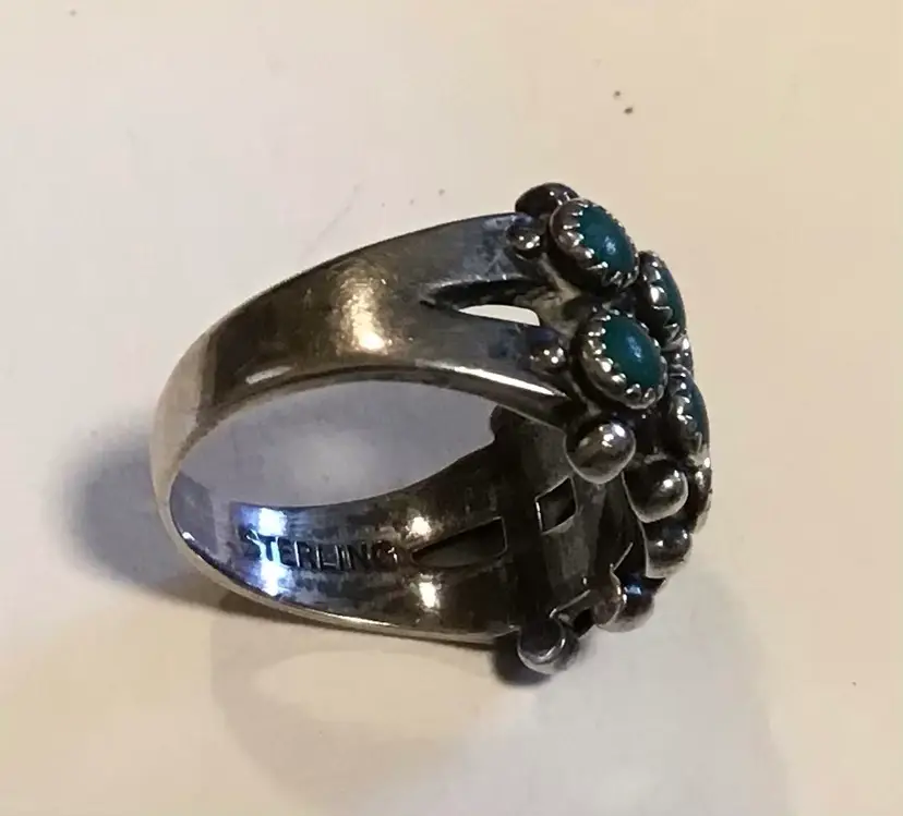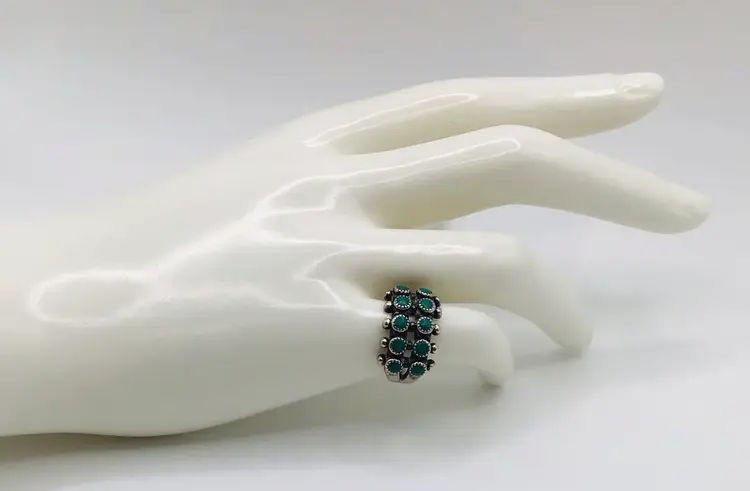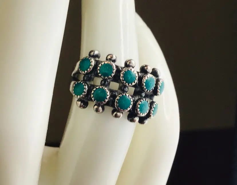 Southwestern double row snake eye design size 5-1/2. 1950s well loved, sawtooth prongs intact, in very good condition. Tested & confirmed sterling. #219