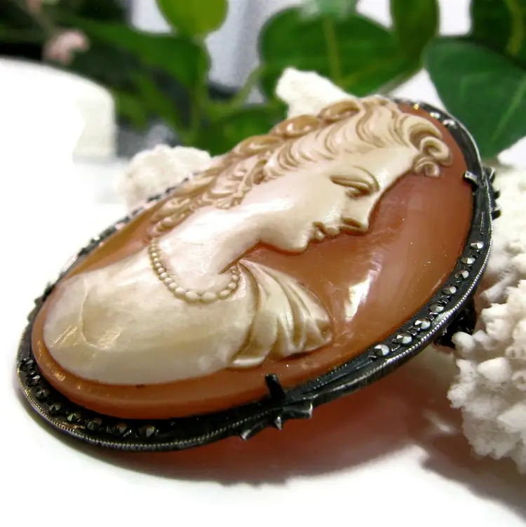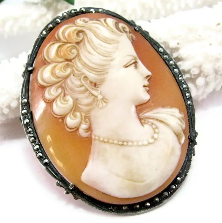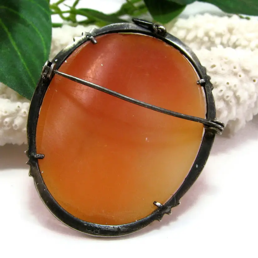 This gorgeous vintage 800 silver pin/pendant features a carved shell cameo featuring a carved lady.