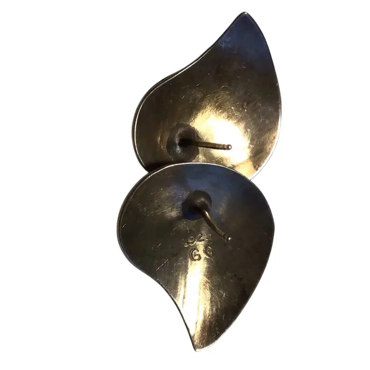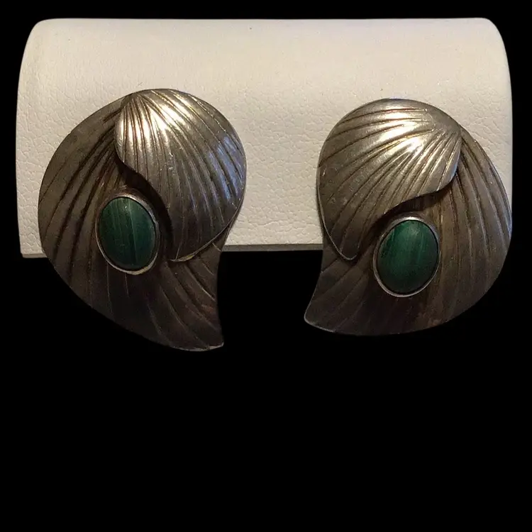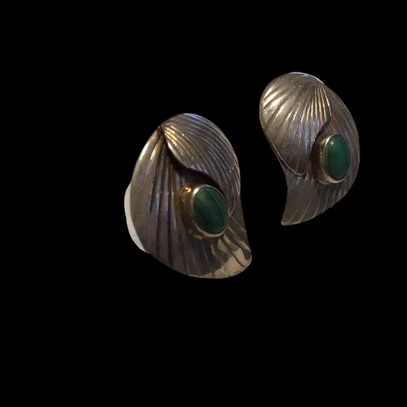 ‘Gertie Ganadonegro’ Navajo 1-1/4”x 3/4” leaf with malachite cabochon, marked 925 GG. Tested & confirmed sterling. #454