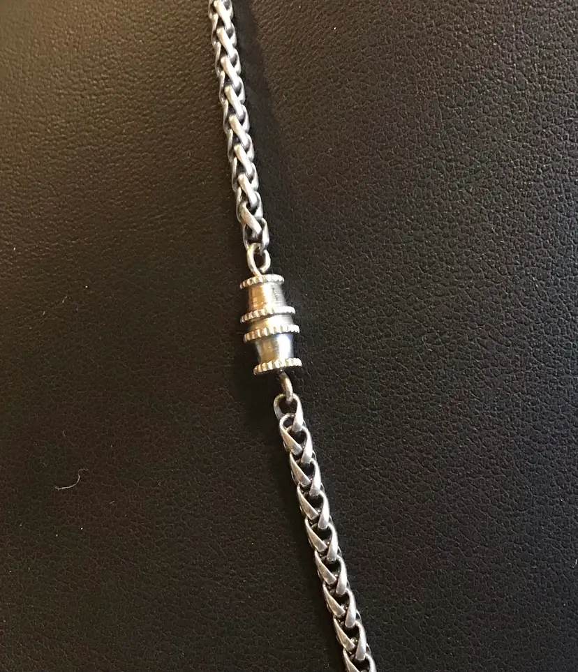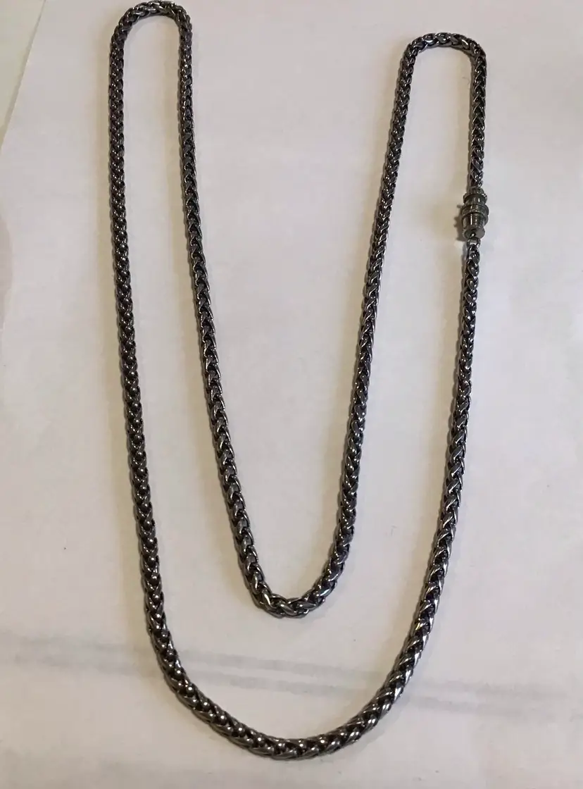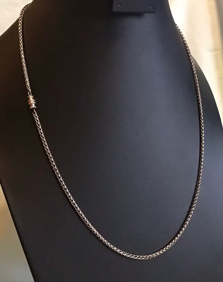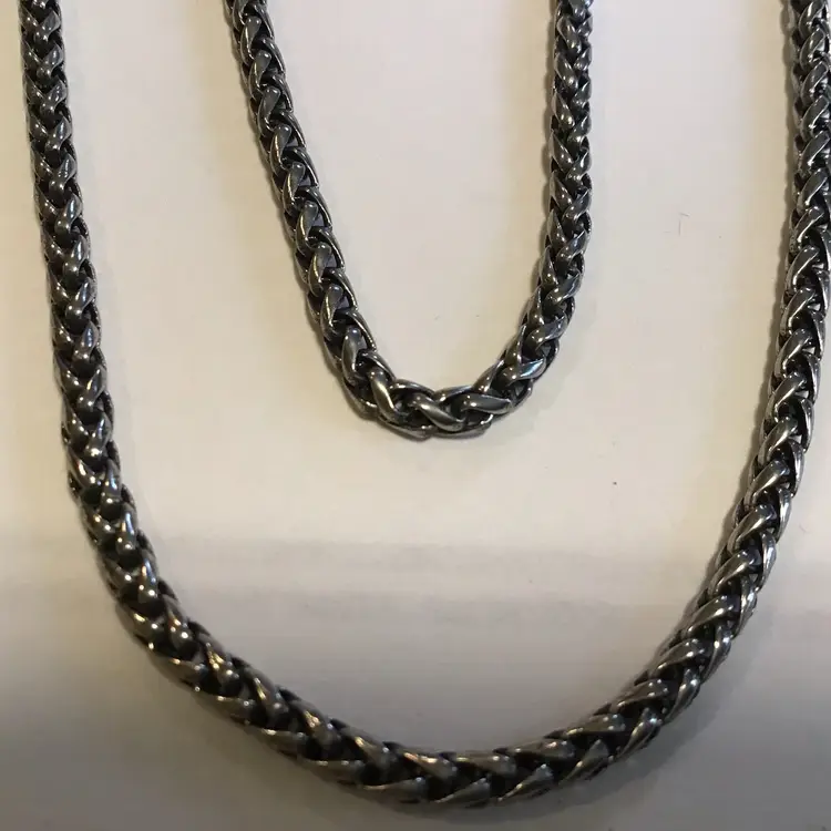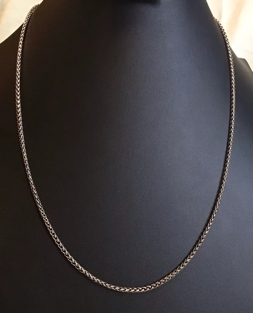 25” Wheat chain link 3mm, unisex, barrel clasp is not original. Natural patina. #660