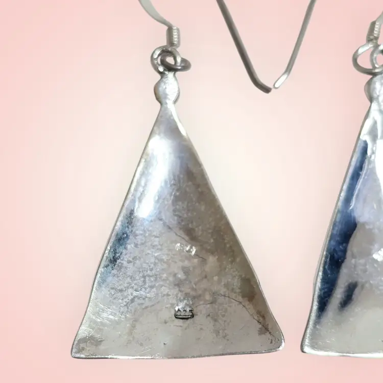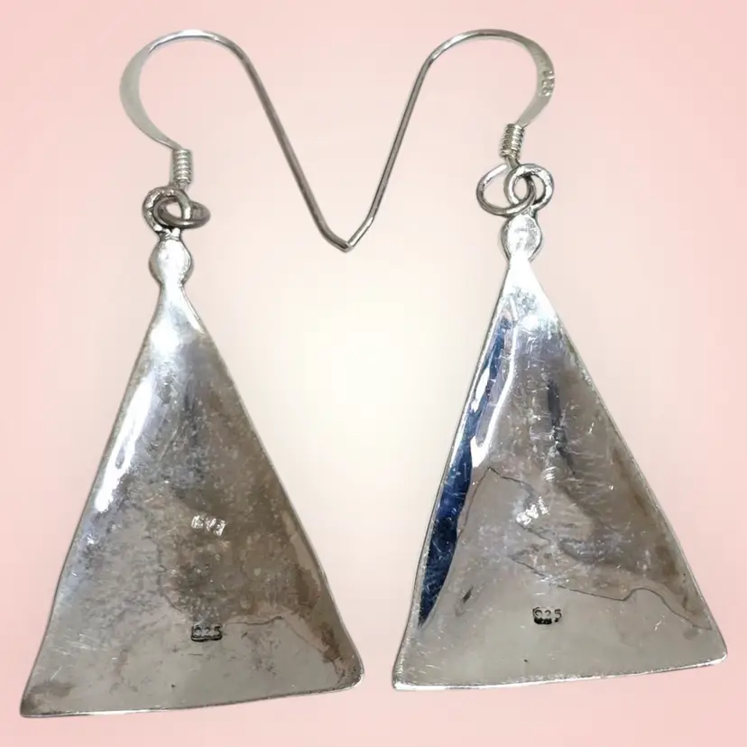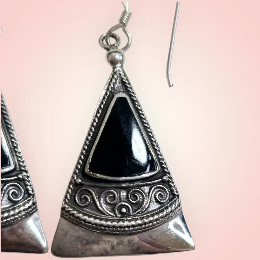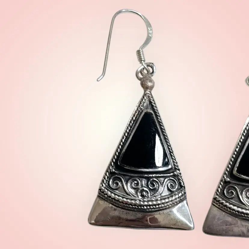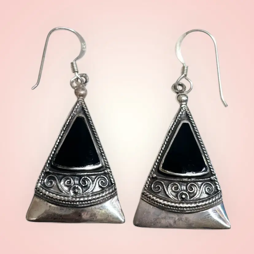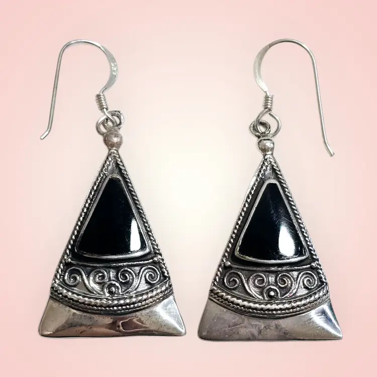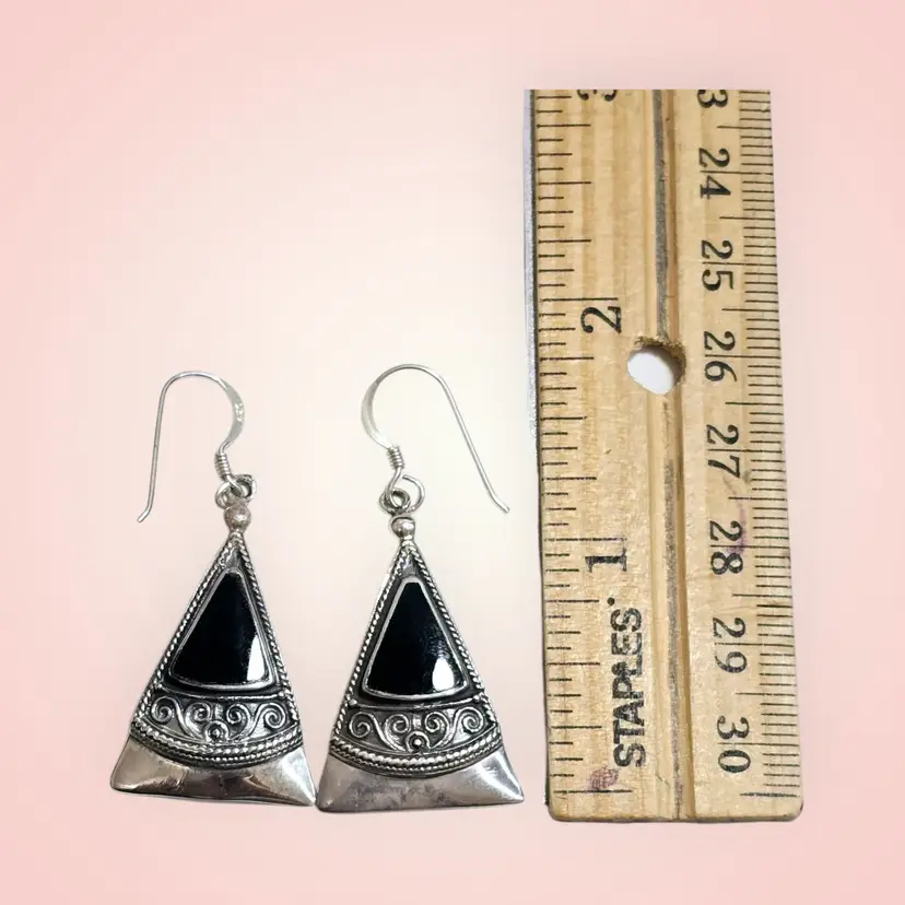 Vintage Sterling Silver 925 Black Onyx Triangle Dangle Earrings