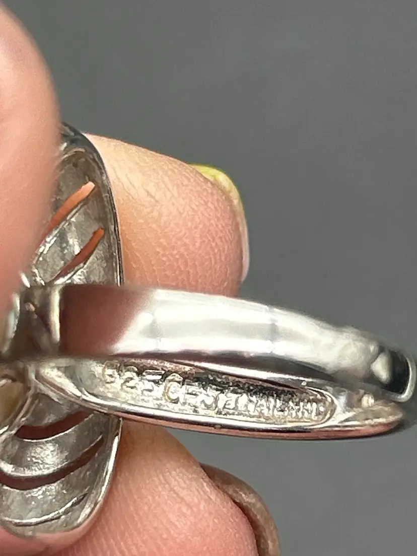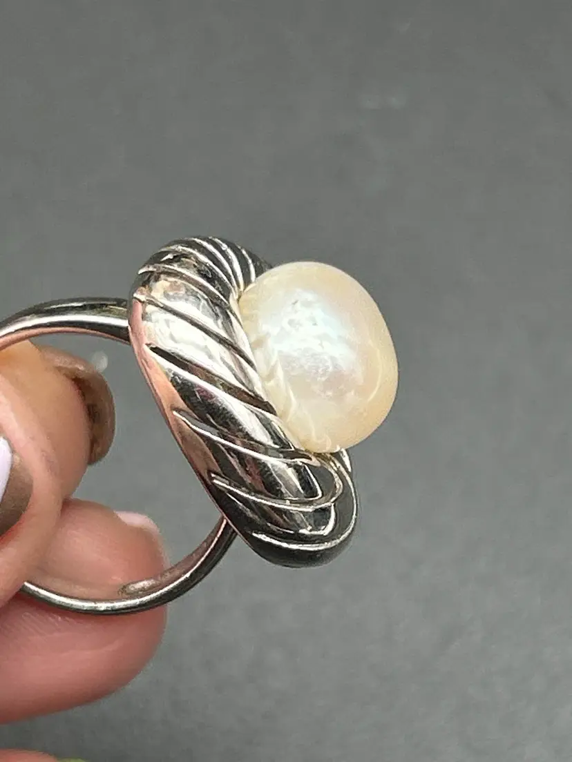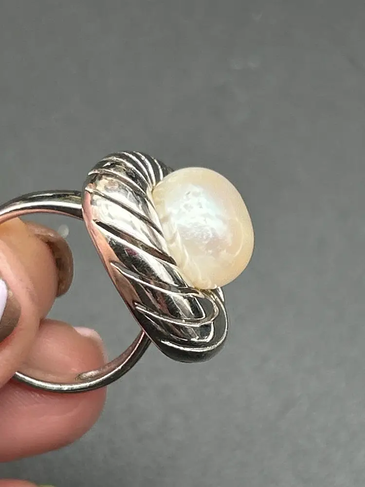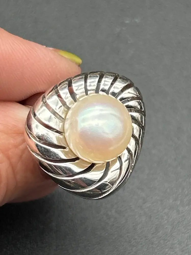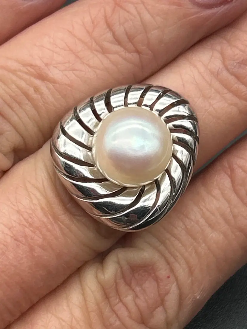 Notable Details: • Size: 7 • Metal: Stamped 925 Sterling Silver (CFJ Thailand hallmark) • Stone: Mabe Pearl – luminous with natural luster and subtle iridescence • Setting: Bold sculptural swirl design • Era: Vintage • Condition: Excellent vintage condition with minimal wear