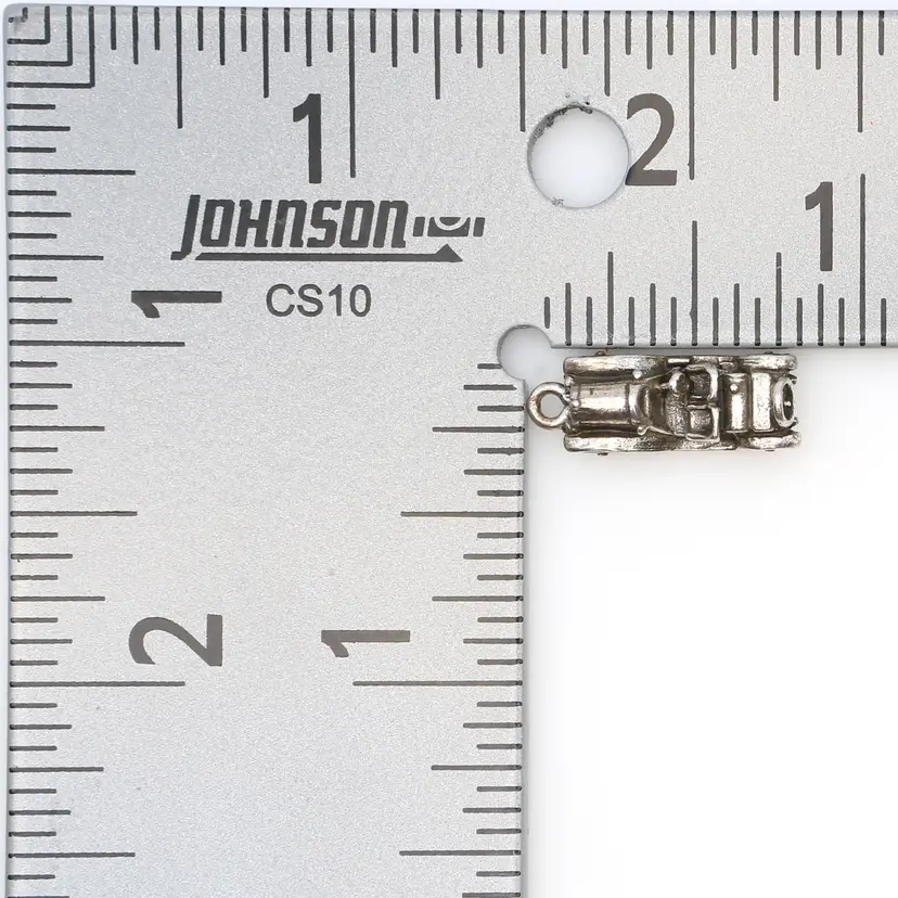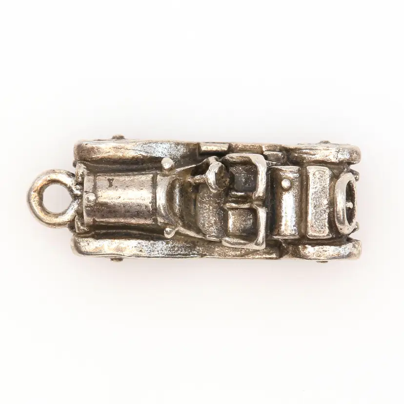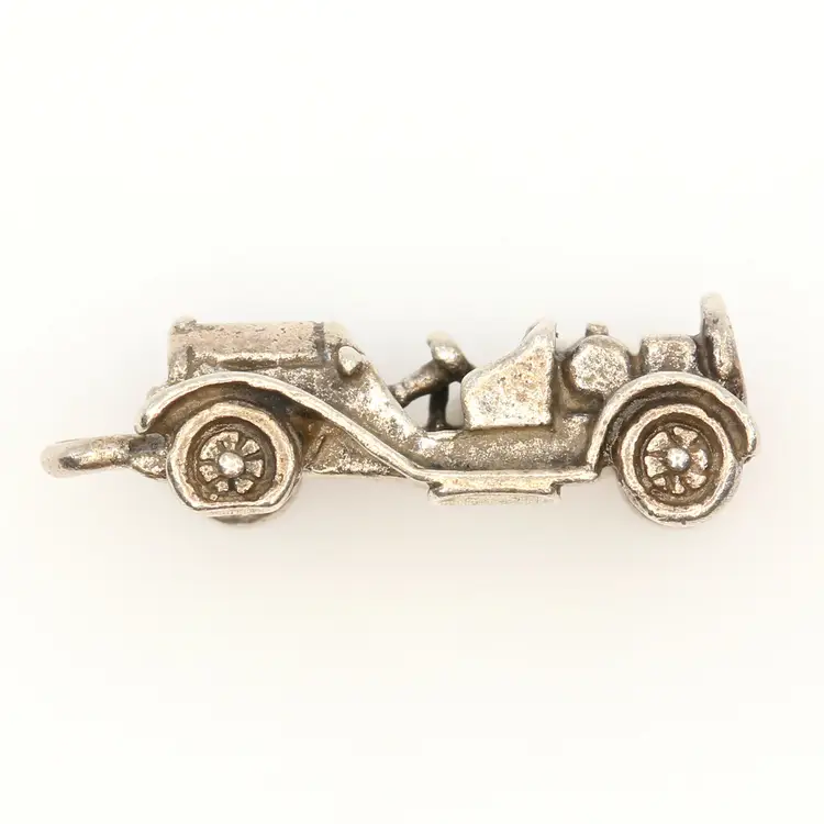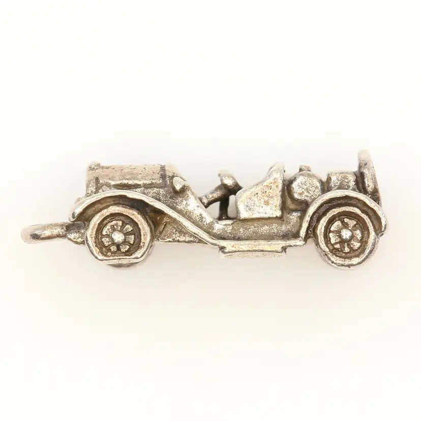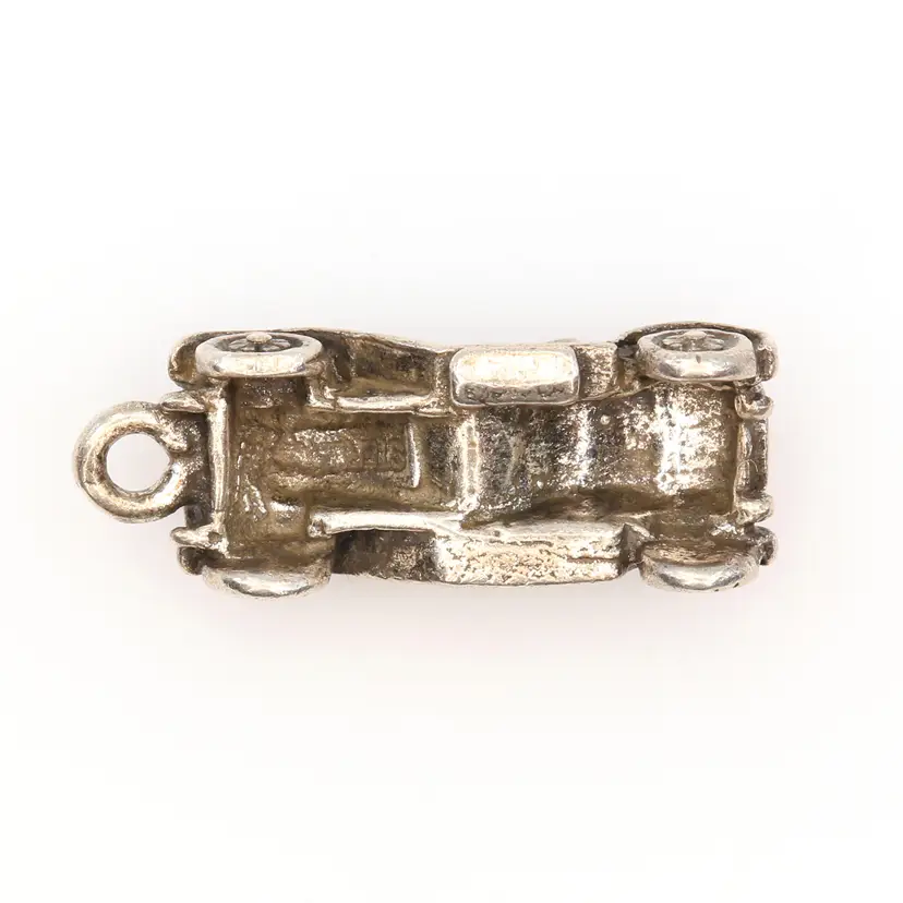This vintage sterling silver roadster car charm is a delightful miniature of a classic two-seater car. The charm features many details, including running boards on the sides, luggage behind the seats, narrow tires, and a spare tire at the back. Perfect for classic car enthusiasts, this charm captures the nostalgia of vintage roadsters. A great addition to any charm bracelet or a thoughtful gift for collectors of classic car memorabilia and vintage jewelry.