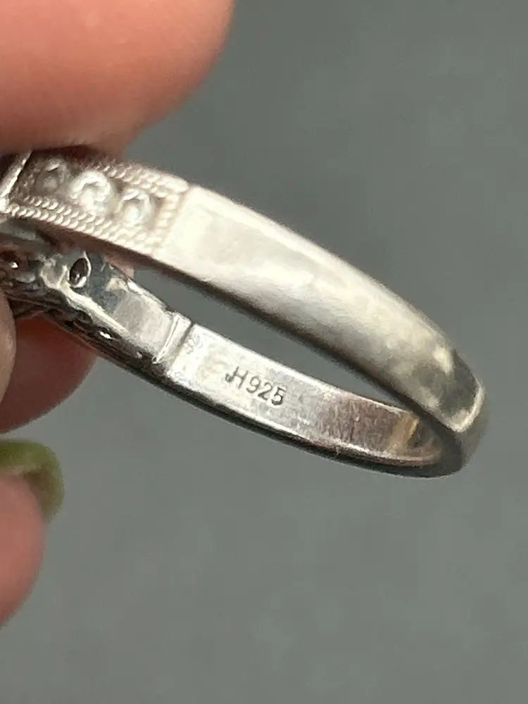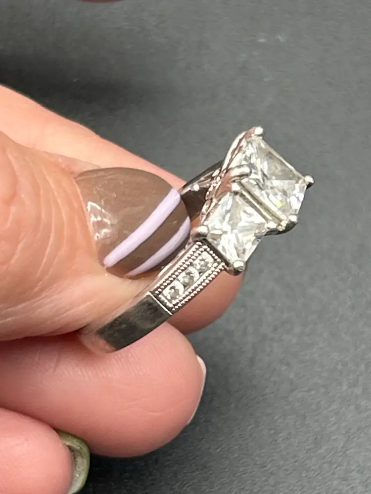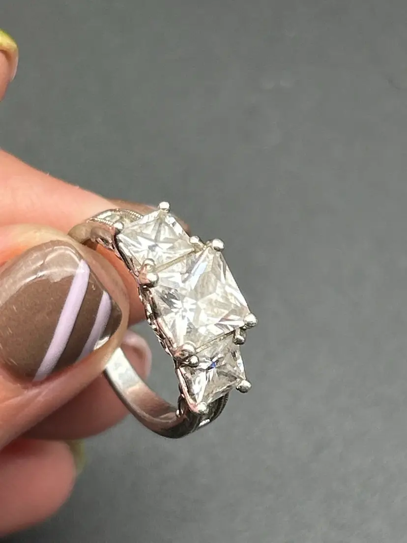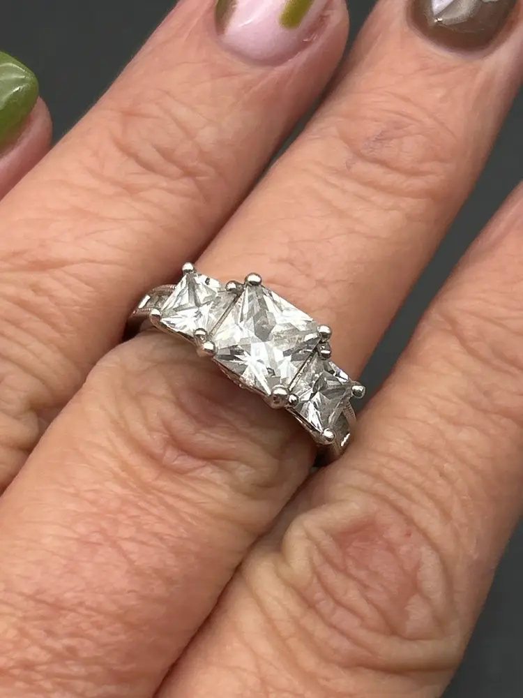 Notable Details: • Marked J 925 (sterling silver) • Size: 6.75 • Stones: Princess-cut clear cubic zirconia (center stone approx. 7–8mm) • Classic three-stone setting with decorative gallery and side detailing • Secure prong setting for lasting wear • Vintage design with timeless appeal