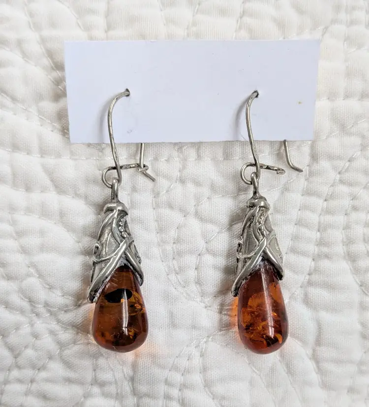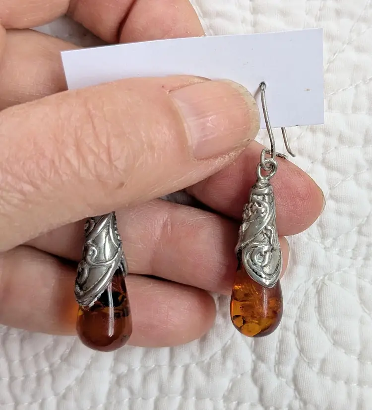 2" long. Pierced, with earring wire. Unmarked but acid tests positive as sterling silver.