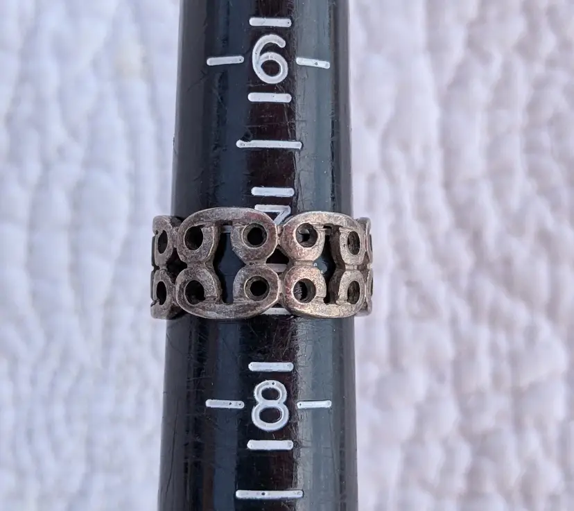 This band is 3/8" wide. Unmarked but acid tests as positive for sterling silver.