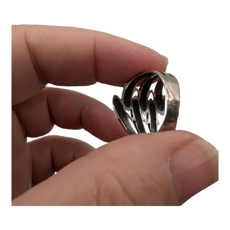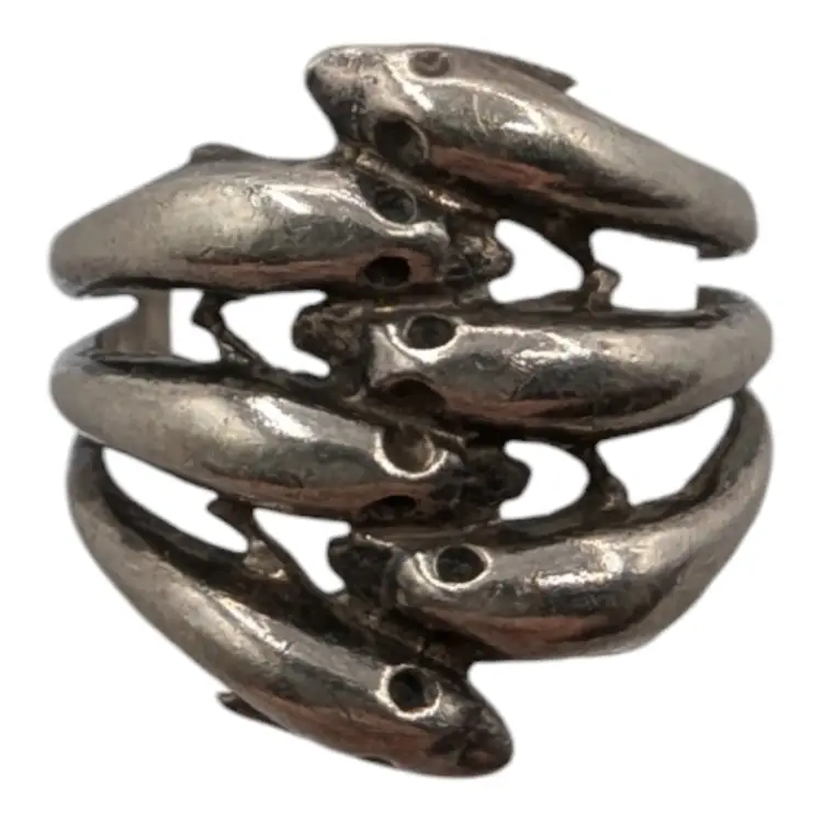Add a touch of edgy elegance to your collection with this vintage sterling silver dolphin wrap ring. The intricate design features multiple dolphin coiled around your finger, making it a standout accessory. Ideal for any occasion or as a statement piece in your everyday wear. Please see all photos for condition and size.