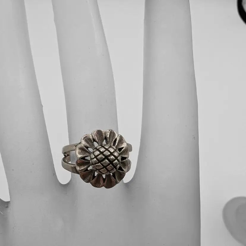 Add a touch of vintage charm to your collection with this beautiful sterling silver floral ring. The intricate design and timeless appeal make it a perfect accessory for any occasion. Ideal for those who appreciate unique and classic jewelry pieces. • Sterling silver • Floral design • Intricate detailing Size 5.5- band has been cut