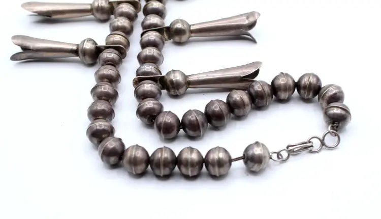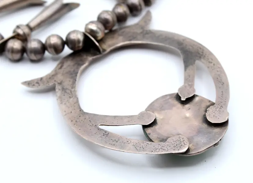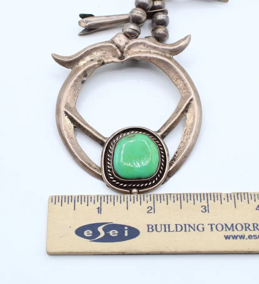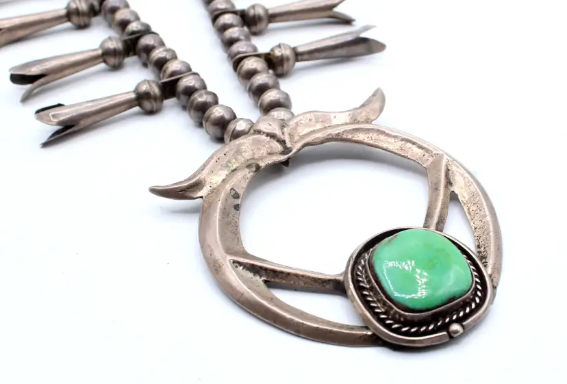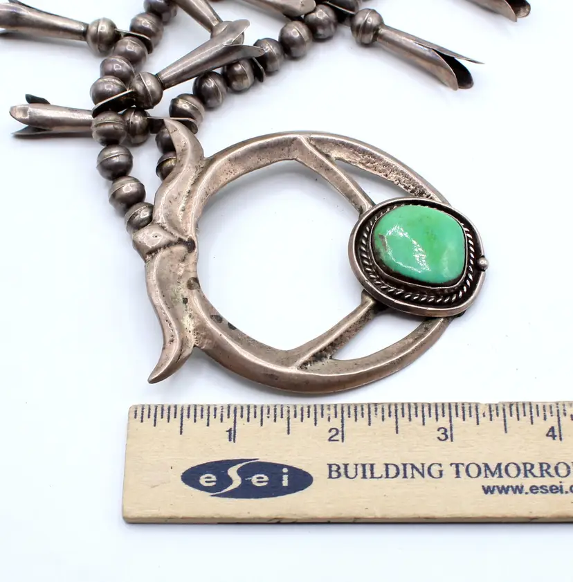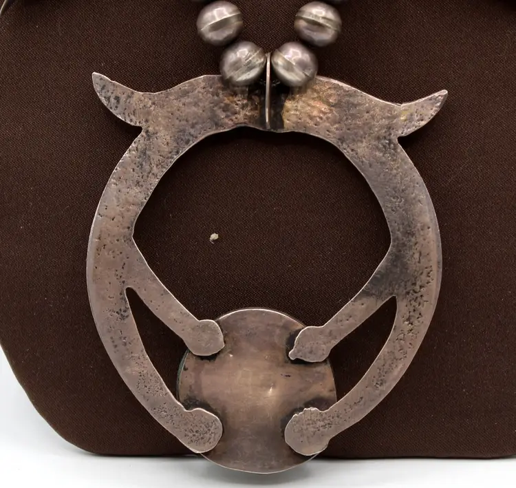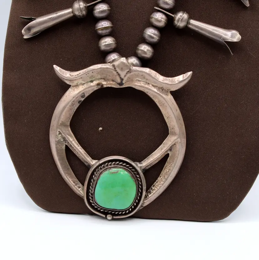 Amazing unsigned Naja necklace. This piece has 9.96 mm silver handmade beads and squash blossoms, strung on a foxtail chain with a hook closure. The Naja is a closed circle with a beautiful large green turquoise stone set in a smooth bezel and adorned with twisted wire. The Naja measures 3.5" x 3" and the stone 22.57 mm x 22.14 mm. Some minor dings and dents.