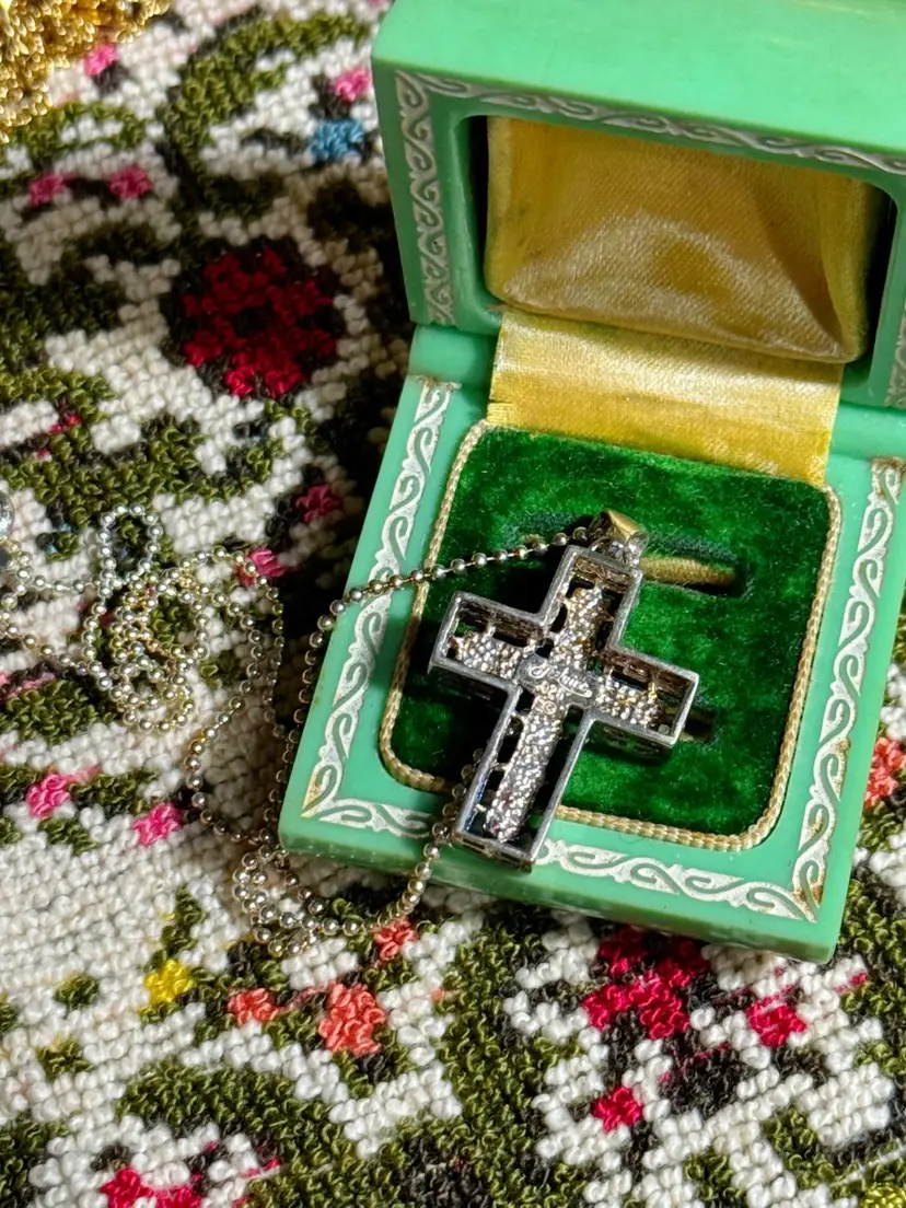 Cross is 1” long And the chain is 19” long The end rhinestone has a gold ring around it.