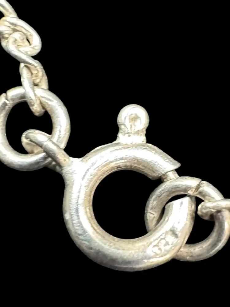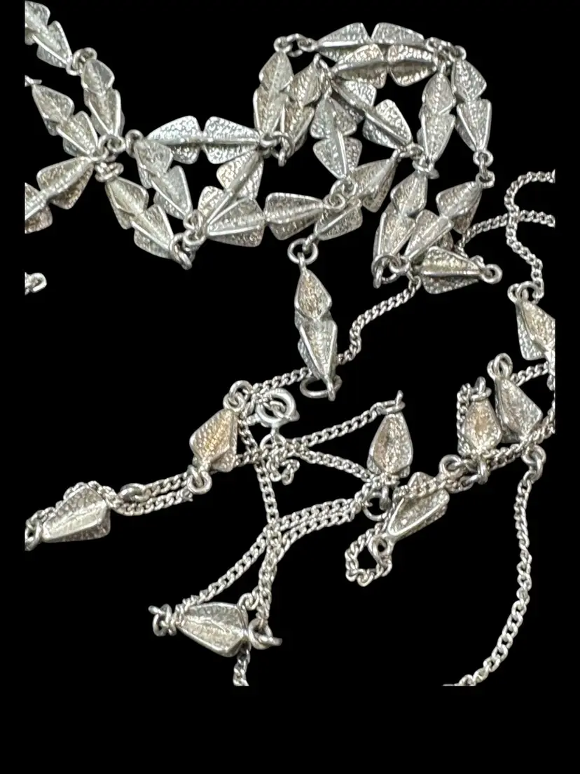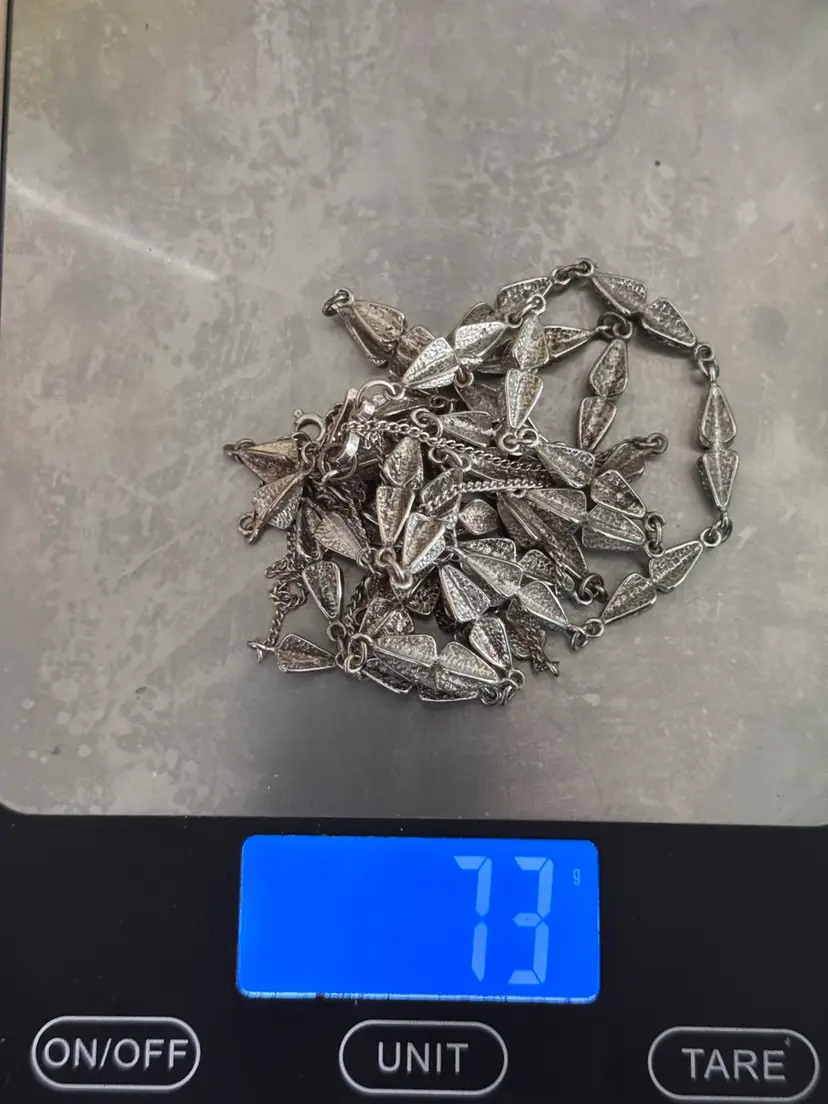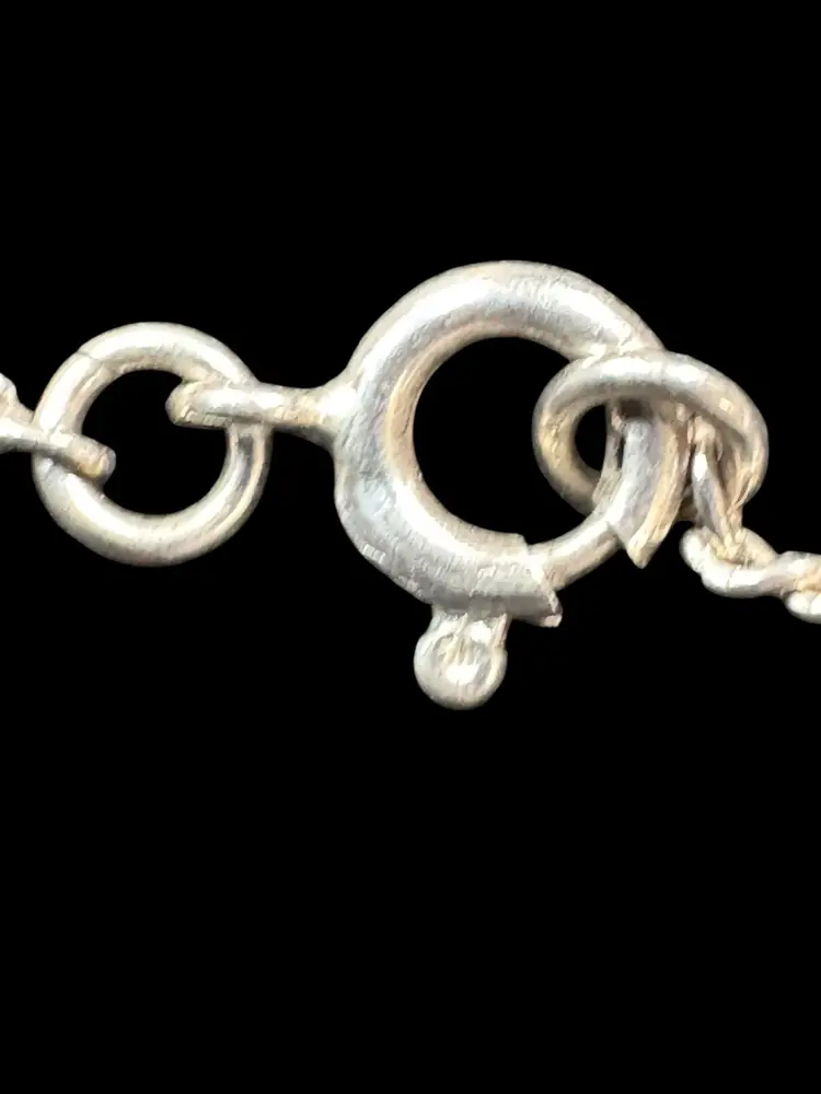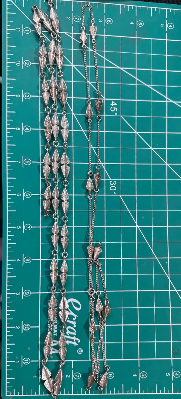 2 chain necklaces have been tested twice for metal purity - they weigh 73 grams collectively. The 30” necklace has a hook closure and weighs 56 grams. The 32” necklace has a spring ring clasp weighs 16 grams. Both are stamped 925. Wear tighter or separately.