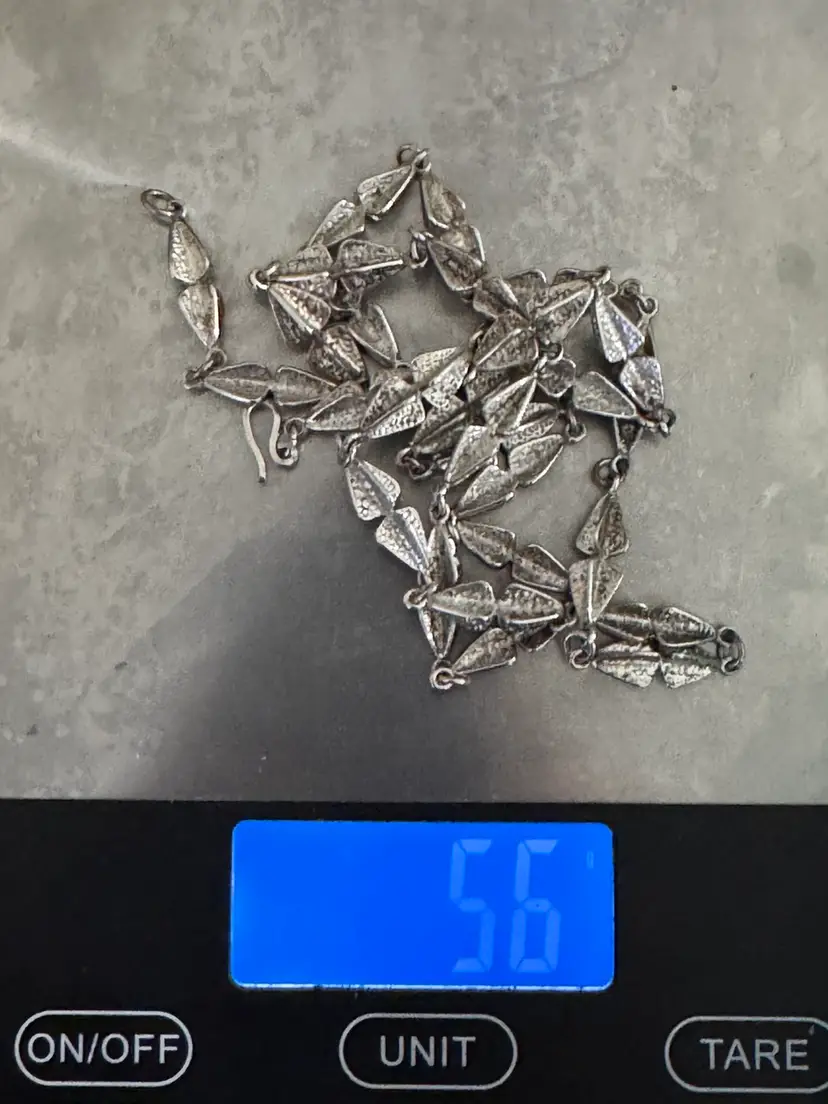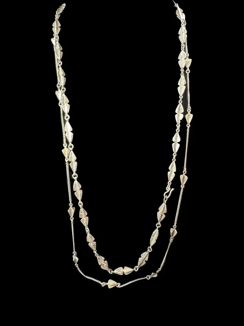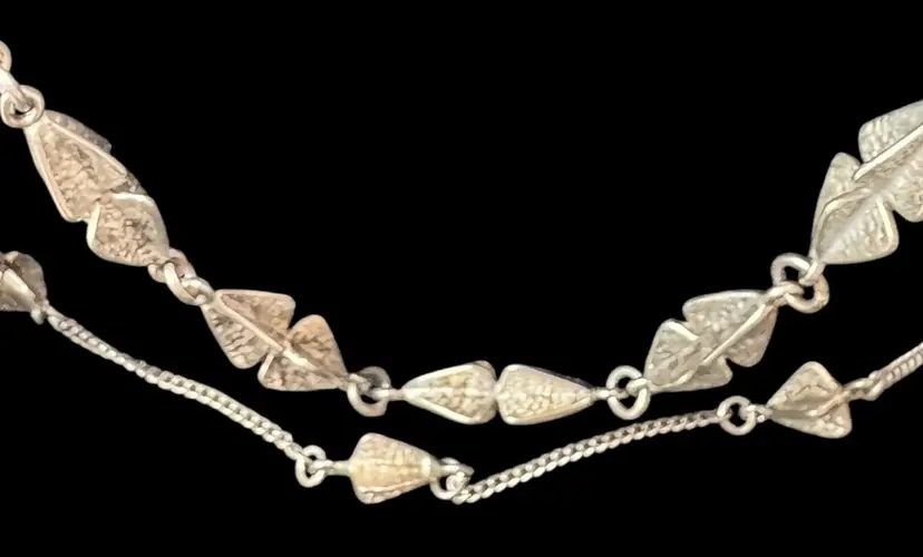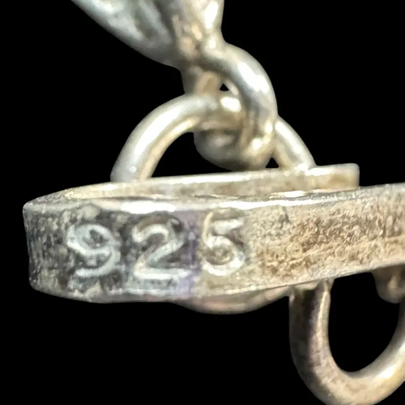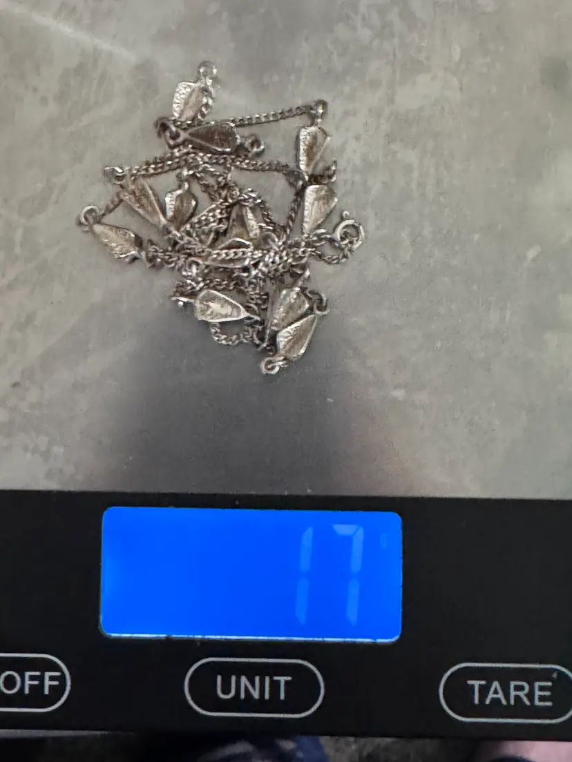 2 chain necklaces have been tested twice for metal purity - they weigh 73 grams collectively. The 30” necklace has a hook closure and weighs 56 grams. The 32” necklace has a spring ring clasp weighs 16 grams. Both are stamped 925. Wear tighter or separately.