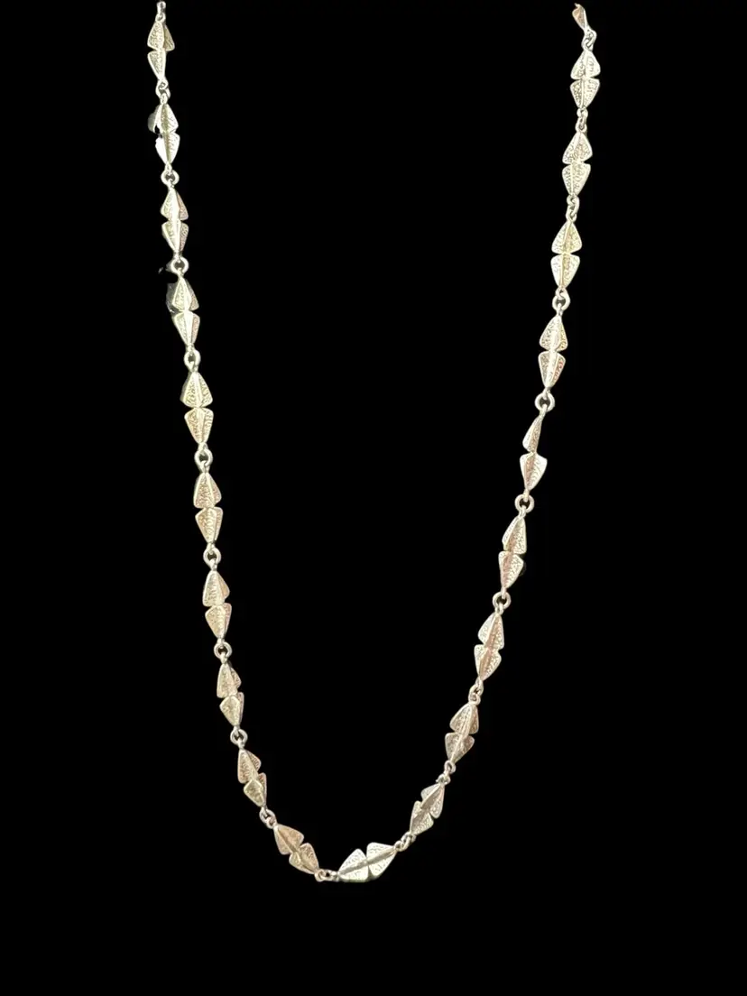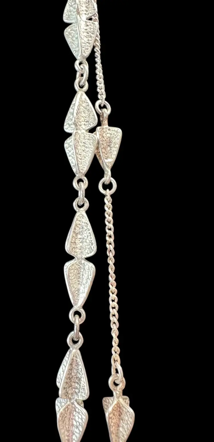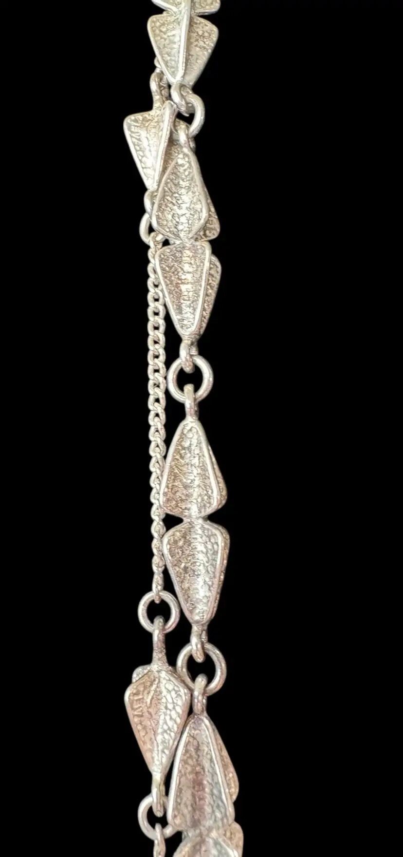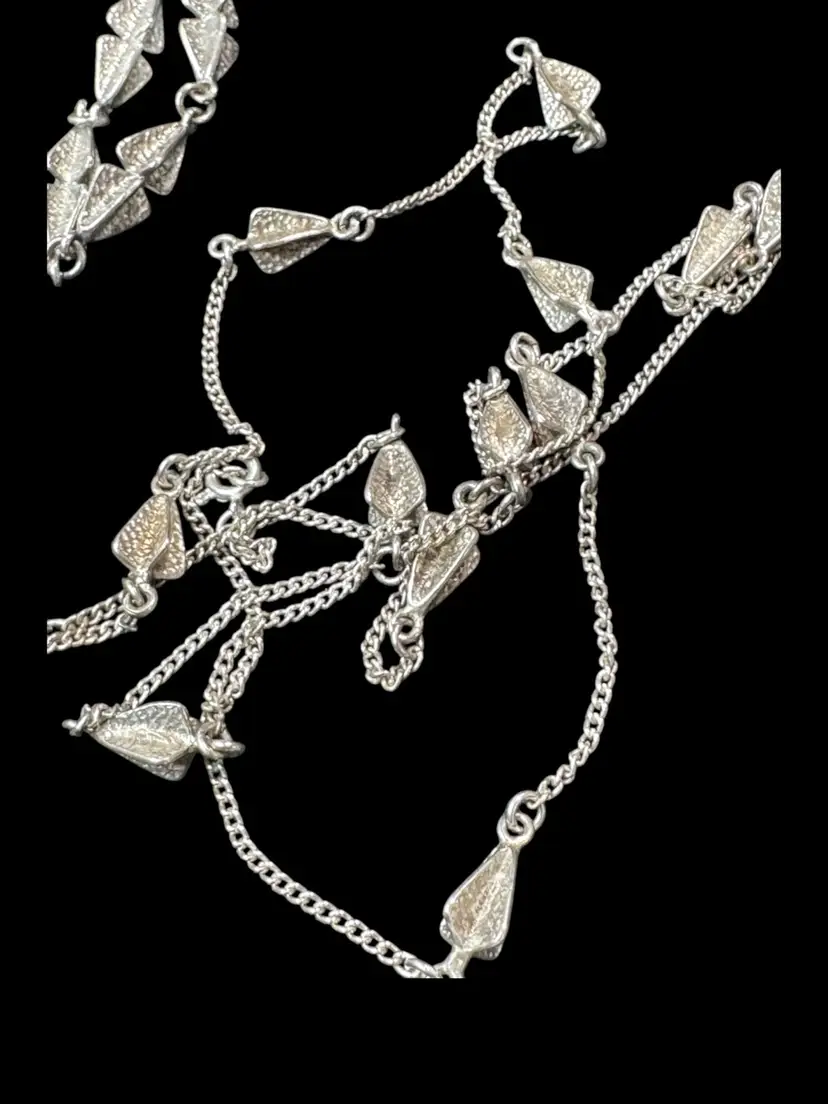 2 chain necklaces have been tested twice for metal purity - they weigh 73 grams collectively. The 30” necklace has a hook closure and weighs 56 grams. The 32” necklace has a spring ring clasp weighs 16 grams. Both are stamped 925. Wear tighter or separately.