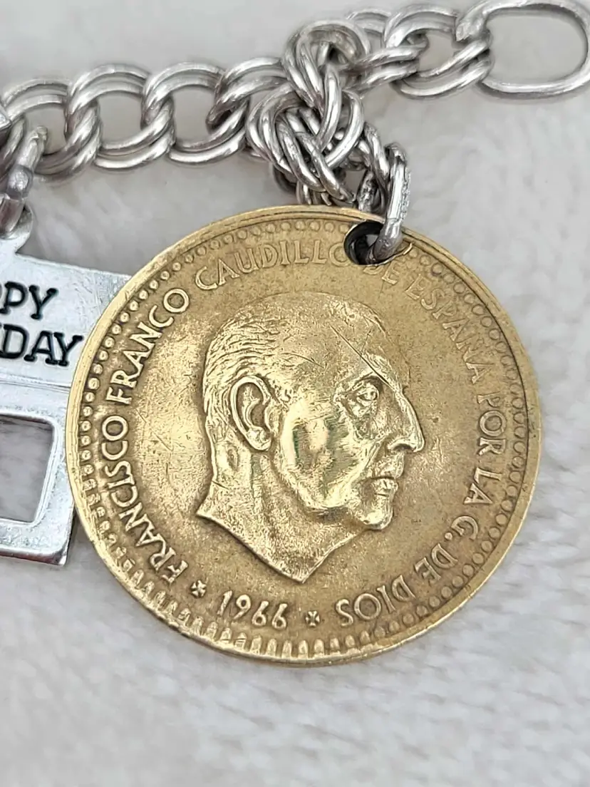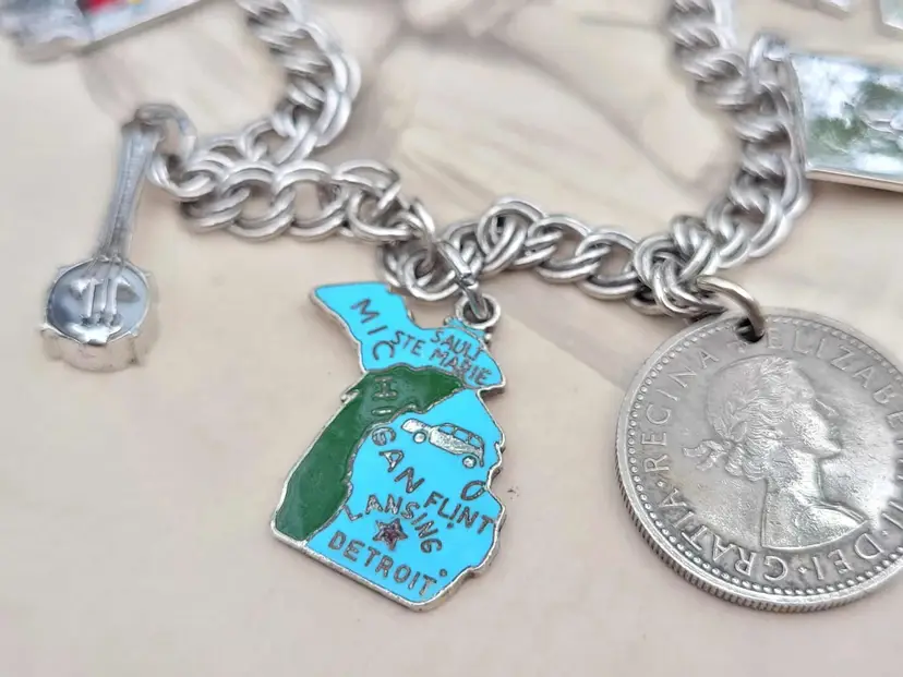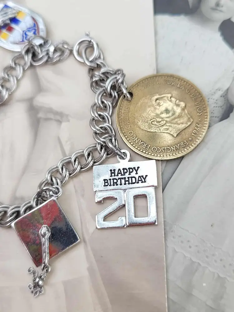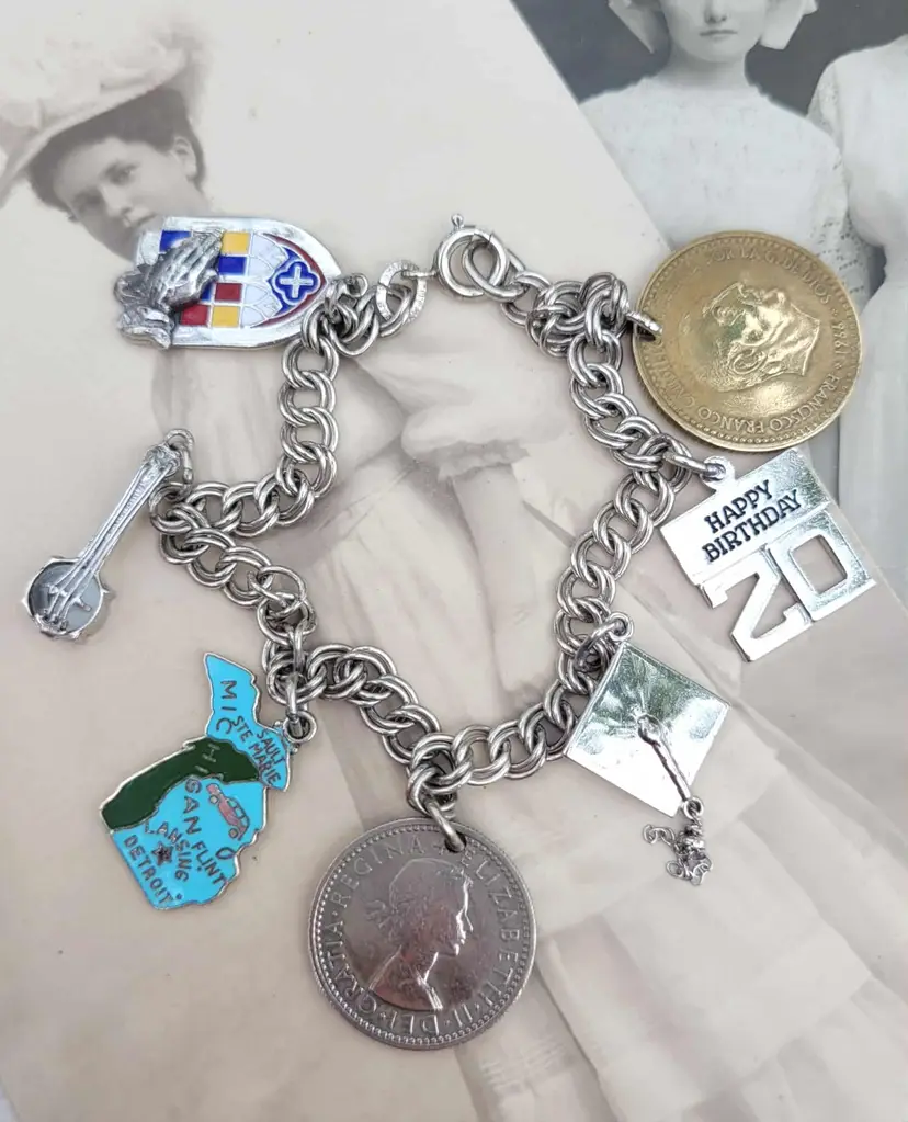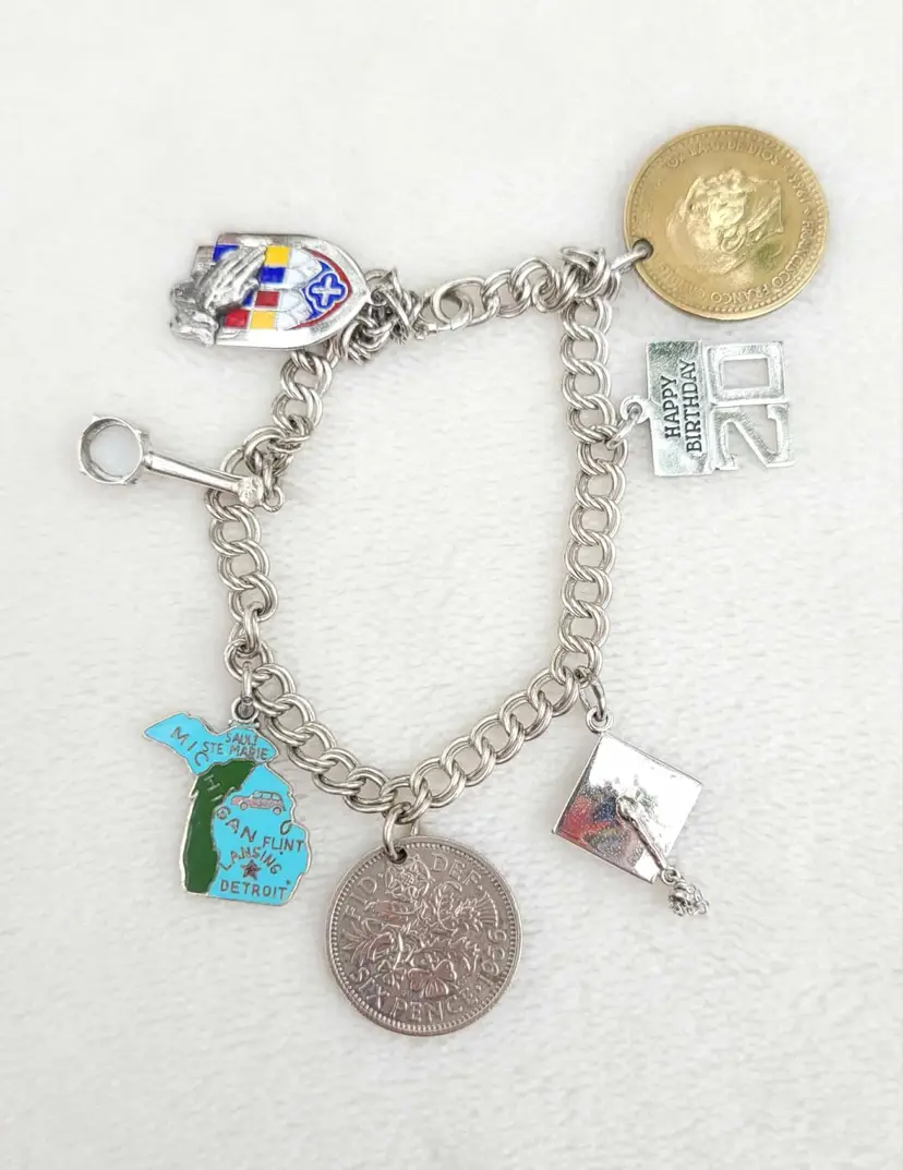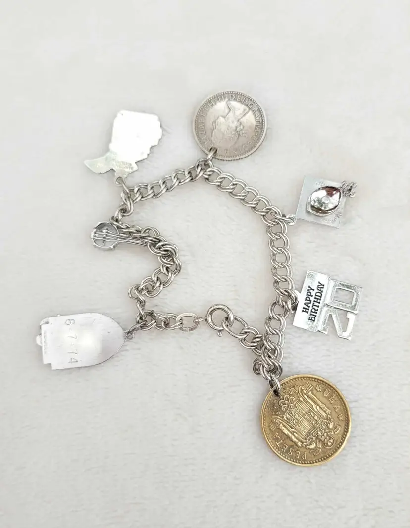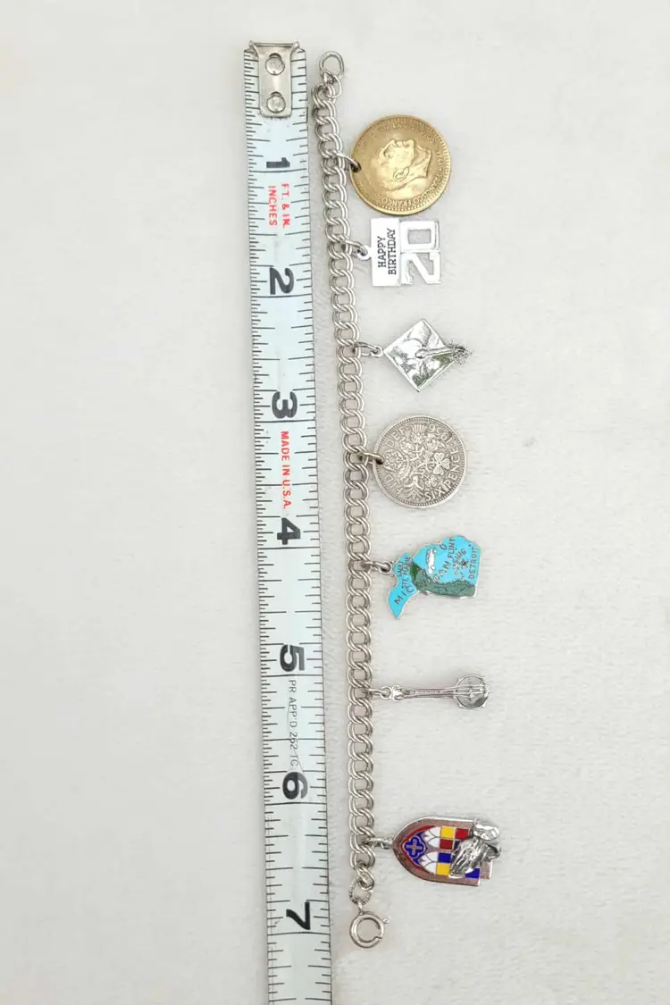 Adorable vintage sterling silver charm bracelet, with 7 charms. Four charms are marked sterling, the banjo is not marked, and I'm unsure the metal content of the two coins. This comes from an estate and is circa 1960s/70s, and is just over 21 grams in weight. It is in good condition, please see pictures for details and measurements.