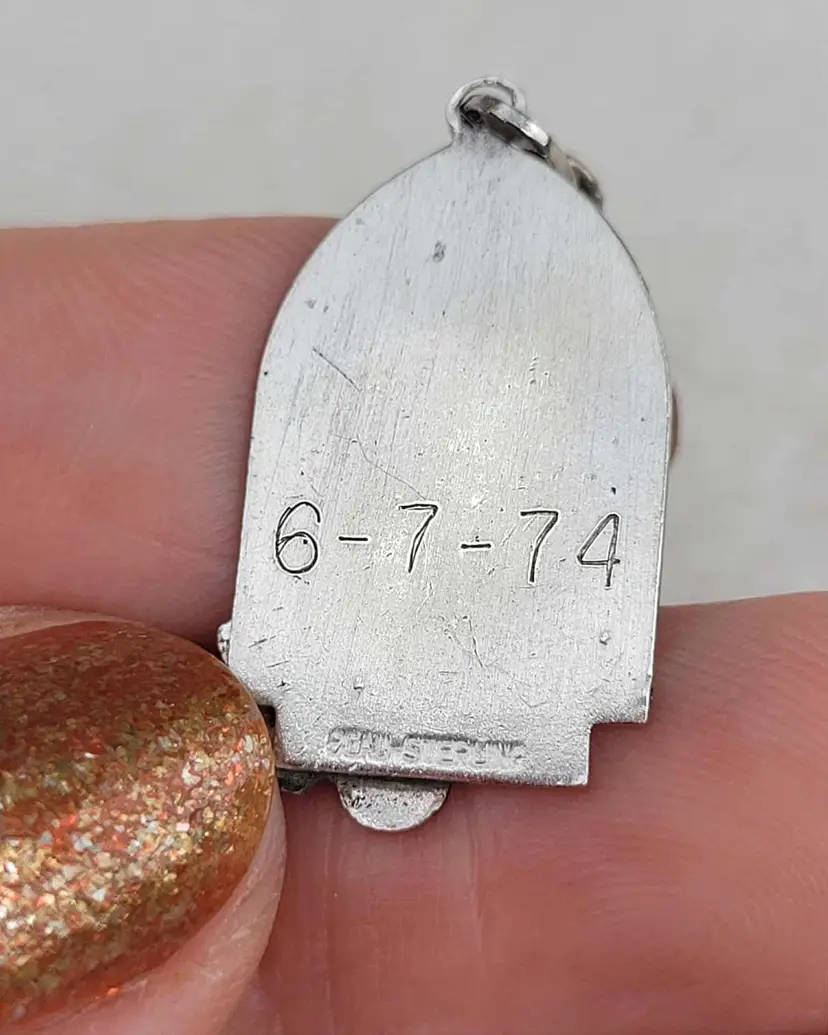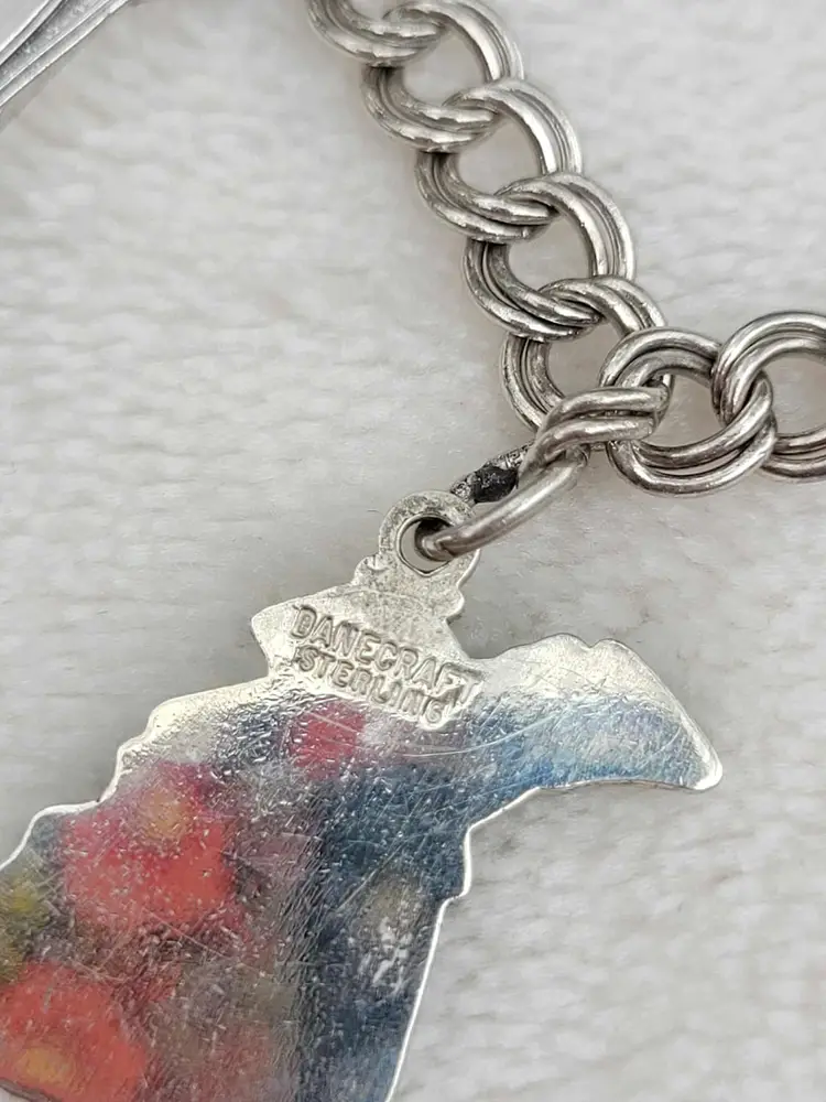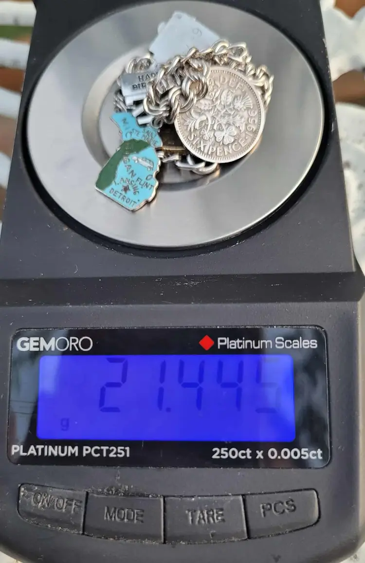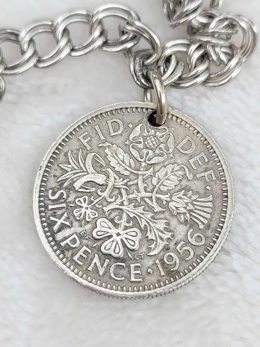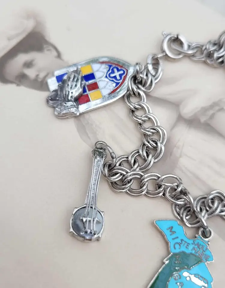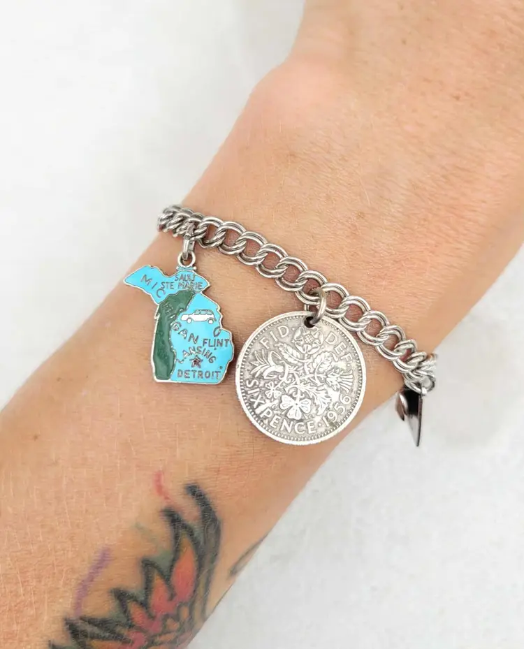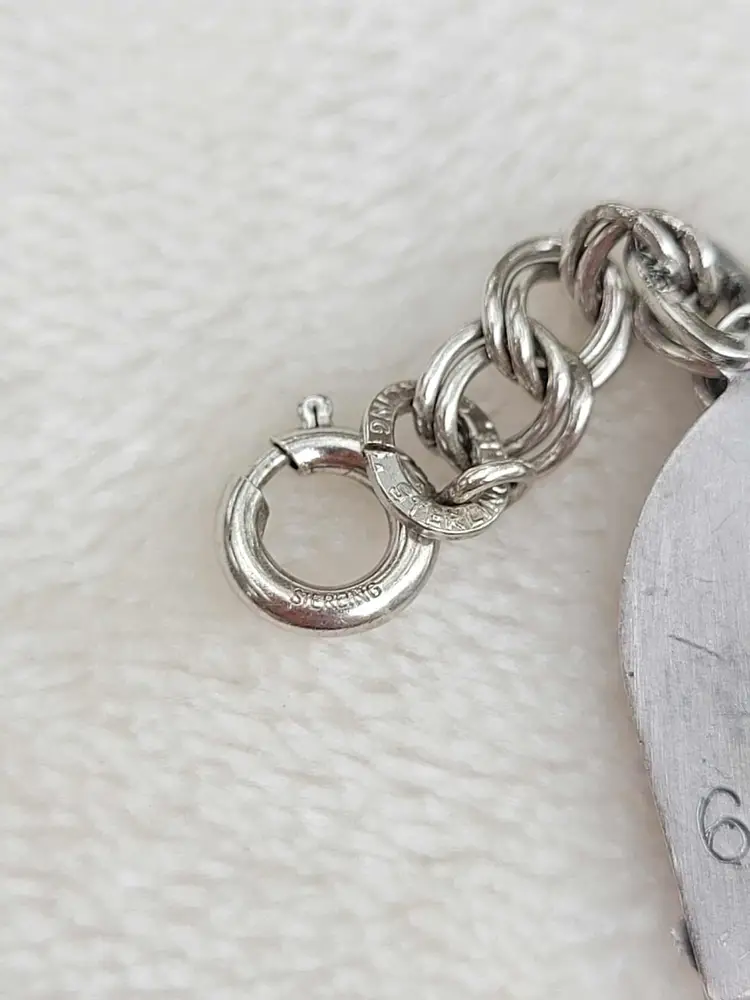 Adorable vintage sterling silver charm bracelet, with 7 charms. Four charms are marked sterling, the banjo is not marked, and I'm unsure the metal content of the two coins. This comes from an estate and is circa 1960s/70s, and is just over 21 grams in weight. It is in good condition, please see pictures for details and measurements.
