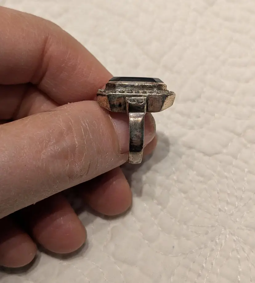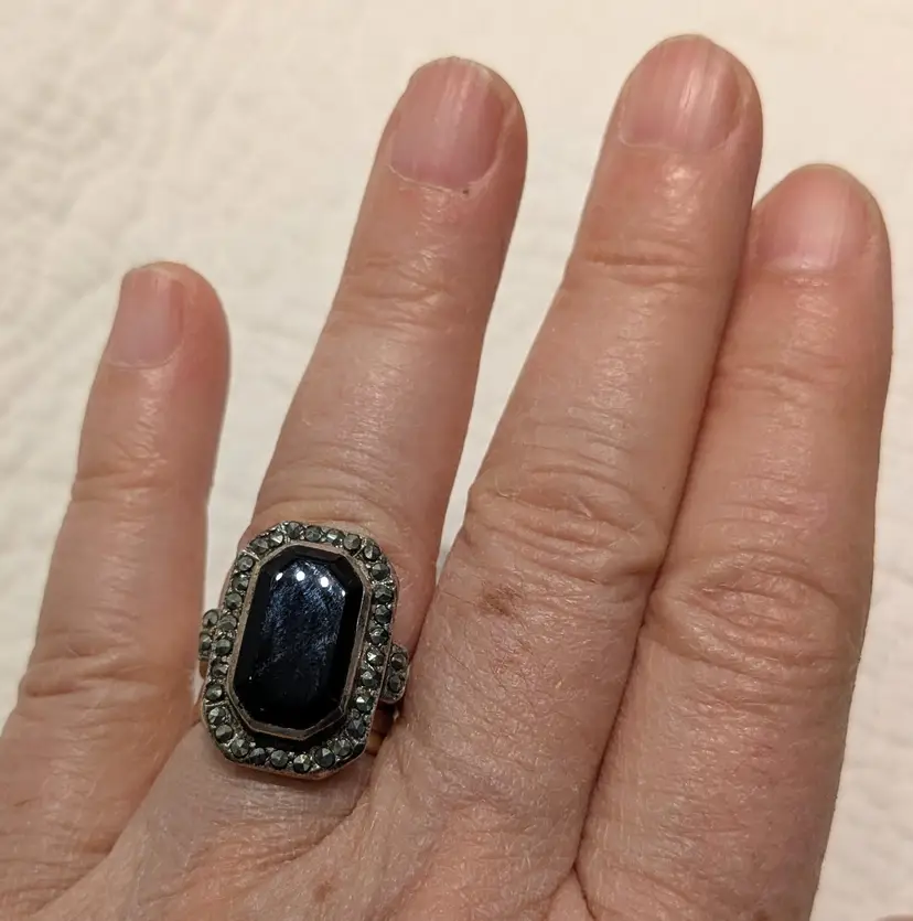 The front face of this ring is 7/8" long. Marked 925. All marcasite stones are present.