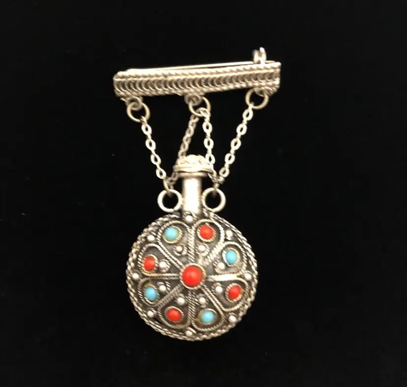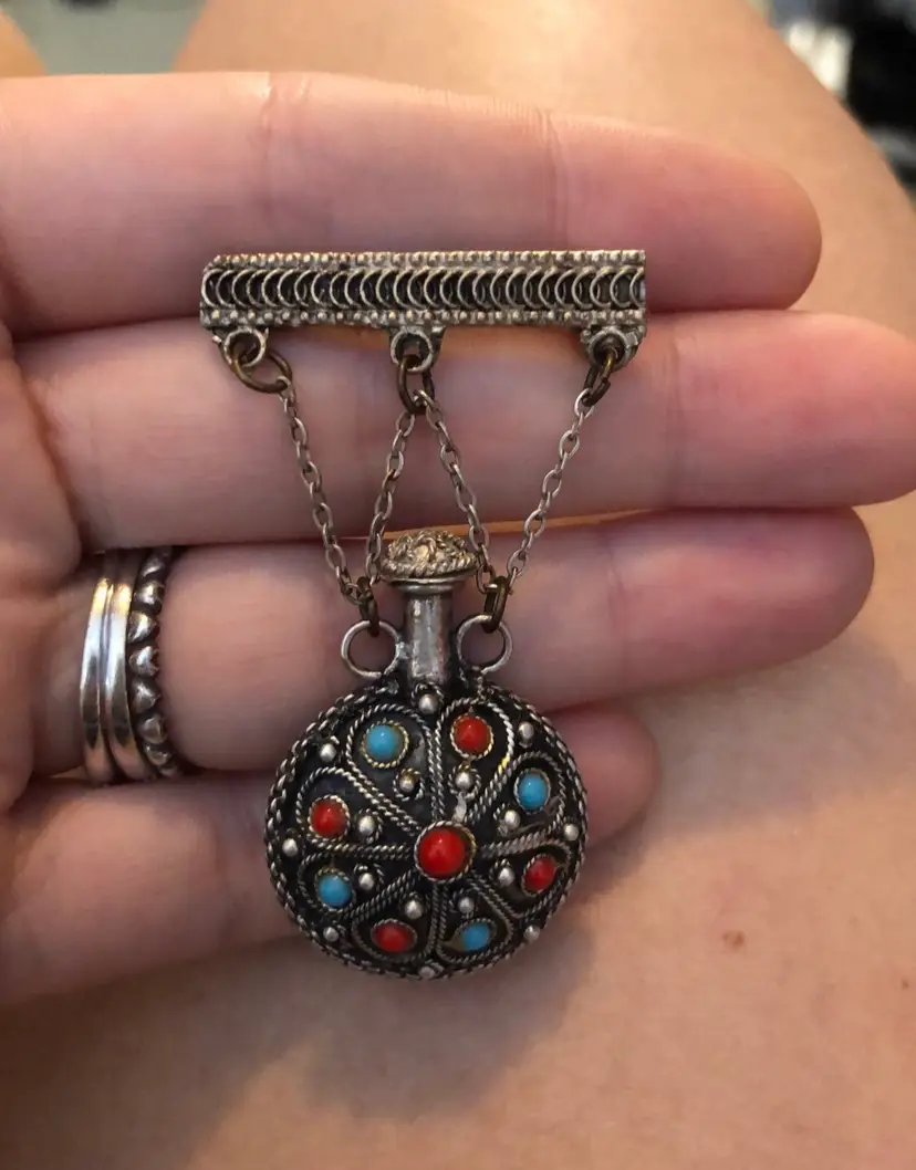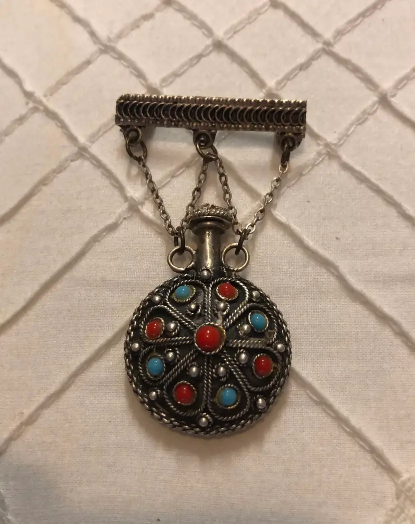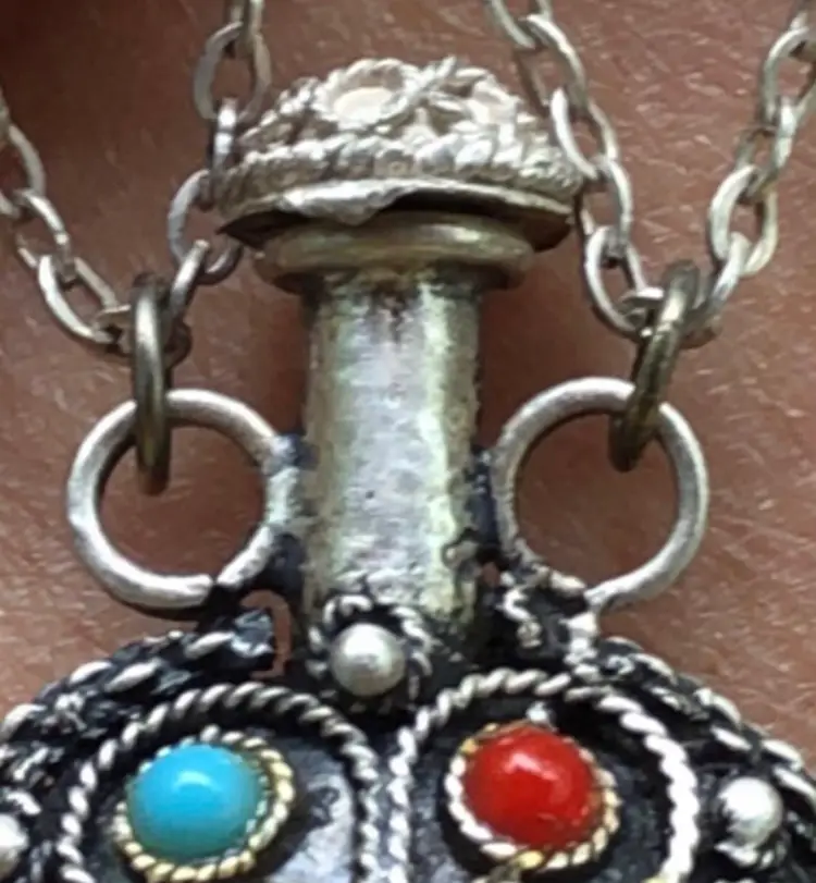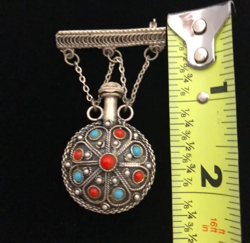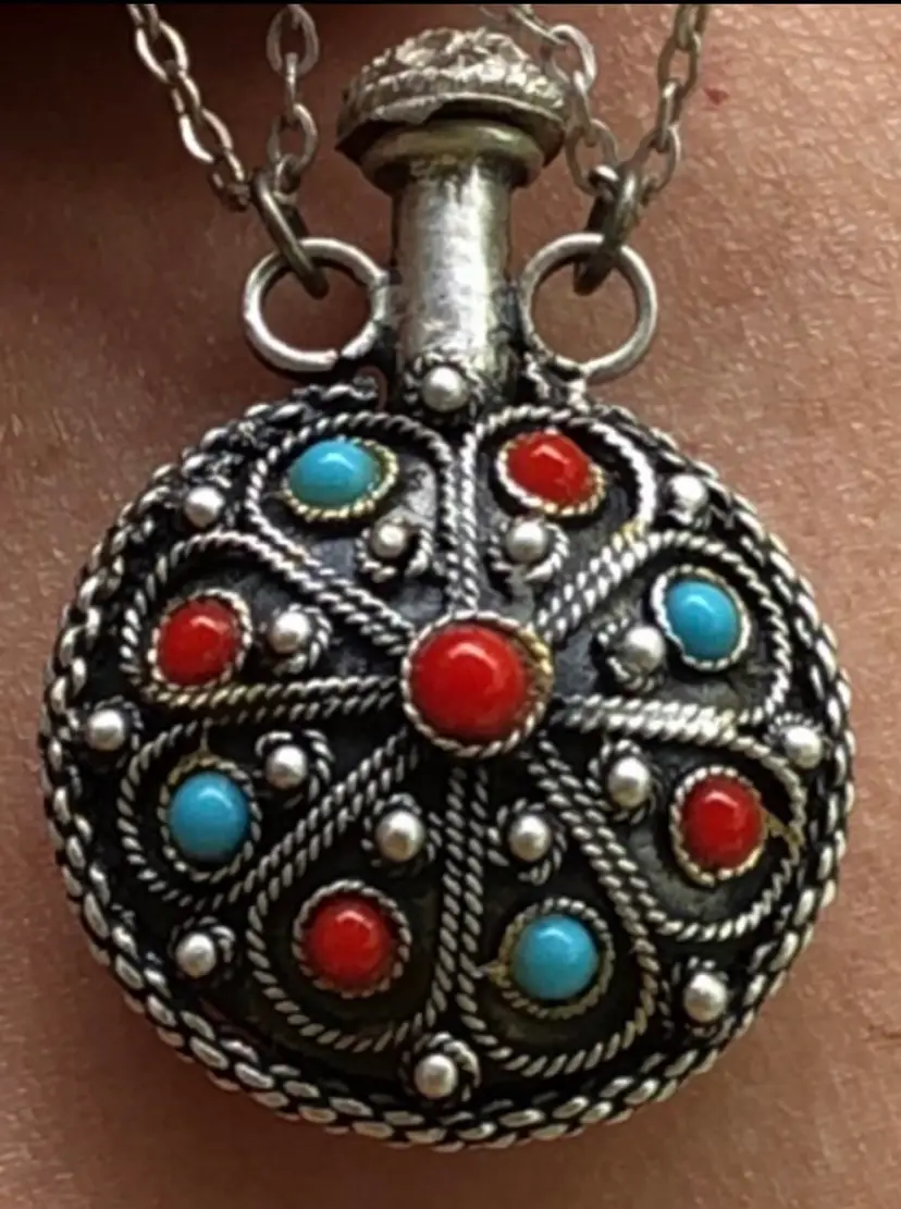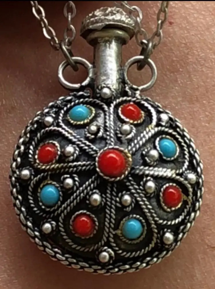 Very Unique Absolutely beautiful perfume vial bottle pendant necklace with coral and turquoise gemstone inlay Lid is removable Dent in the back (See pictures)