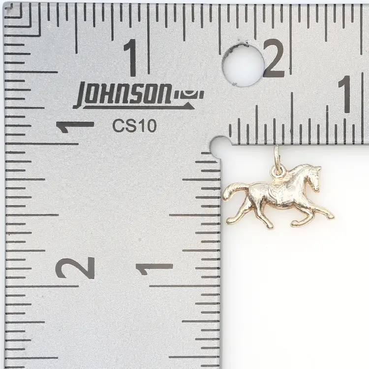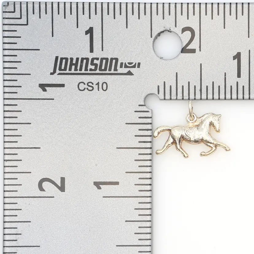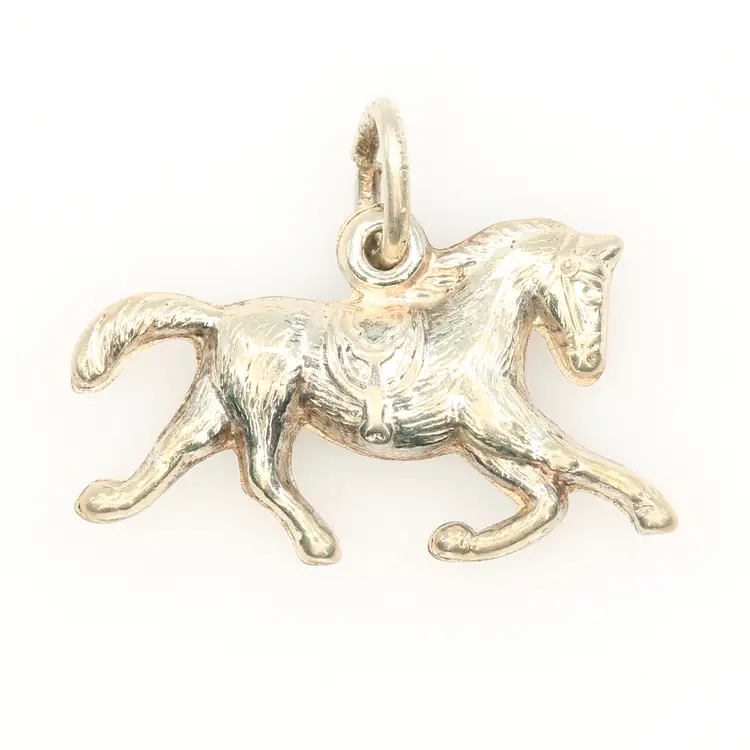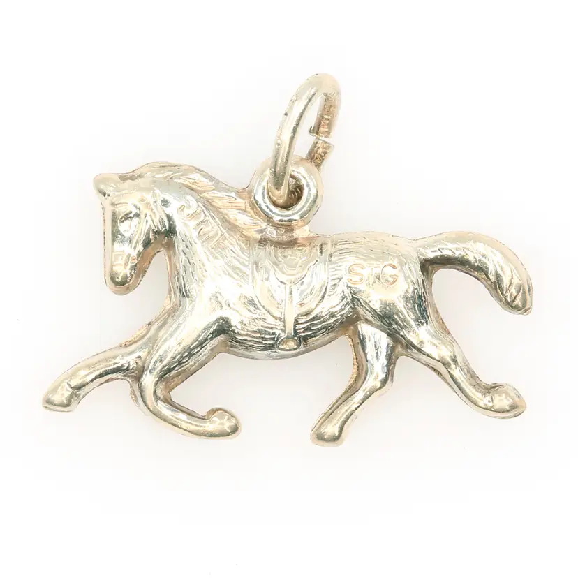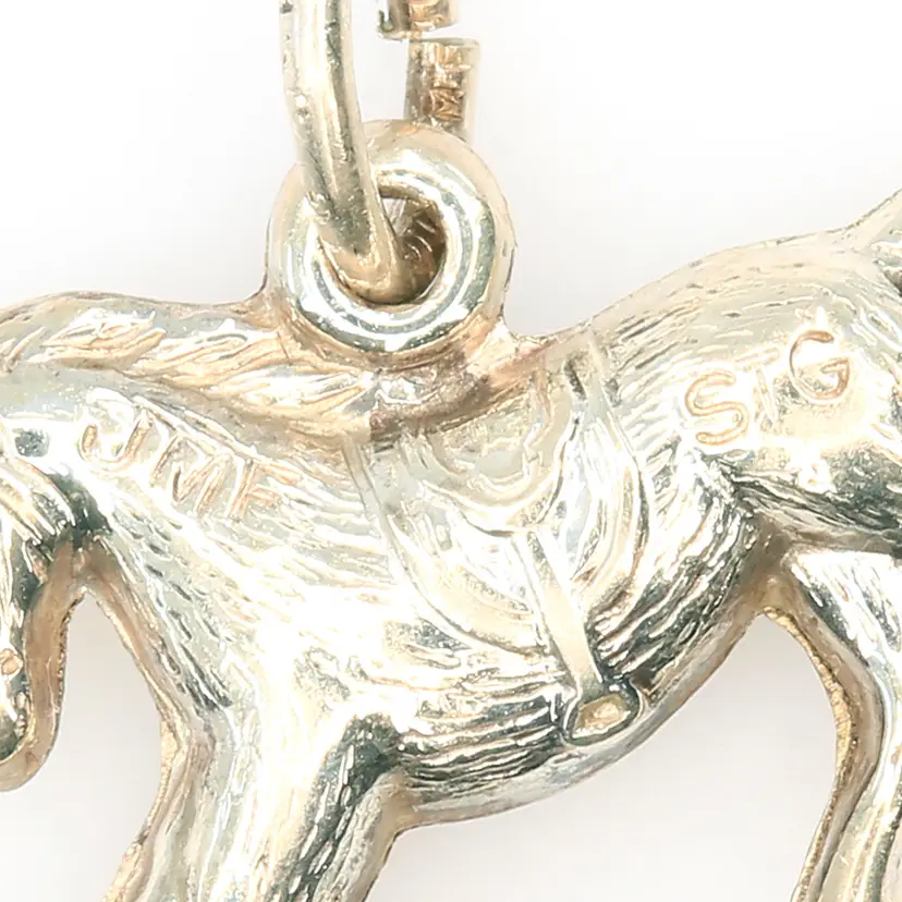This vintage 1950s sterling silver running horse charm pendant is a beautifully detailed piece, made using the die-cast method. The horse charm features a naturally textured body with an English saddle and bridle, while its mane, tail, and hooves are skillfully detailed. A perfect charm for horse lovers, equestrians, or vintage charm enthusiasts, this delightful piece captures the spirit and elegance of a galloping horse, making it a wonderful addition to any vintage jewelry or charm collection.