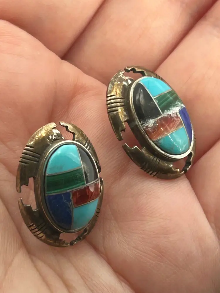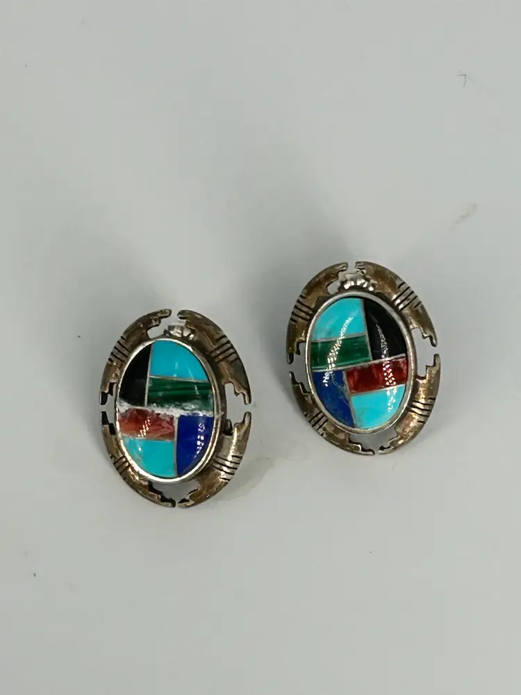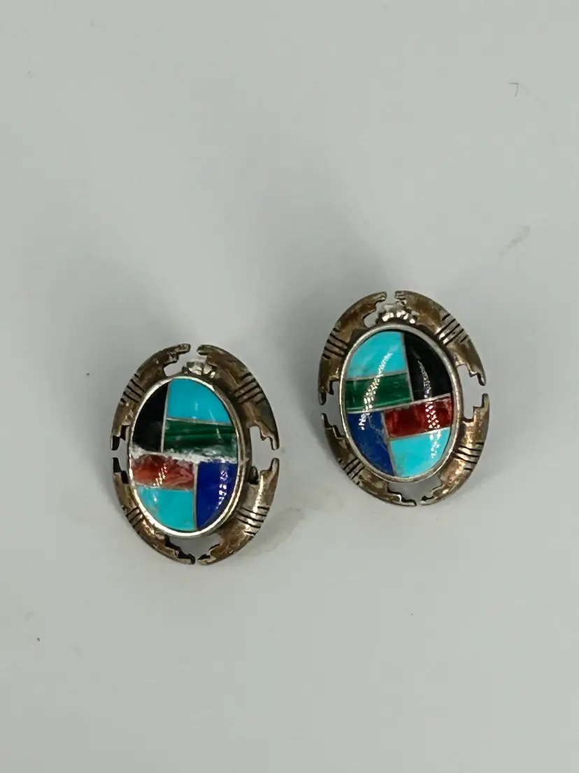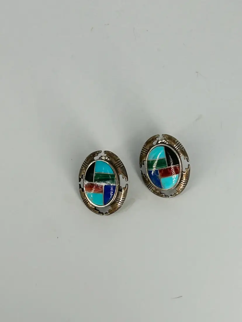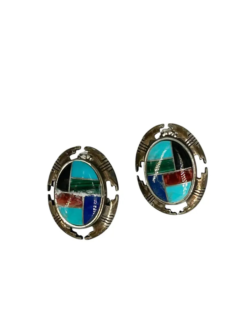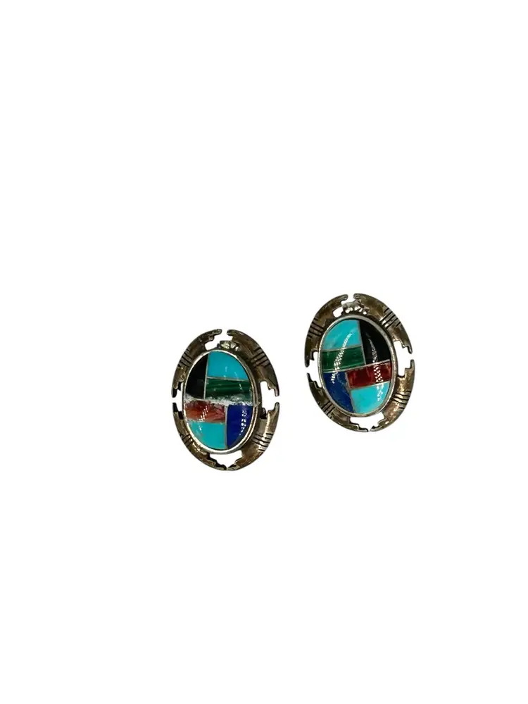 These stunning vintage earrings feature a classic Southwestern oval design with colorful inlay stones including turquoise, coral, lapis, and malachite, set in sterling silver. The intricate geometric frame and rich mix of natural stones reflect a traditional Native American-inspired aesthetic. Marked 925 and signed on the back, these earrings are pierced with sturdy post backs.