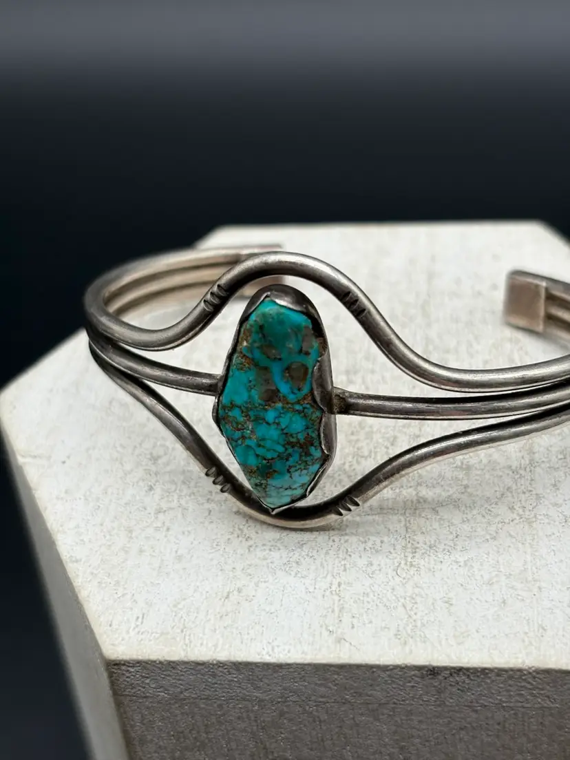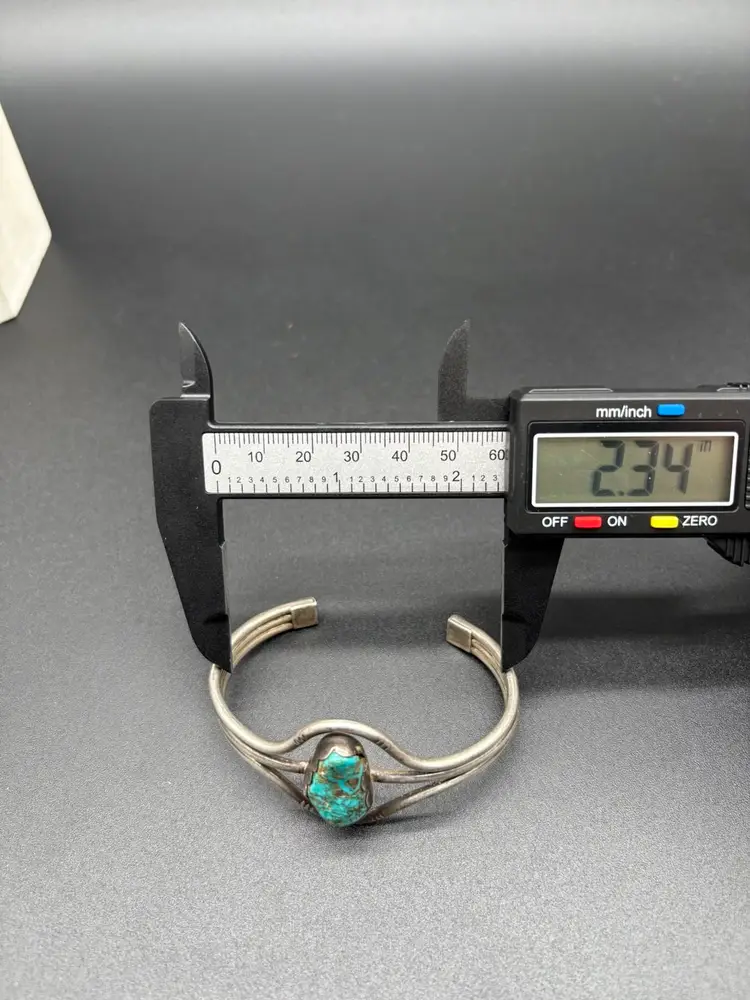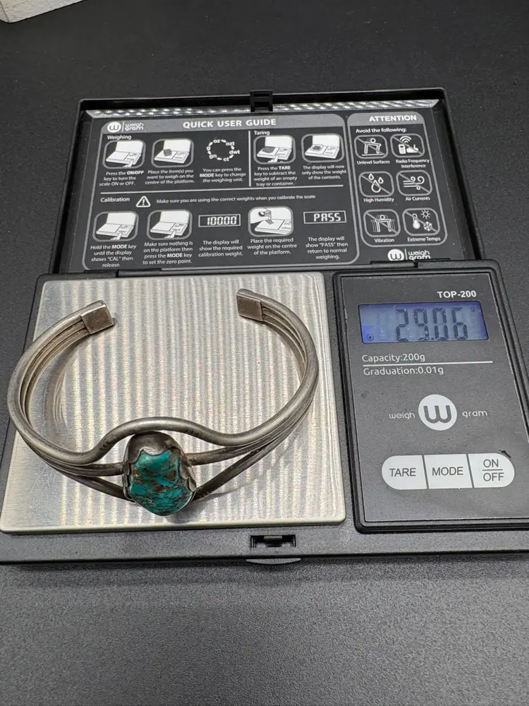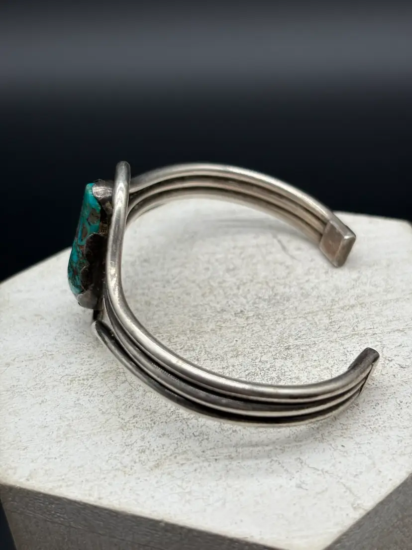 Details: • Tested sterling silver • Natural turquoise (untreated, not stabilized to seller’s knowledge) • Old pawn style • Weight: 29 grams • Cuff bracelet, adjustable • Pre-owned, very good condition