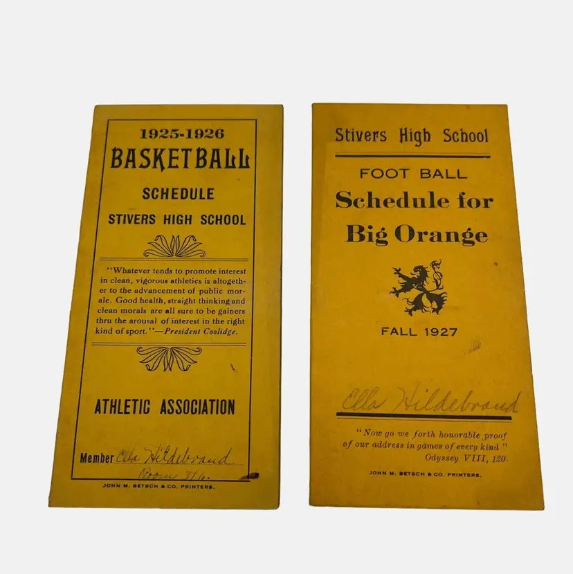 Two vintage schedule booklets for basketball and football from Stivers High School dating back to the 1920s. The basketball schedule is for 1925/1926 and the football schedule is for 1927. Historical sports memorabilia from Dayton, Ohio.