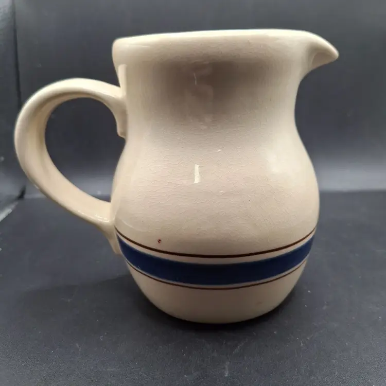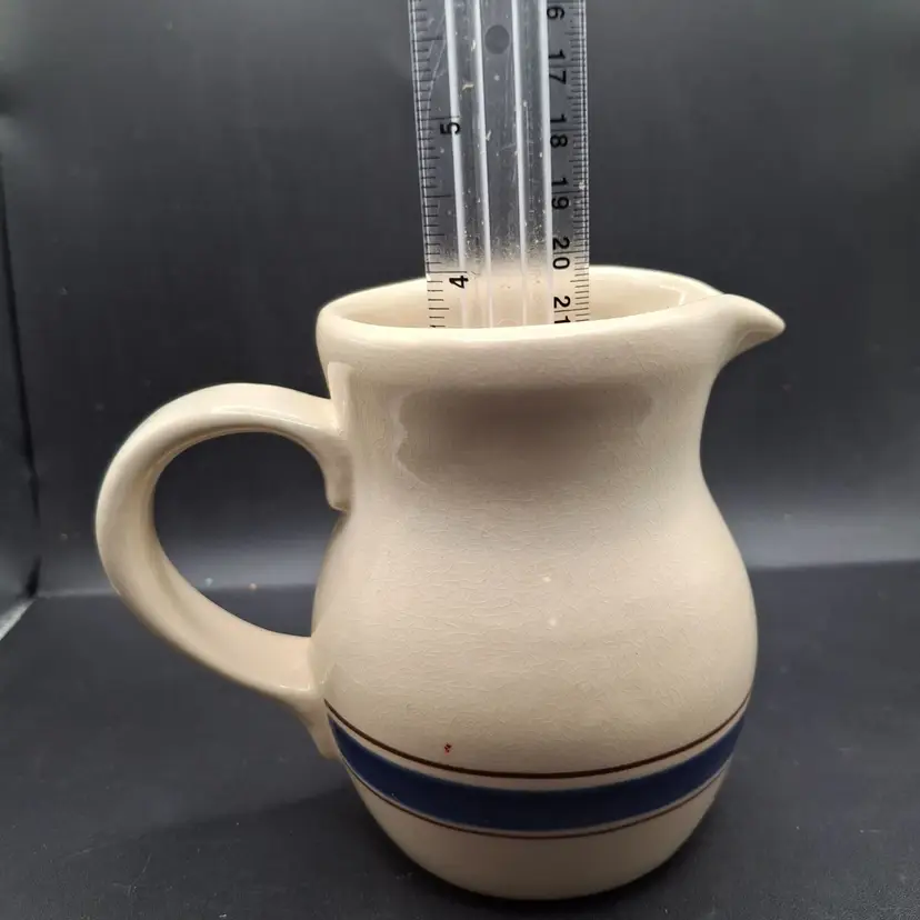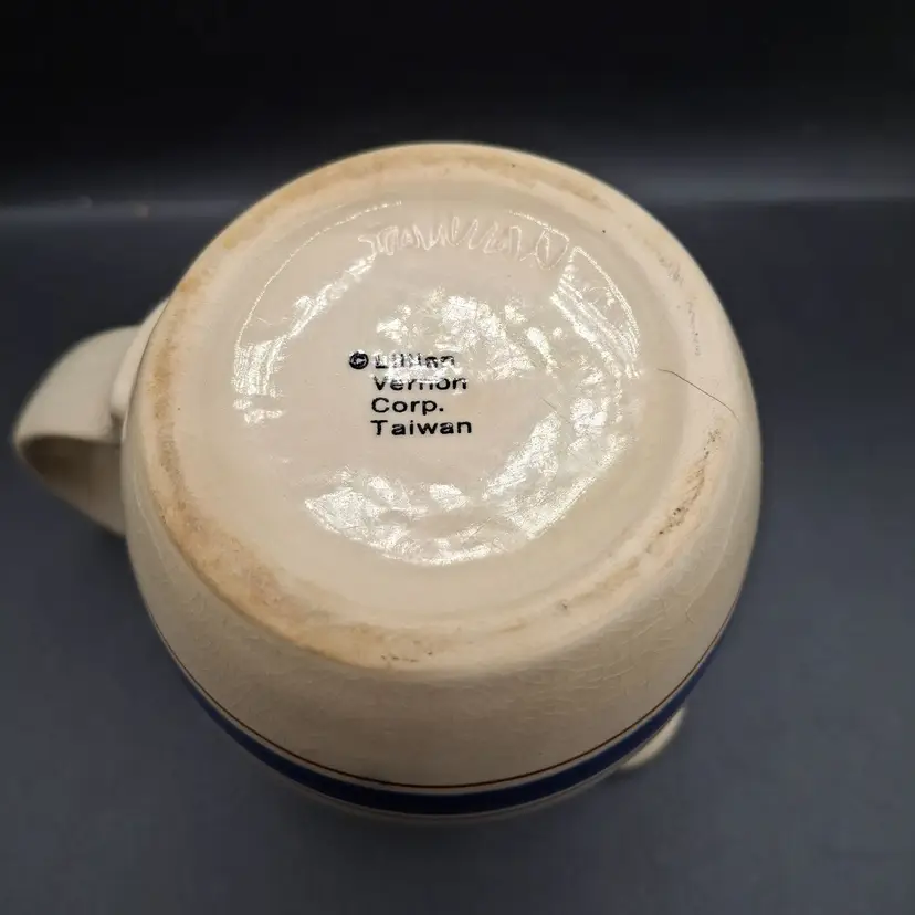 • Stoneware construction • Blue stripe detail • Vintage design • Handle for easy pouring • Made in Taiwan