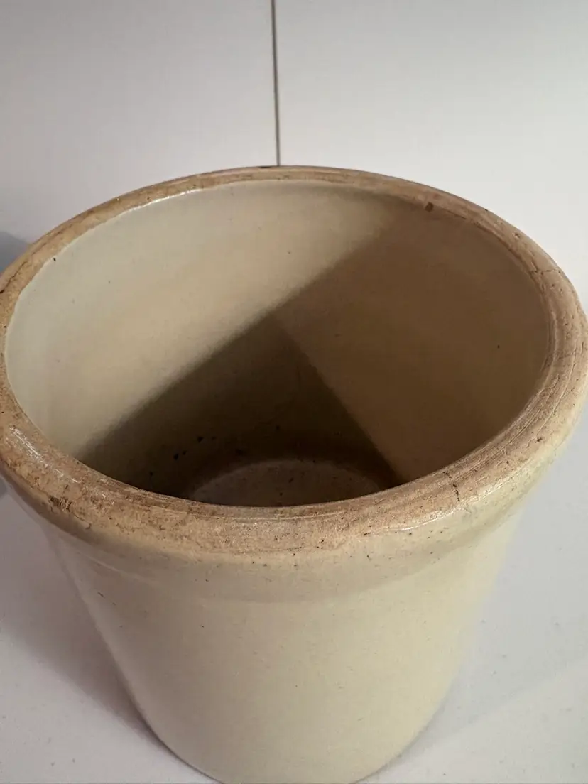 This Vintage Stoneware Crock is a charming piece of farmhouse decor. The medium-sized crock features a solid beige color and is made of ceramic and porcelain. With an antique vintage design, this free-standing crock adds a touch of nostalgia to any kitchen or dining space. Made in the United States, this original crock is perfect for storing or displaying food-related items in a rustic and stylish way. Its compact size of 6.5" height and 6" width make it a versatile piece that can blend seamlessly into various kitchen themes.