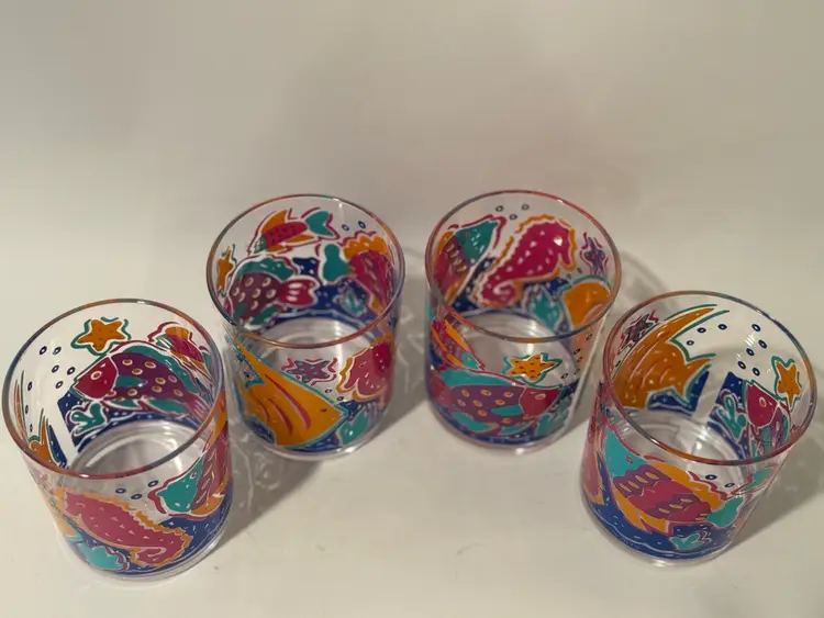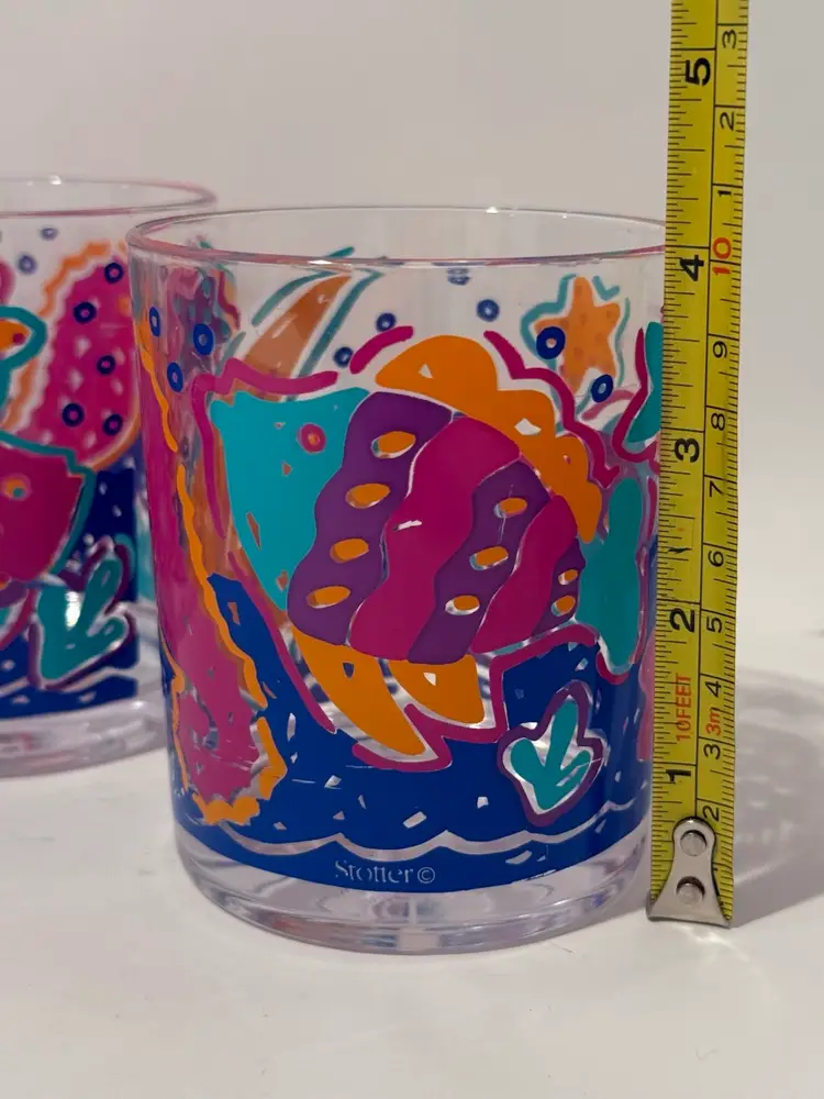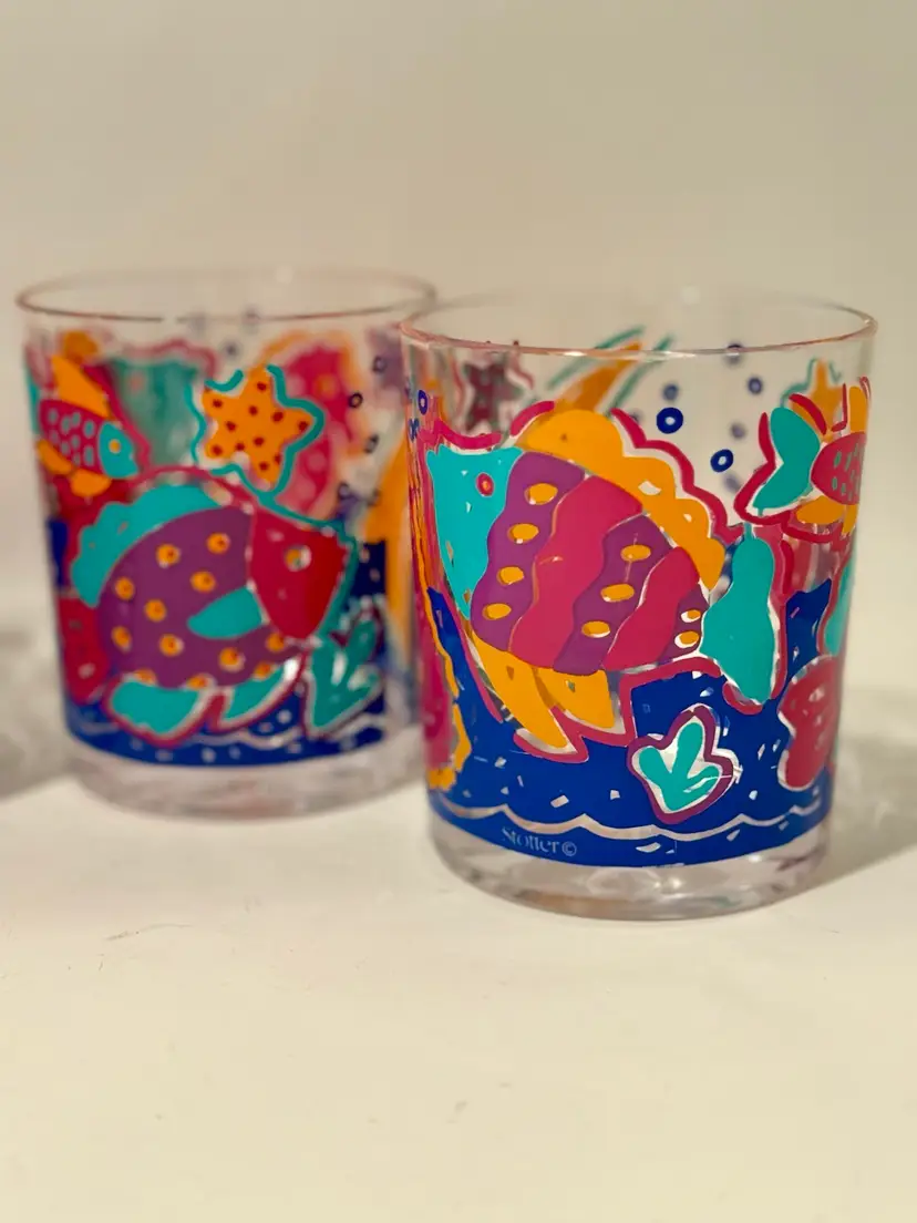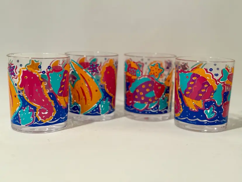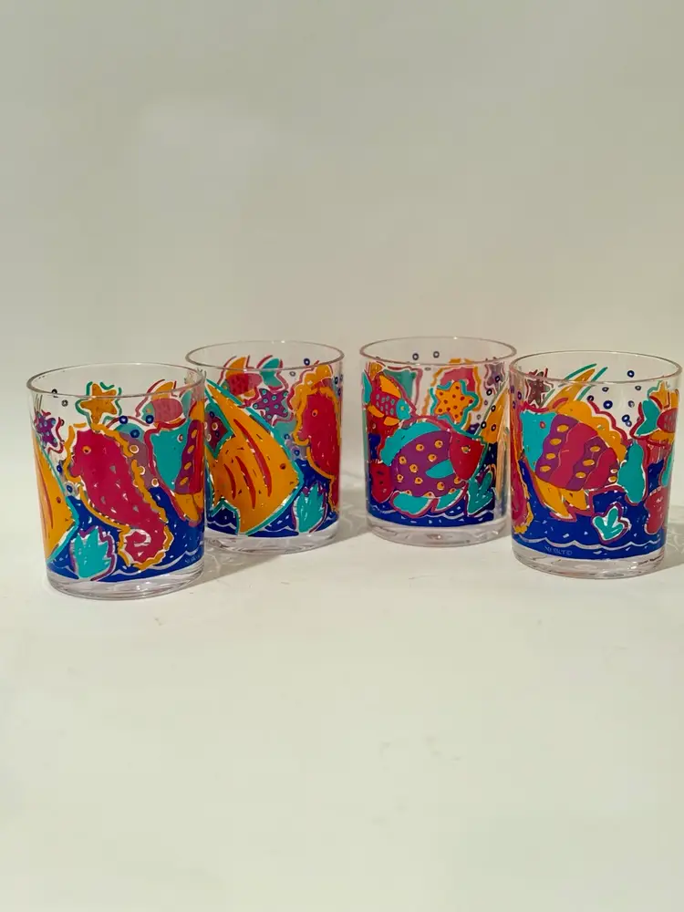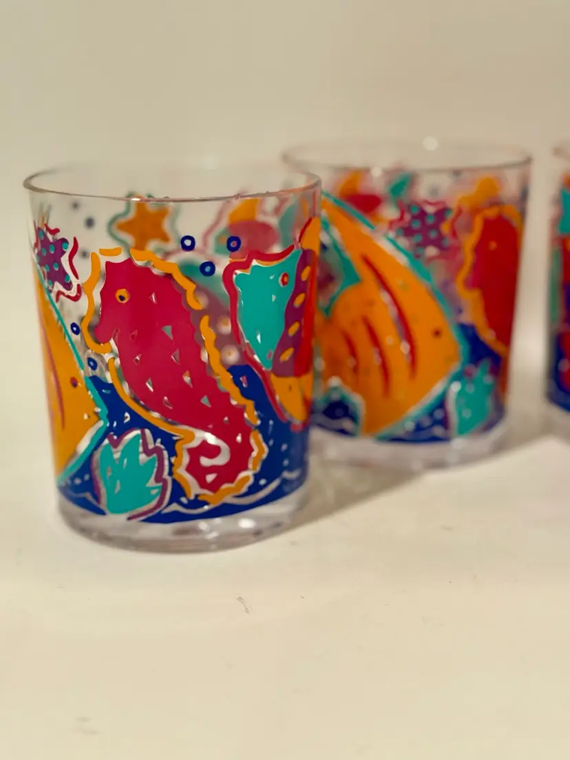The set includes eight glasses, each with a unique design featuring a tropical fish & turtle.