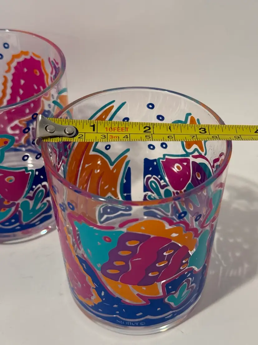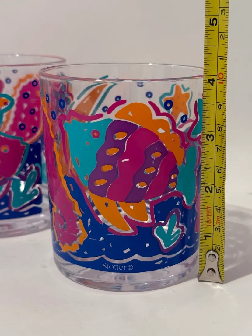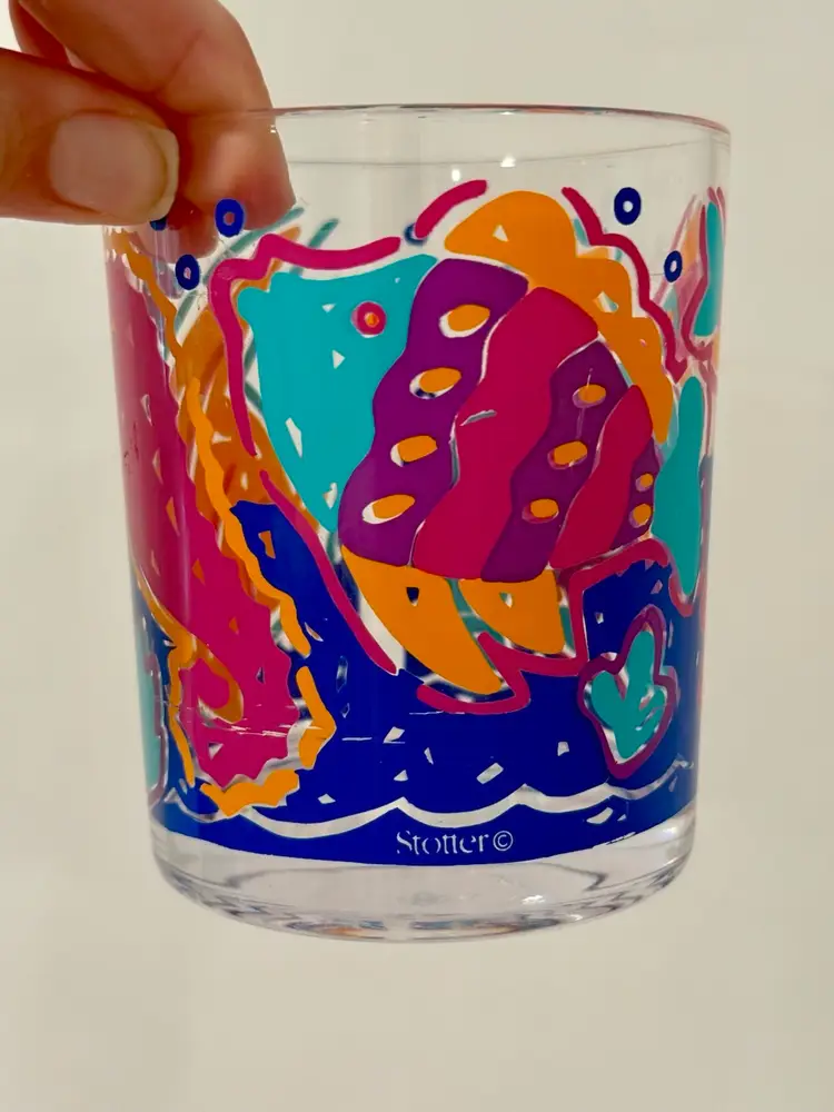 Add some retro charm to your home bar or kitchen with this set of eight vintage Stotter drinking glasses. The glasses are made of durable plastic and acrylic material, ensuring they can withstand daily wear and tear. The round shape and abstract pattern of the glasses make them perfect for all occasions and adds a touch of fun and curiosity to your home decor.