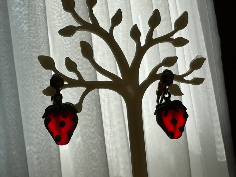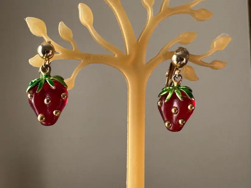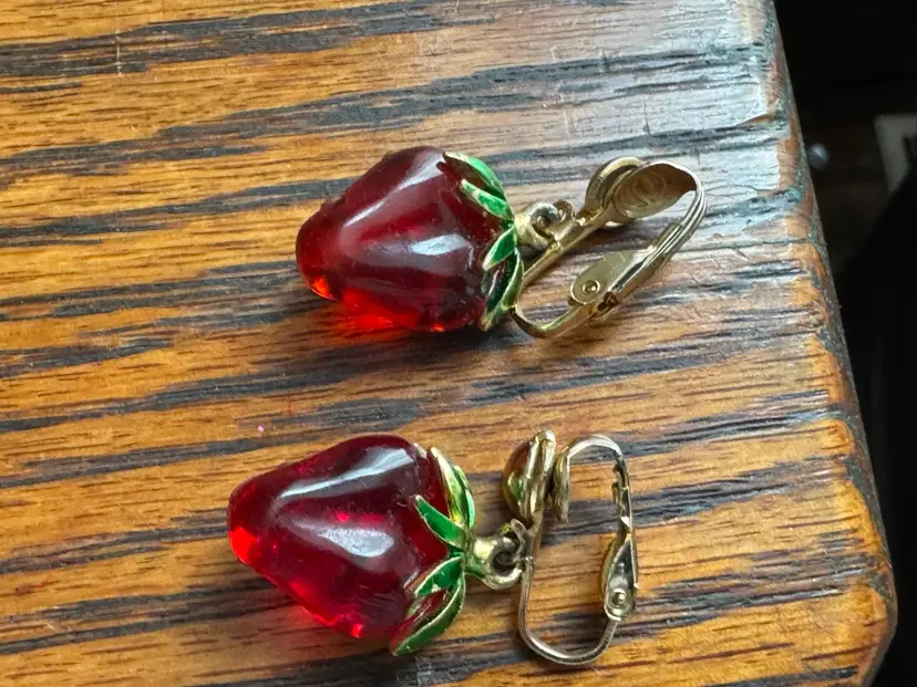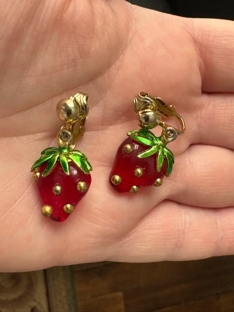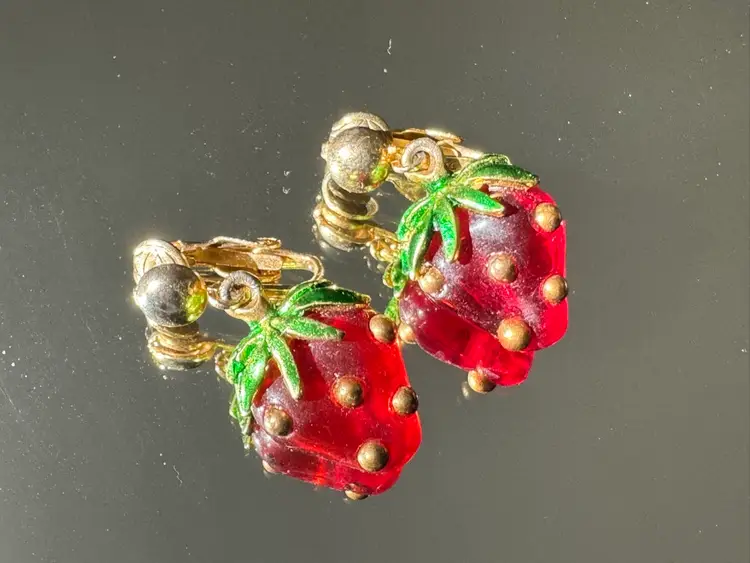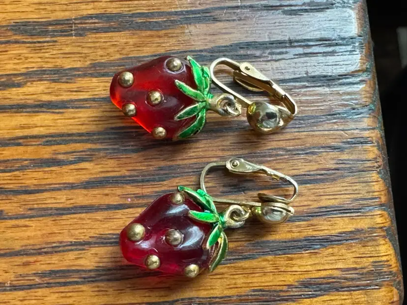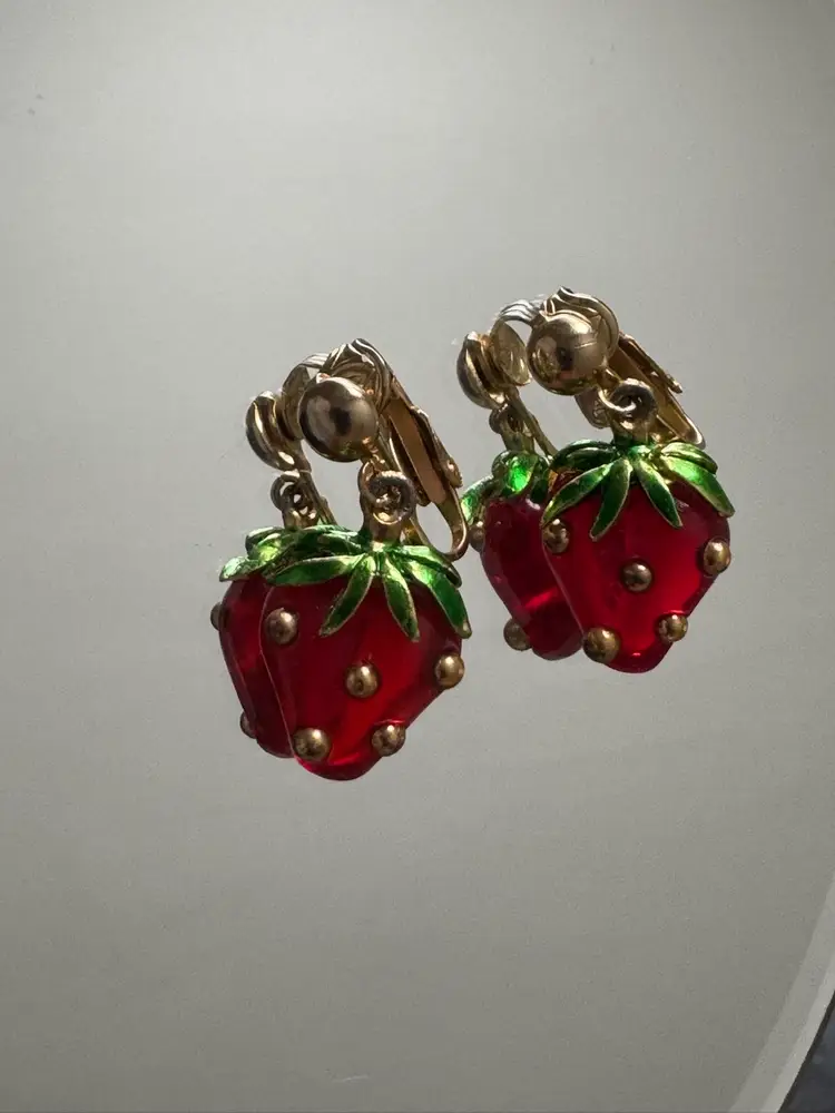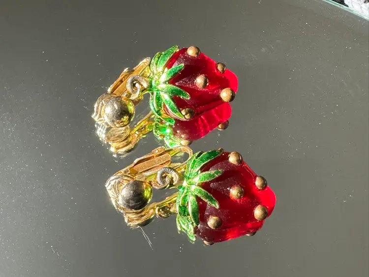 Vintage strawberry clip earrings with green enamel, gold tone metal