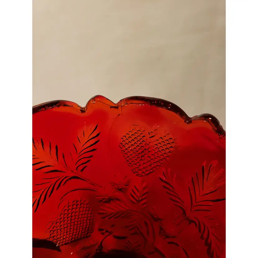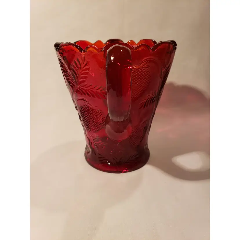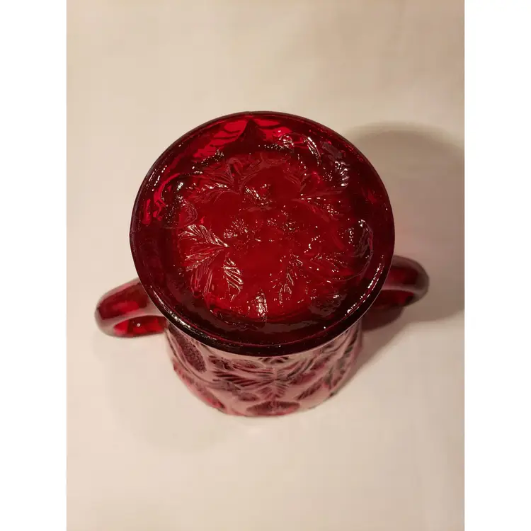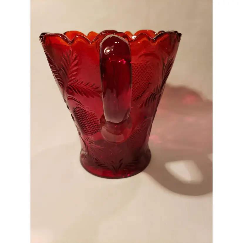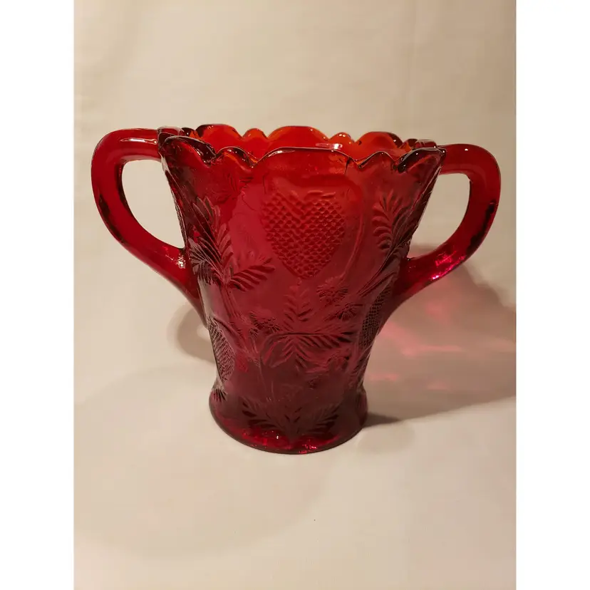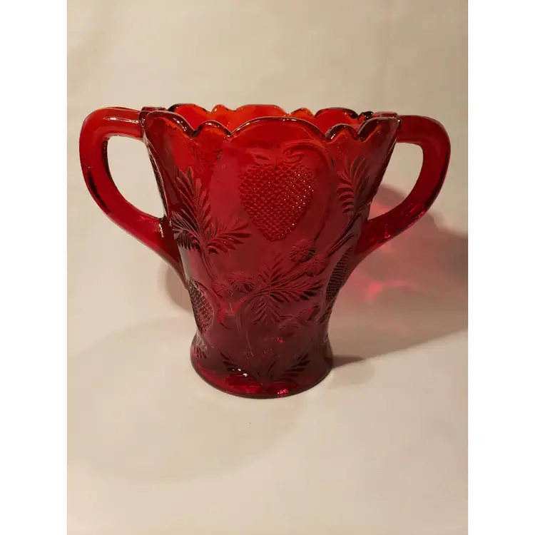 Vibrant red glass spooner/spoon holder with strawberry motif. Thick and heavy. Maker unverified. Measures 5" tall and 6.5" wide at the handles. Very good condition. Note: I feel a tiny chip inside one of the ruffles that can't be seen. Also, there are two very small scratches inside the top edge on one side that you wouldn't notice unless you're looking for them. Please see last photo. Very pretty glass.