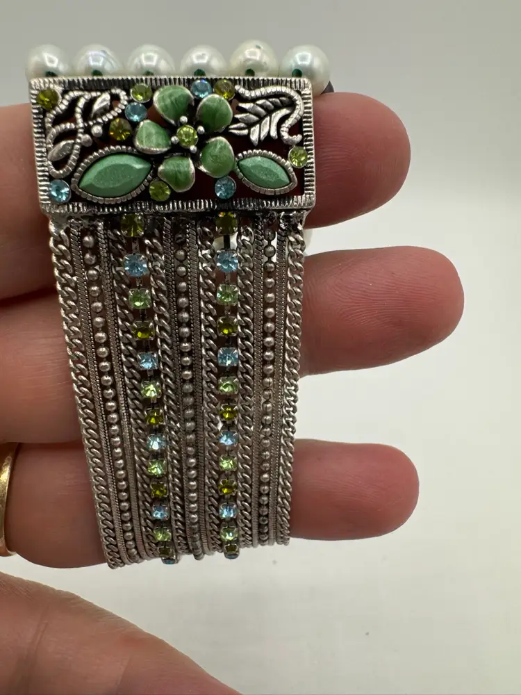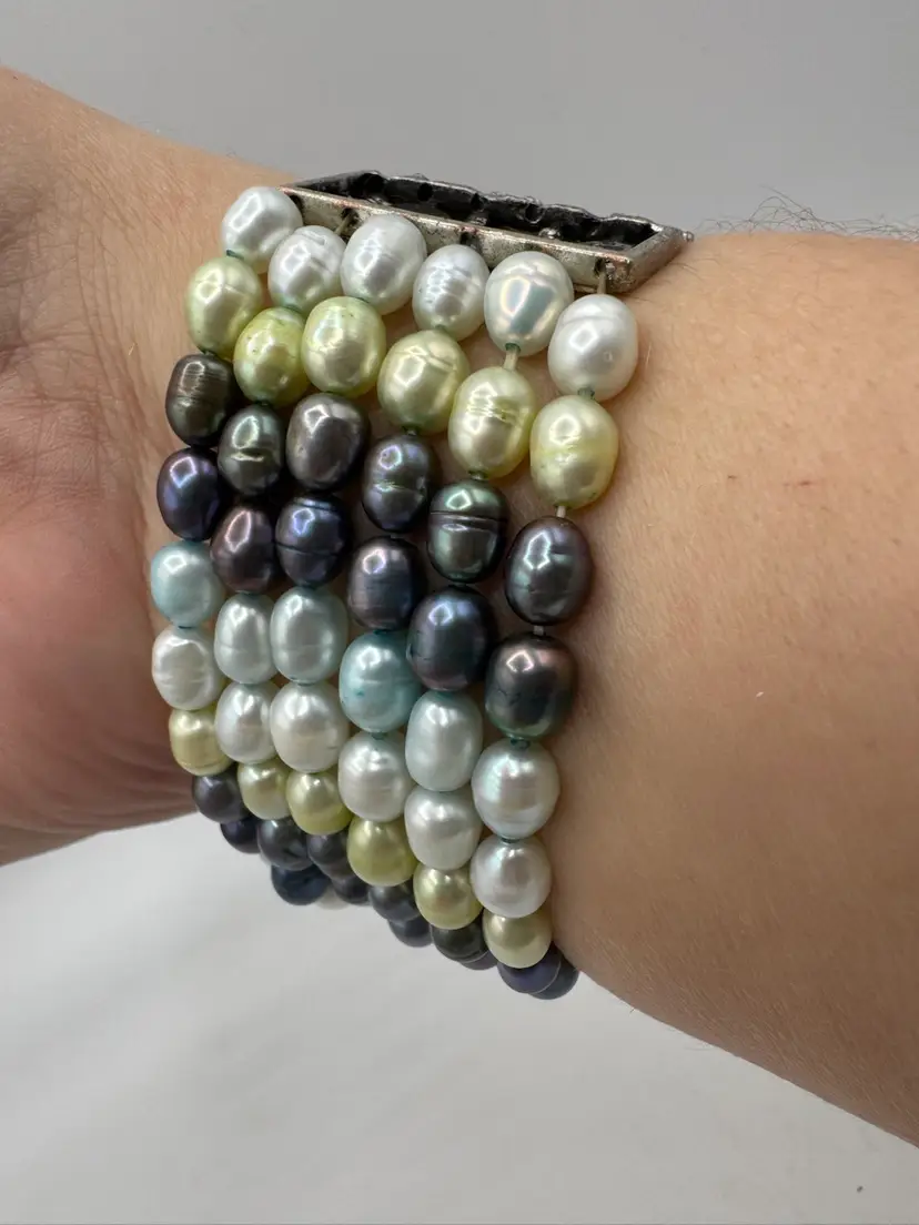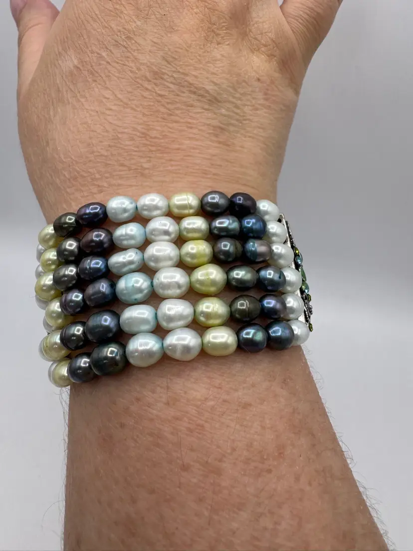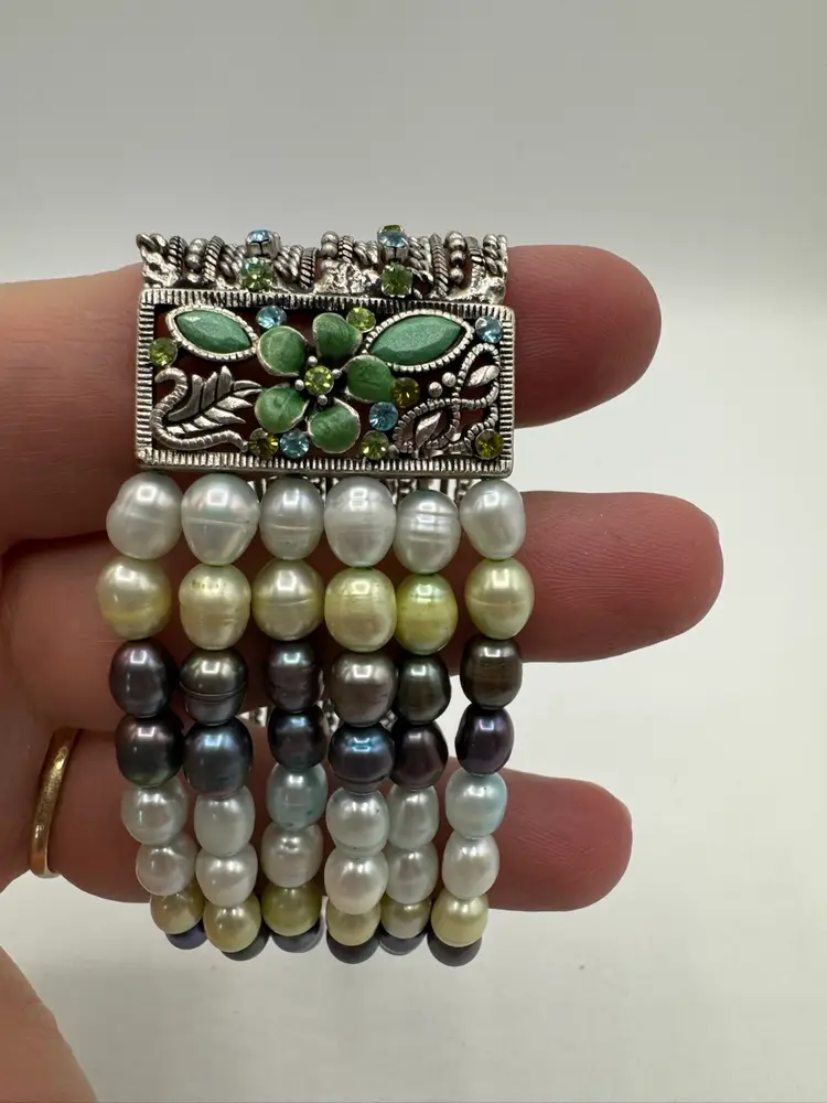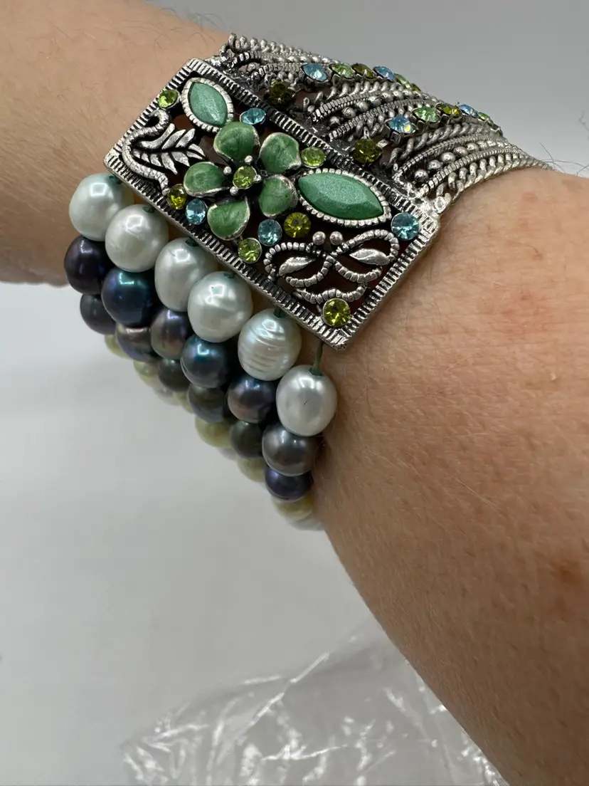 This gorgeous vintage bracelet is absolutely beautiful with multi color dyed coordinated real fresh water pearls. Beautiful silver tone with enamel & sparkling rhinestones and chains. Amazing piece. Excellent condition. Measures 7 1/2”