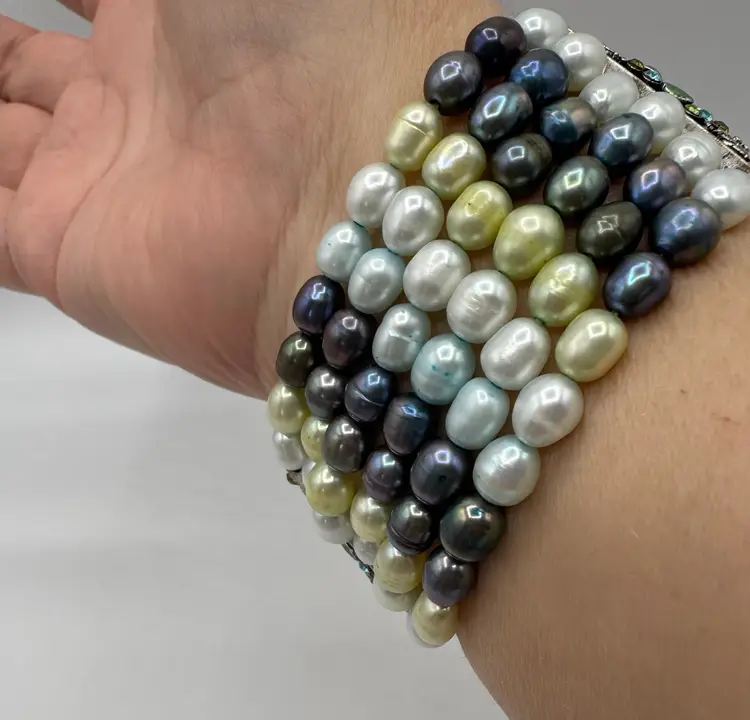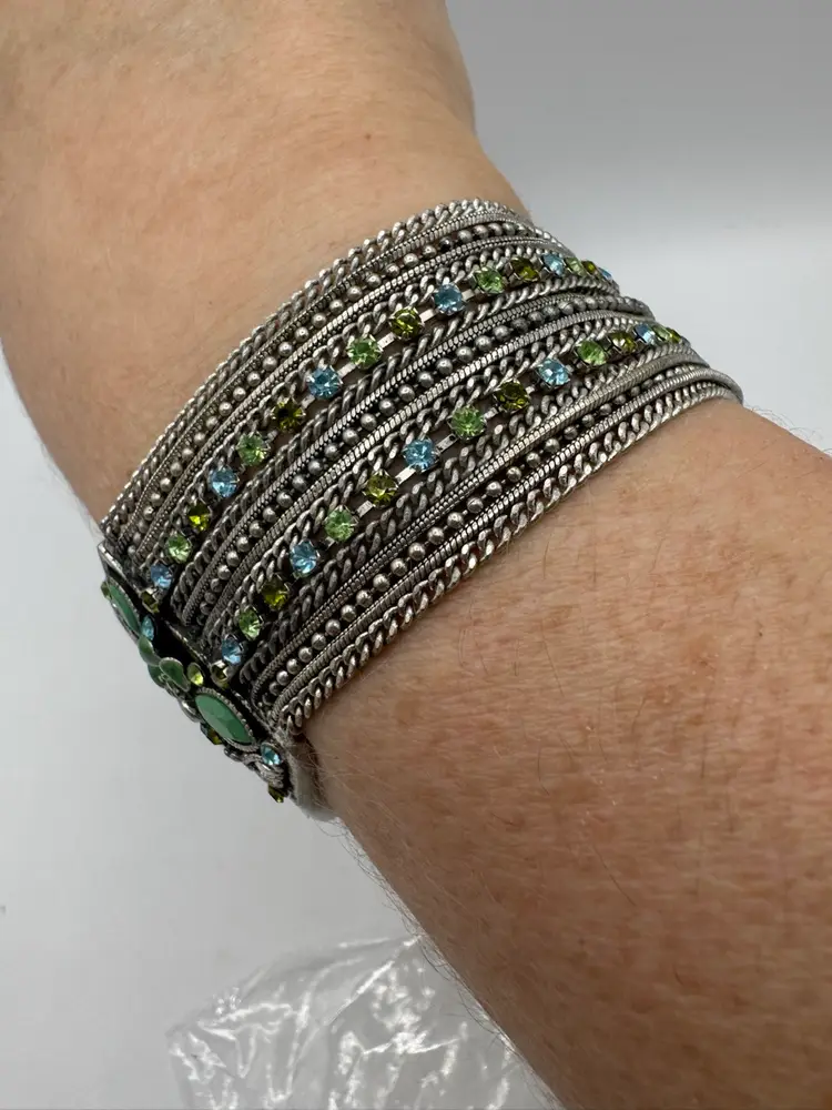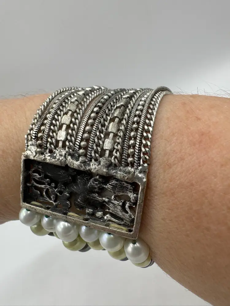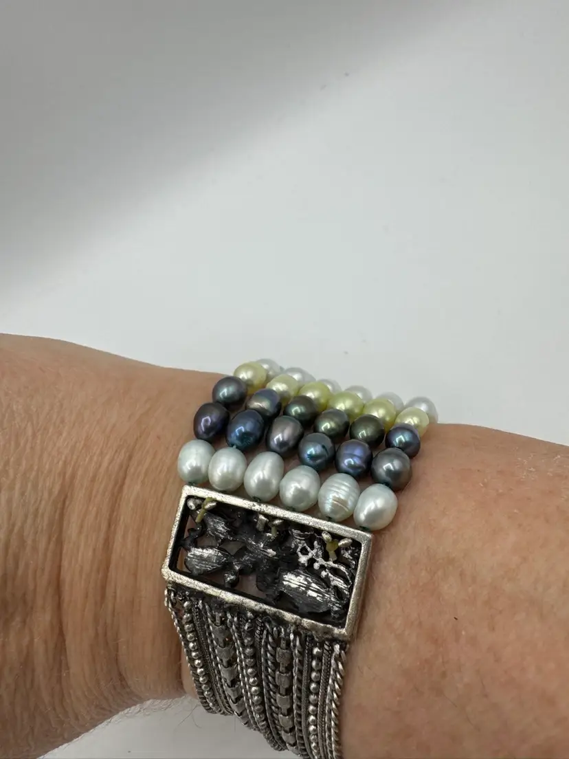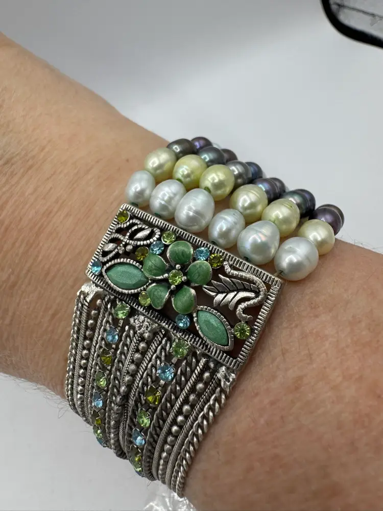 This gorgeous vintage bracelet is absolutely beautiful with multi color dyed coordinated real fresh water pearls. Beautiful silver tone with enamel & sparkling rhinestones and chains. Amazing piece. Excellent condition. Measures 7 1/2”