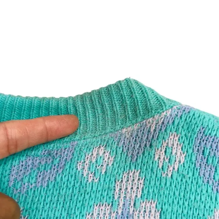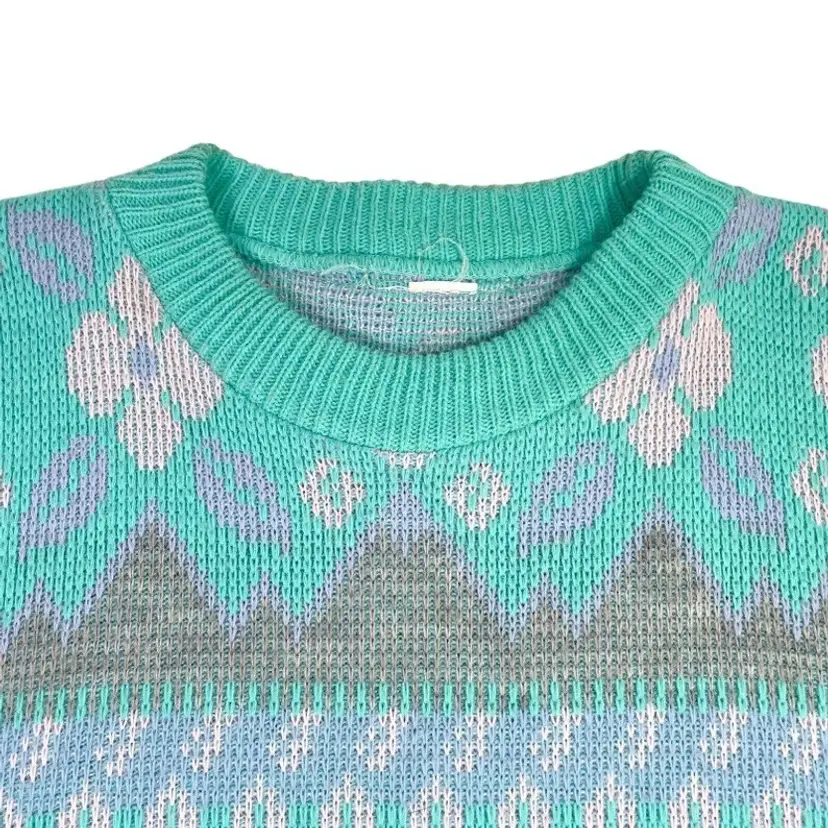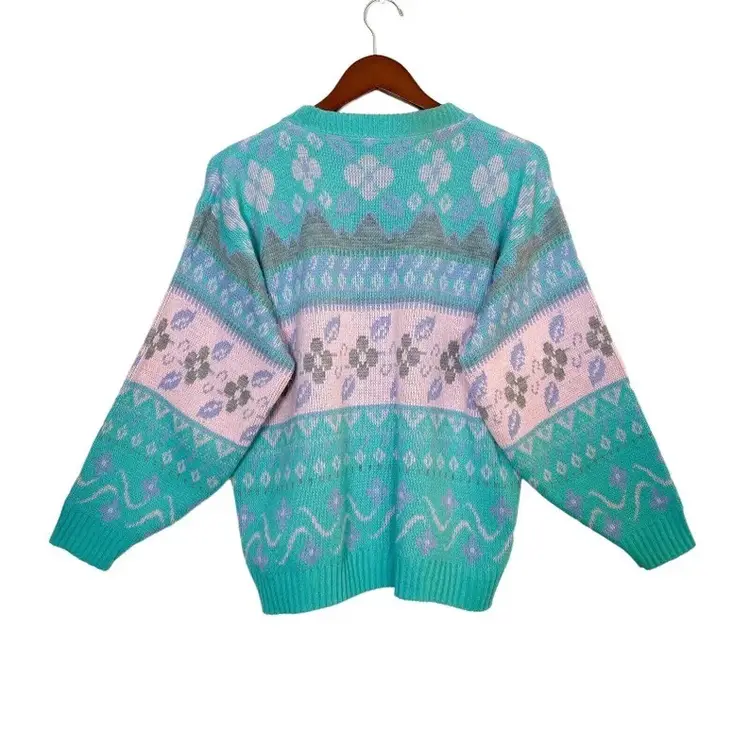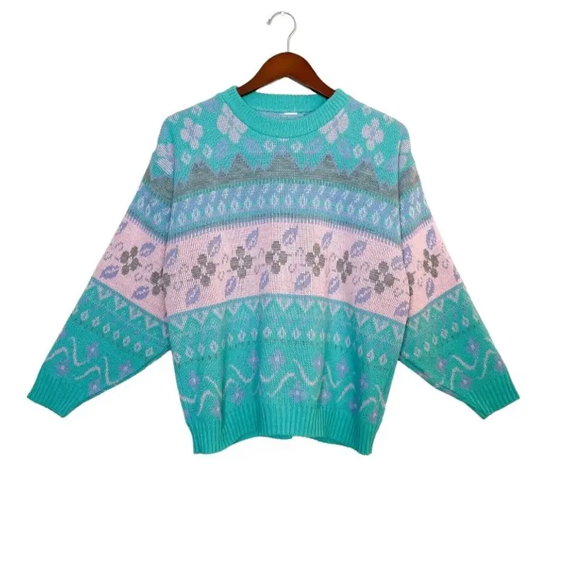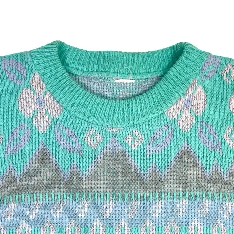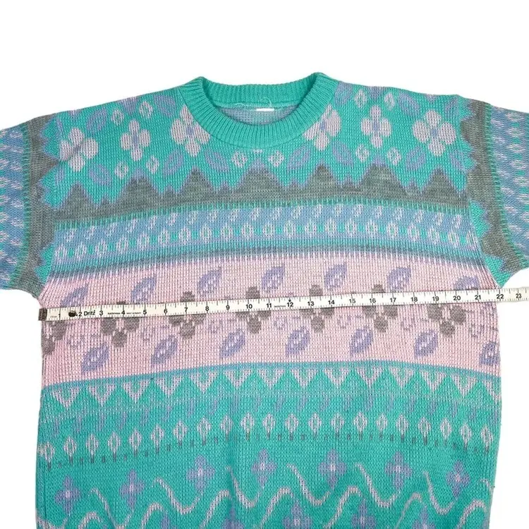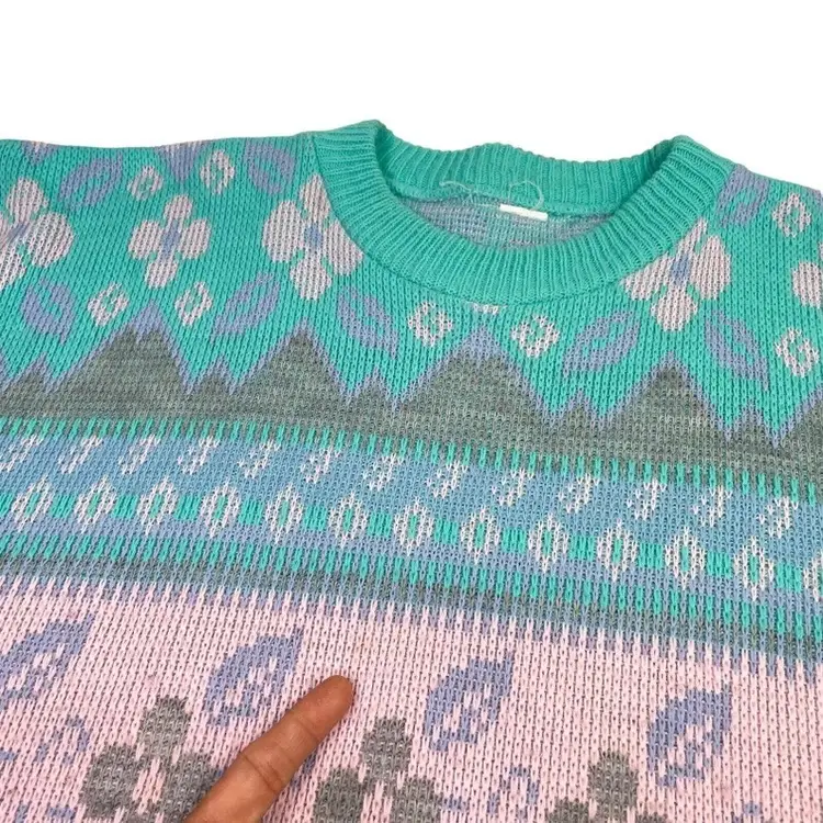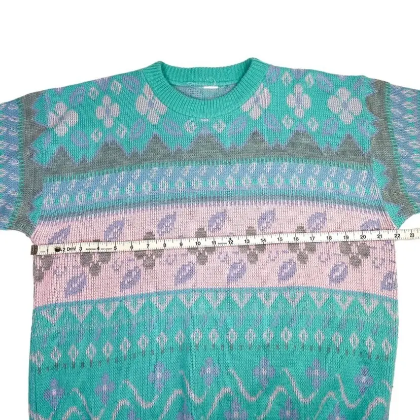 Vintage Striped Floral Knit Sweater- Pink Aqua- NO SIZE, see pictures for measurements. In Good Used Condition. There’s a crusty stain on the back of the collar, see pictures. There are a couple small spots , see pictures.