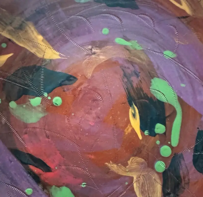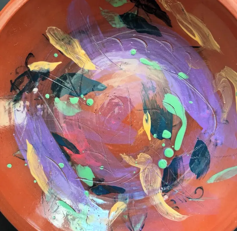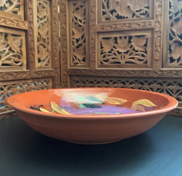 Obsessed! This bowl is a total knockout. Colorful round pottery bowl with abstract details throughout. Use as a statement piece or as a fruit bowl on your counter. Measures 10.75" in diameter and is approximately 2.25" tall. $65.