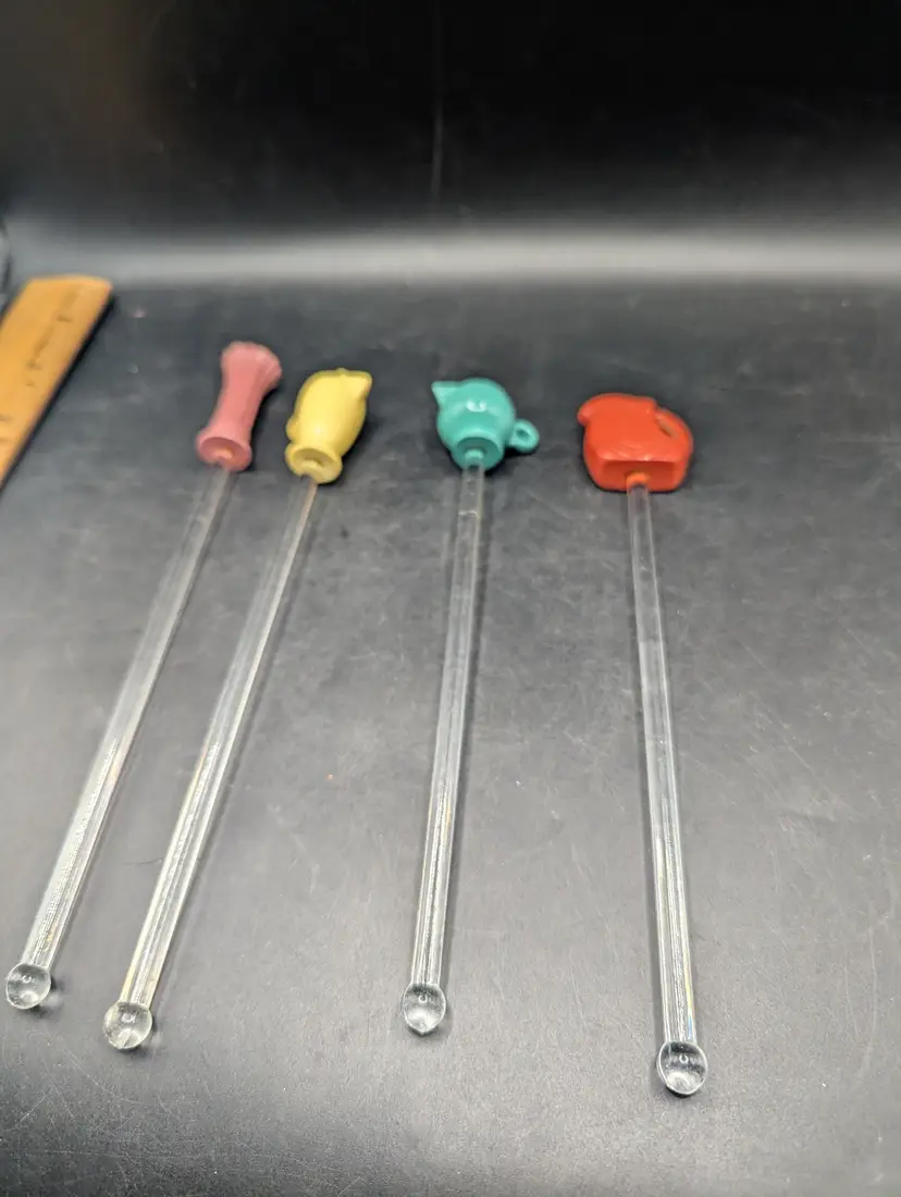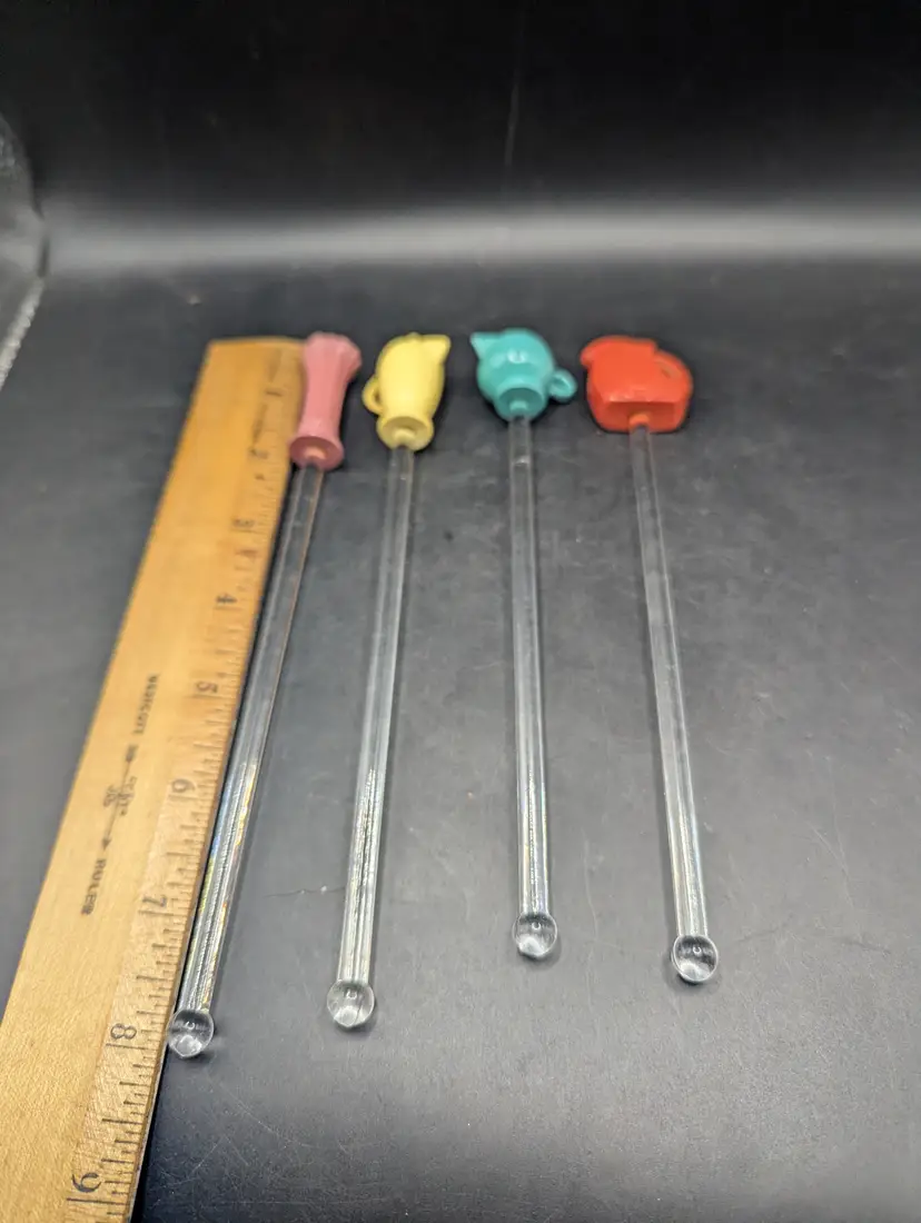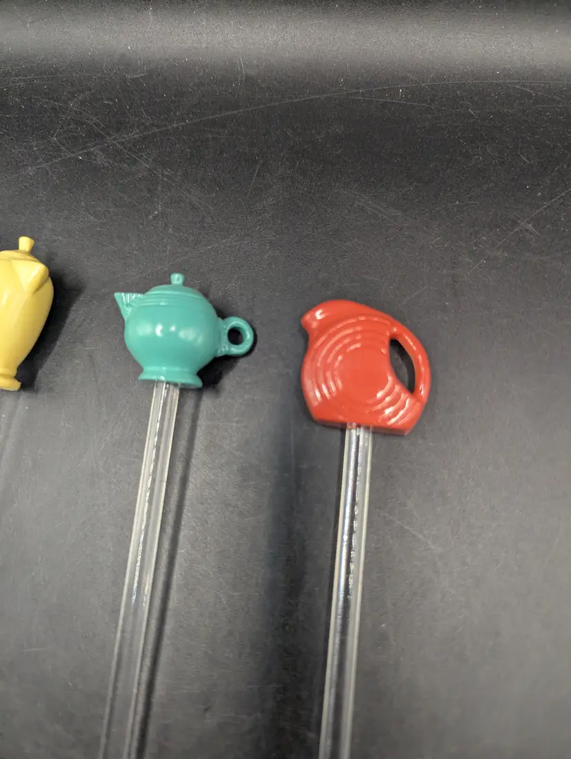 This is a fantastic Vintage Fiestaware Swizzle Sticks No Box. They include Yellow Coffe Pot, Pink Vase, Green Teapot and Orange Pitcher. Please see all pictures for condition and measurements.