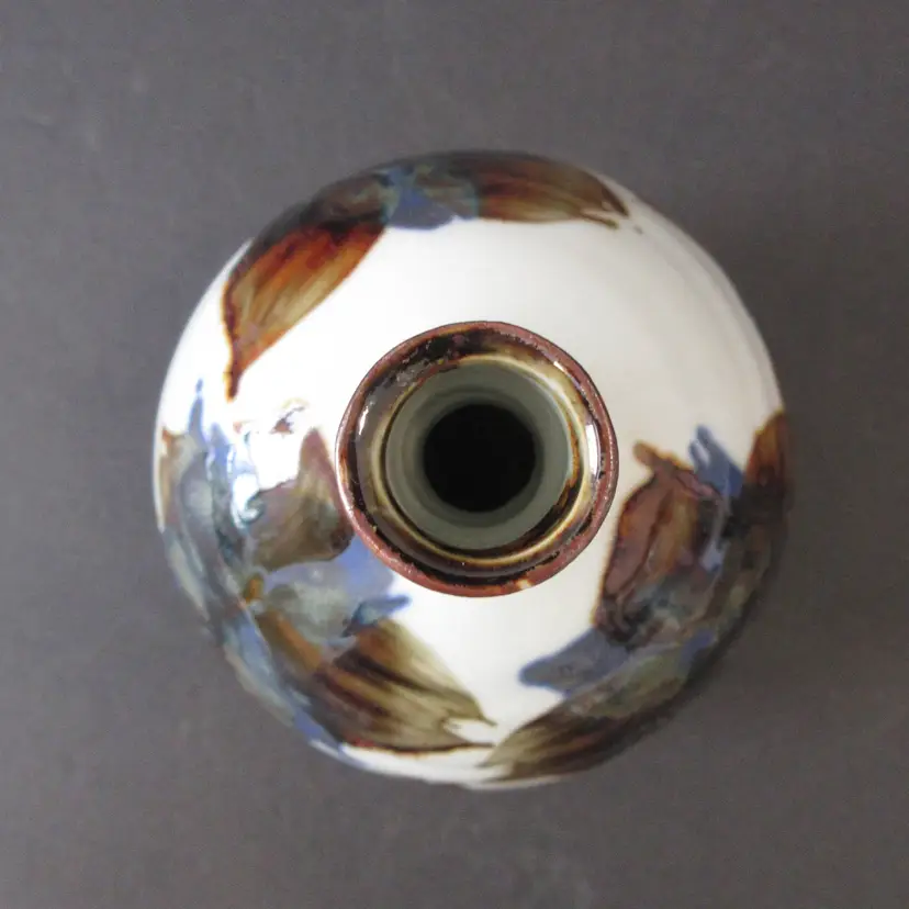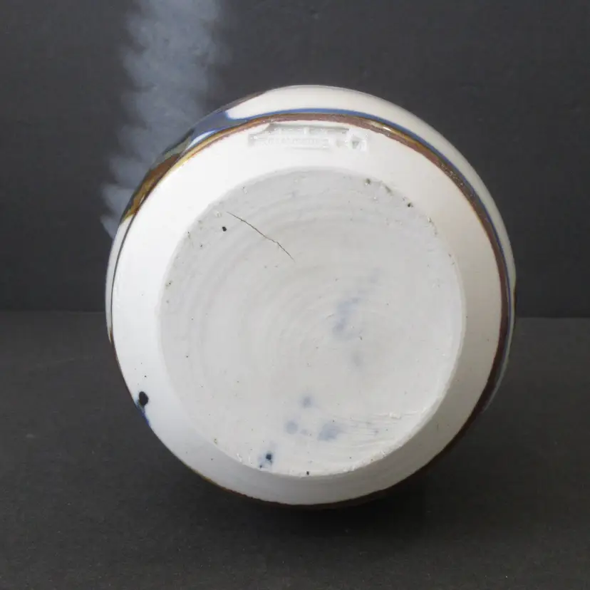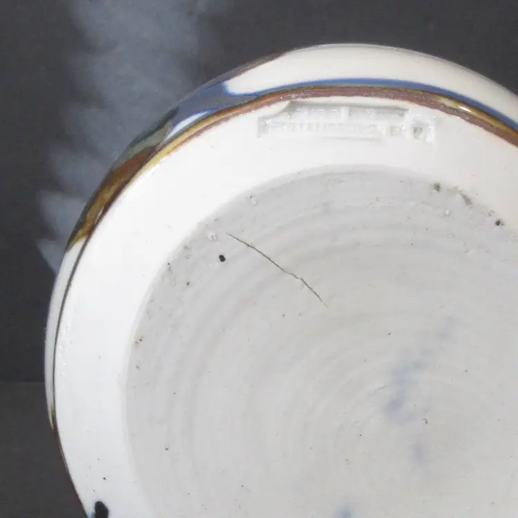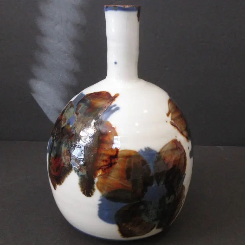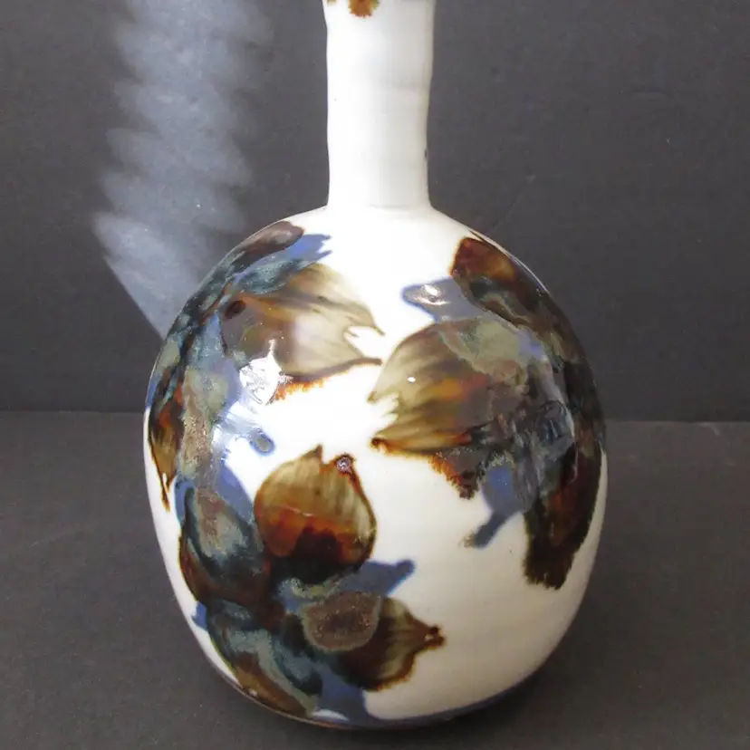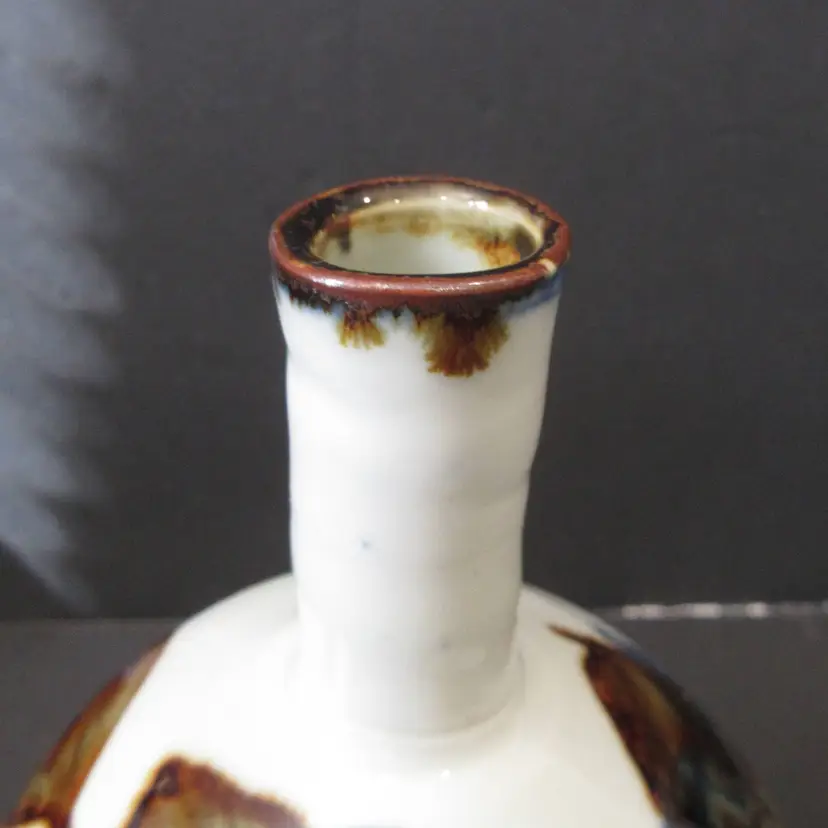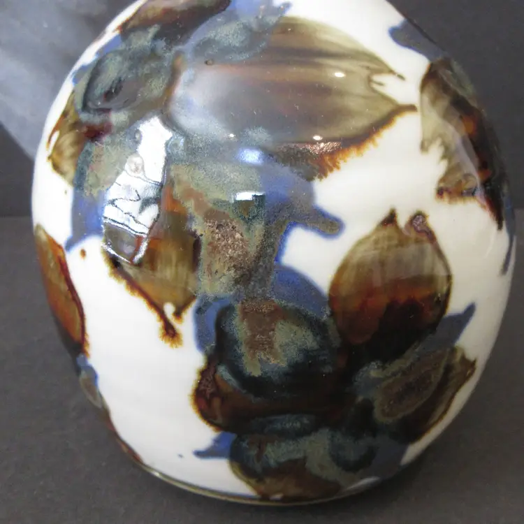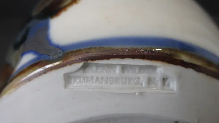 This is an AMAZING VINTAGE studio art pottery bottle bud vase. The vase was made in the 1970s by Glenn Wilder in Trumansburg, NY. It is an AMAZING piece of studio art pottery. It's made of a white ceramic clay and is glazed in 1970s earth tones of brown, white and blue. The rim is very narrow, and could only fit a flower or two. It is about 7 inches tall and 4.5 inches in diameter (at the widest point). It is in EXCELLENT CONDITION! There are no chips, cracks, scratches, discoloration or repairs. There is a small kiln crack on the base from the firing process (see last photo), but it doesn't go all the way through; the vase holds water and doesn't leak.
