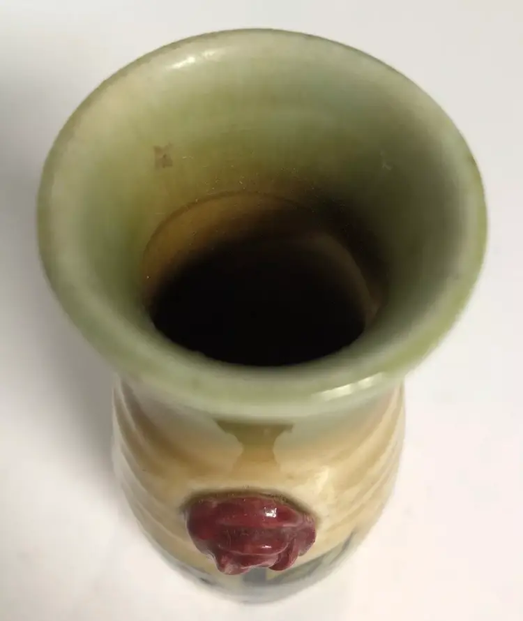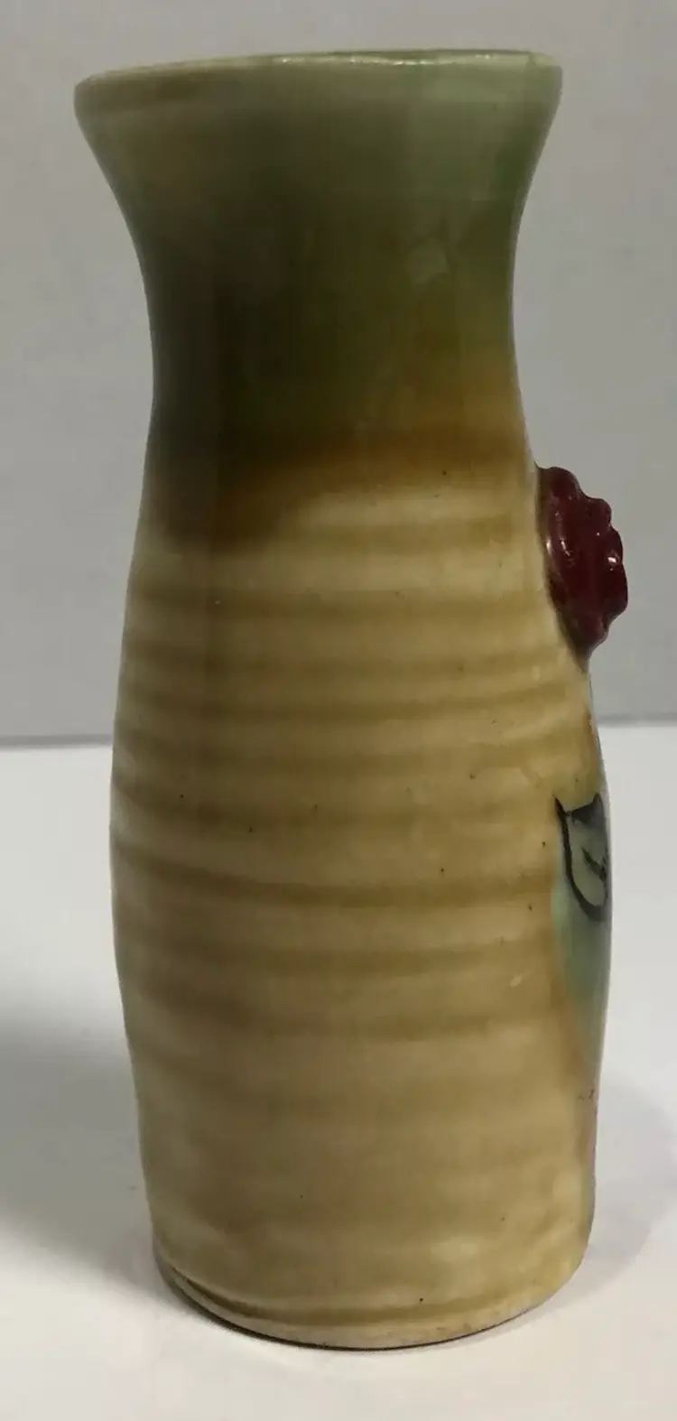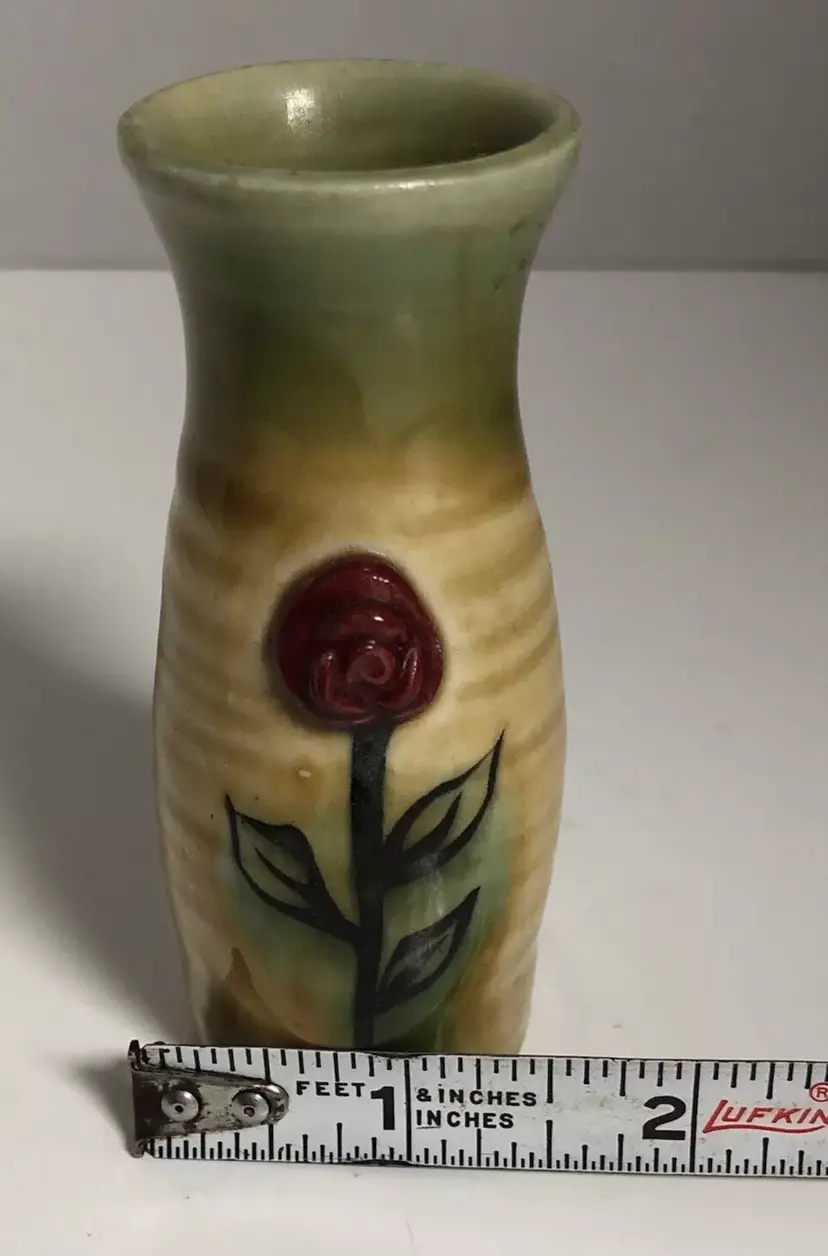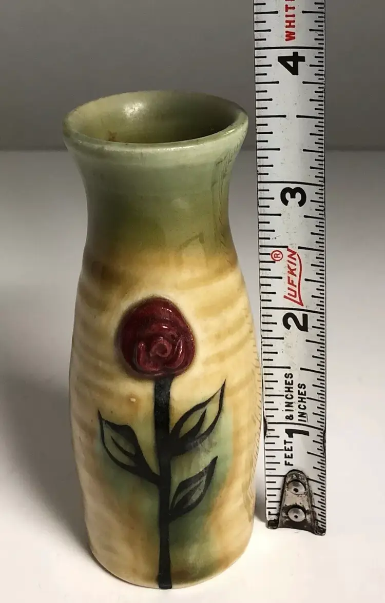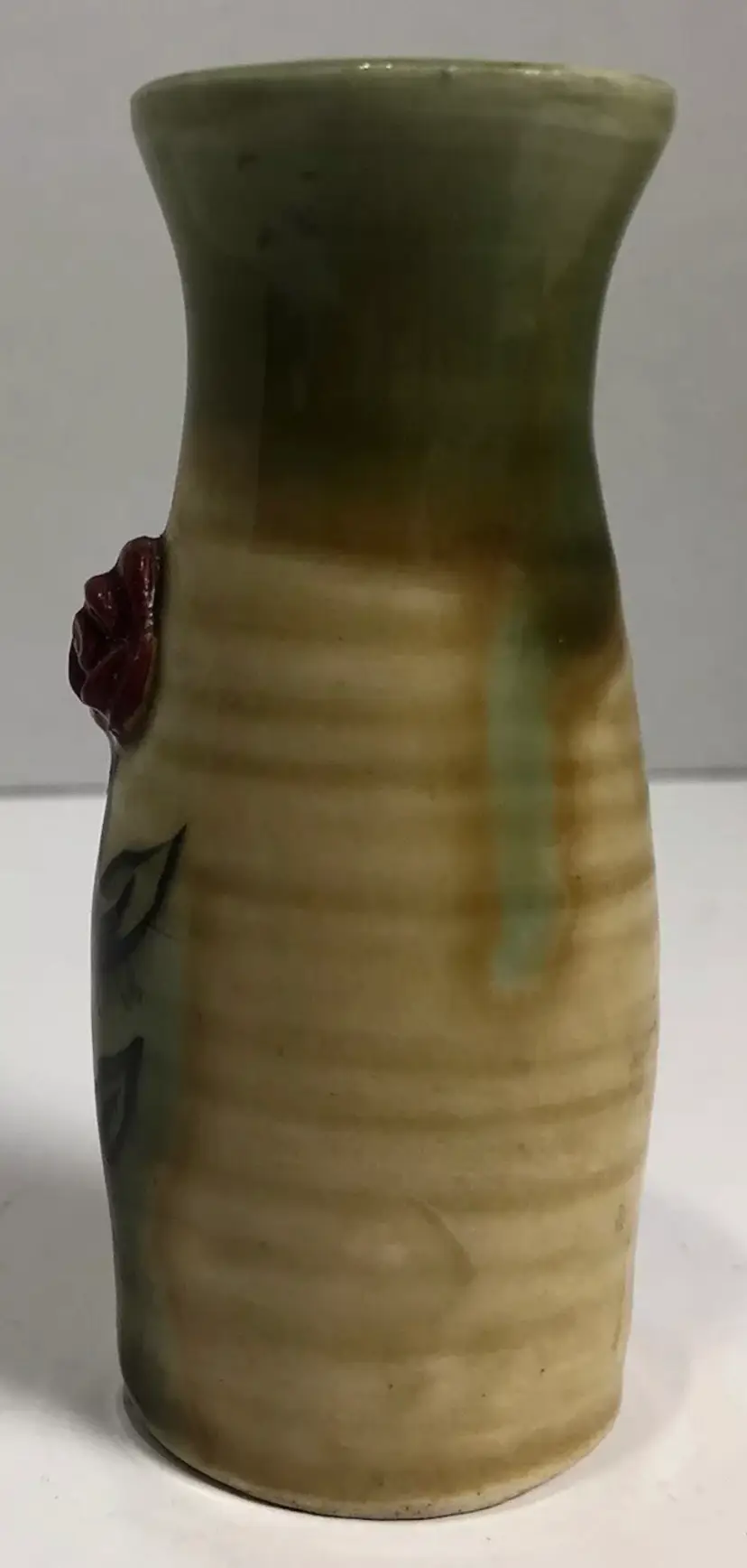 Vintage Studio Art Pottery Mini Rose Vase. This is in good condition with no chips or cracks. The glaze is glossy and the coloring is very beautiful, the rose especially with its deep red color. It’s stamped on the bottom with the makers mark. It’s a one-of-a-kind piece and a great addition to any collection.