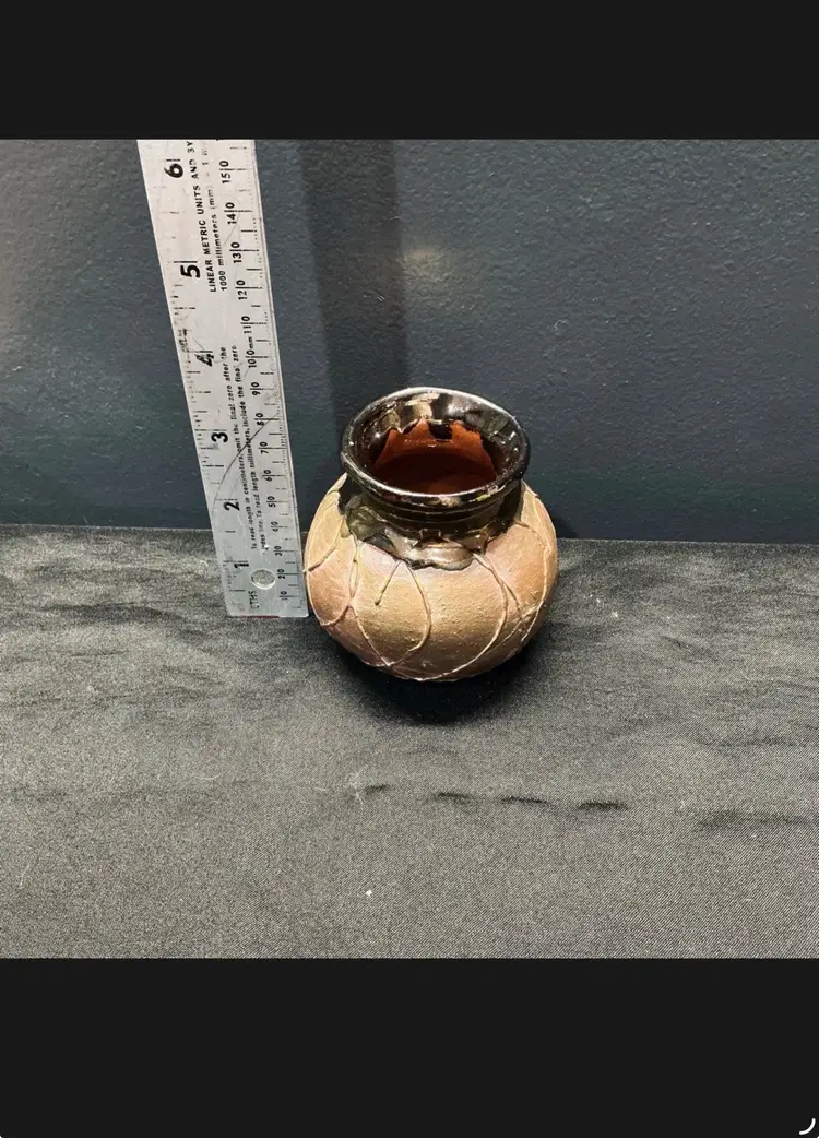 Charming vintage studio pottery miniature vase, standing just under 4” tall. This handmade piece features a bulbous form with earthy brown tones, highlighted by a textured slip design encircling the body. The rim is finished with a glossy dark glaze that contrasts beautifully with the matte body. The interior is also glazed, making it both decorative and functional for small floral arrangements or as a standalone display piece. This piece captures the rustic beauty of handcrafted pottery, with subtle imperfections that add to its character and authenticity. Perfect for collectors of studio art pottery, rustic décor lovers, or anyone seeking a unique handmade accent. Height: approx. 3.75” Width: approx. 3.5” Condition: Excellent vintage condition with no chips or cracks. Bottom shows expected wear from age.