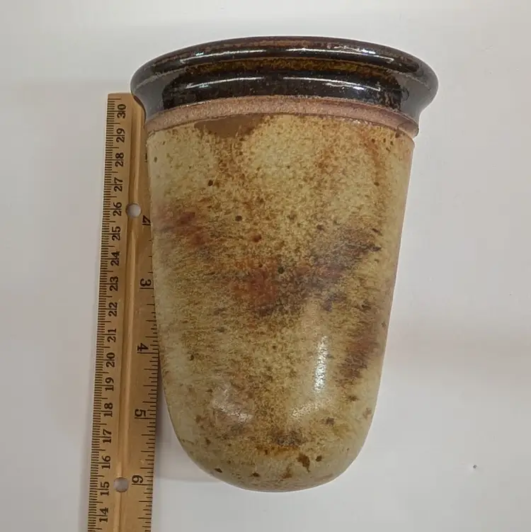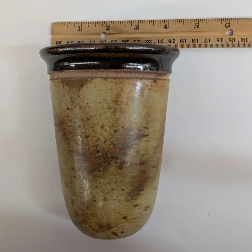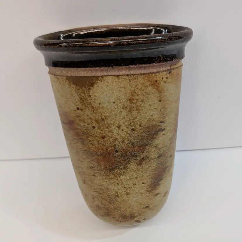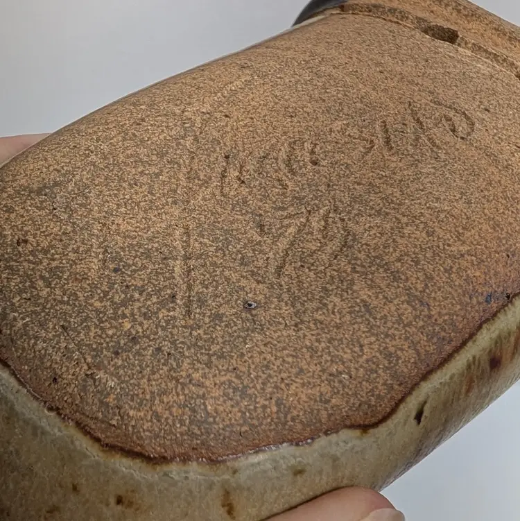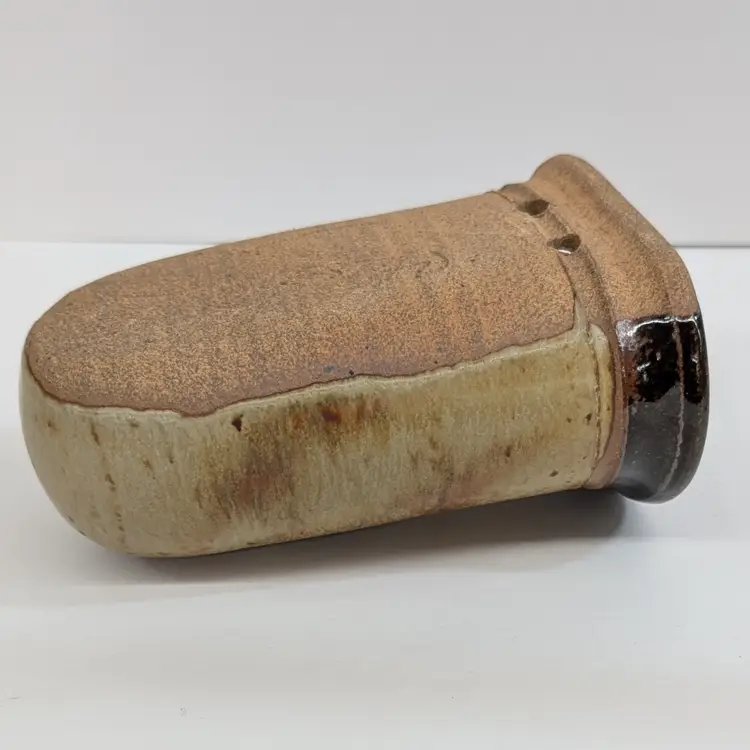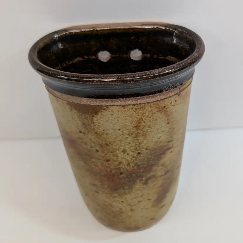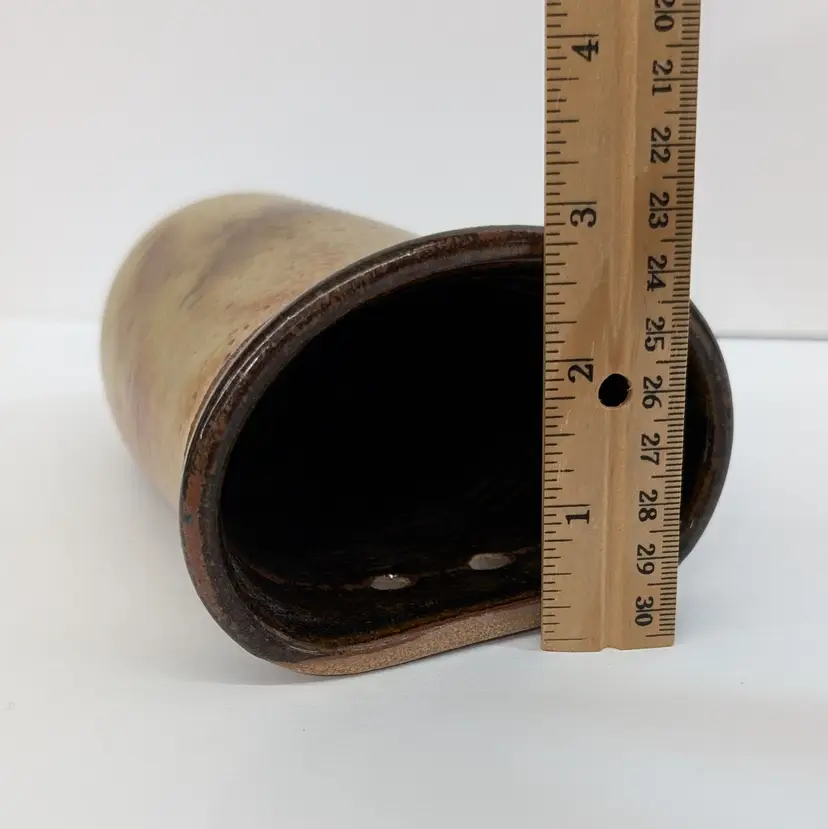 The glaze on this wall pocket is so natural looking. It was made by Ren Fuglestad in 1979. It is glazed on the inside and would be very usable as a wall vase and has two hole for attaching a hanger. In nice, used condition. Measurements ~ 4.25 x 6 x 2.75"